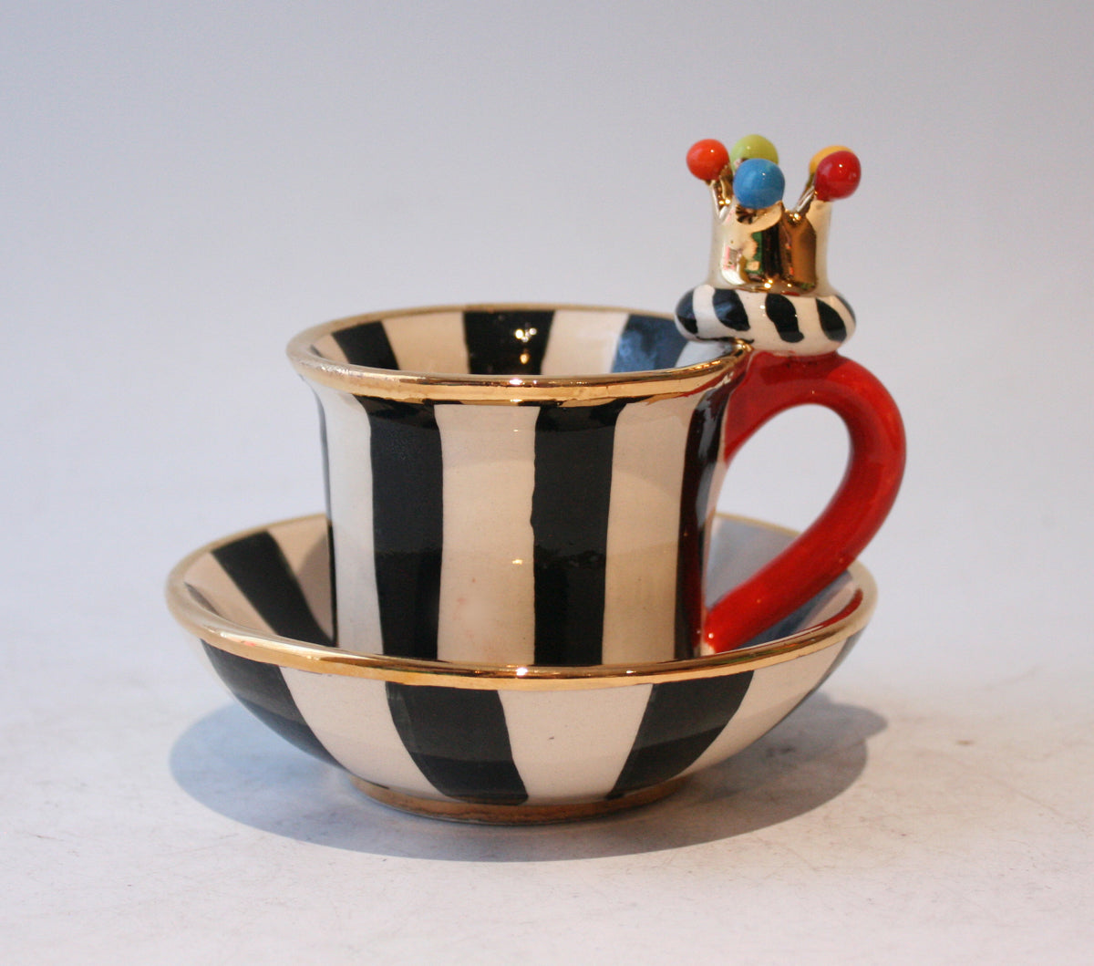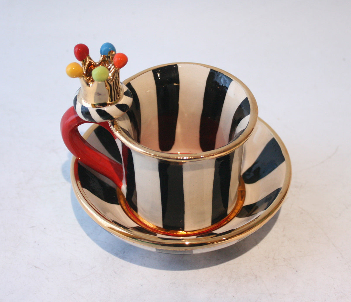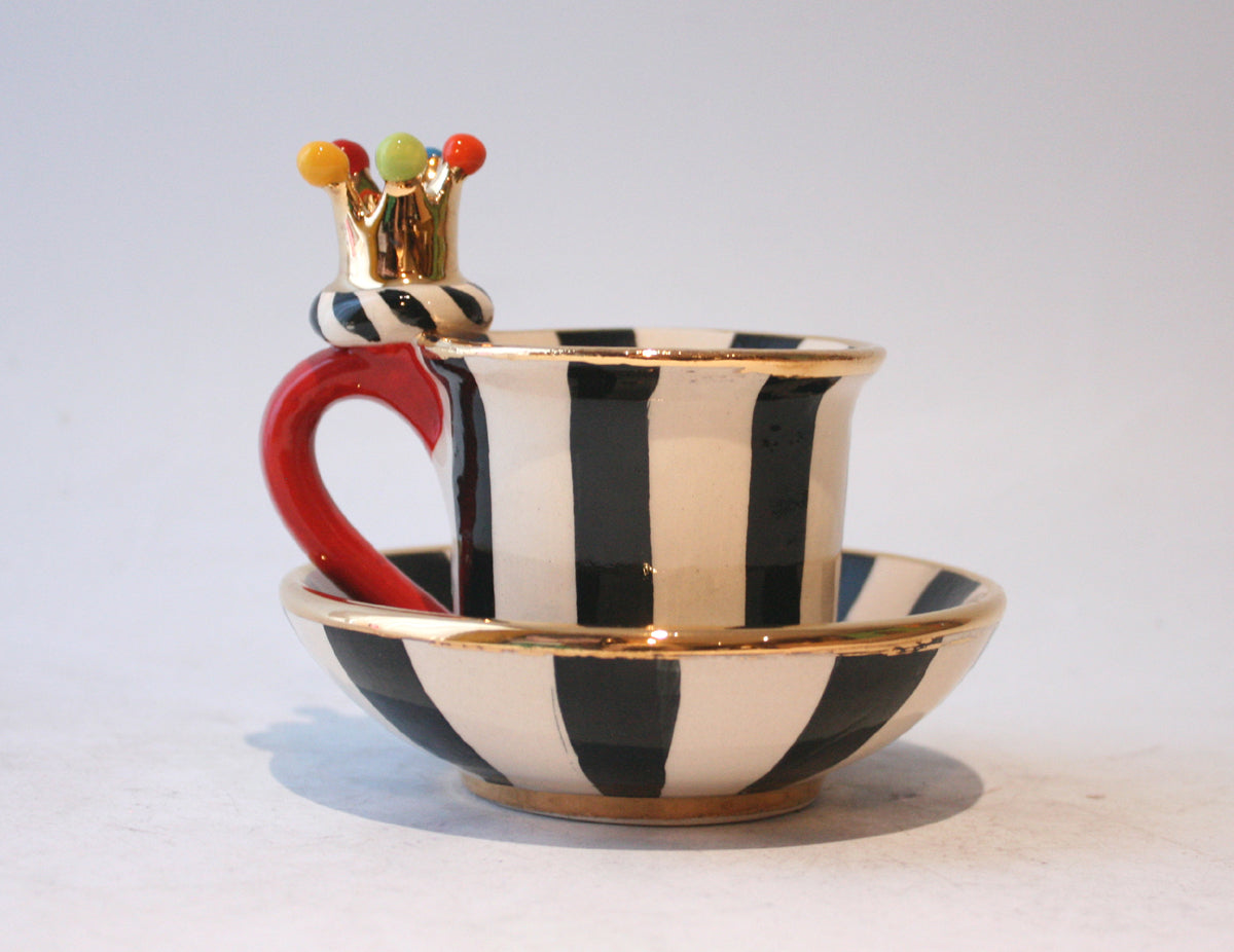 This little Demi Tasse and Saucer is the perfect size for your morning espresso! It stands around 3 inches tall and also features a little ceramic crown atop its handle...The design is Black Stripes which contrast wonderfully with its eye-catching red handle