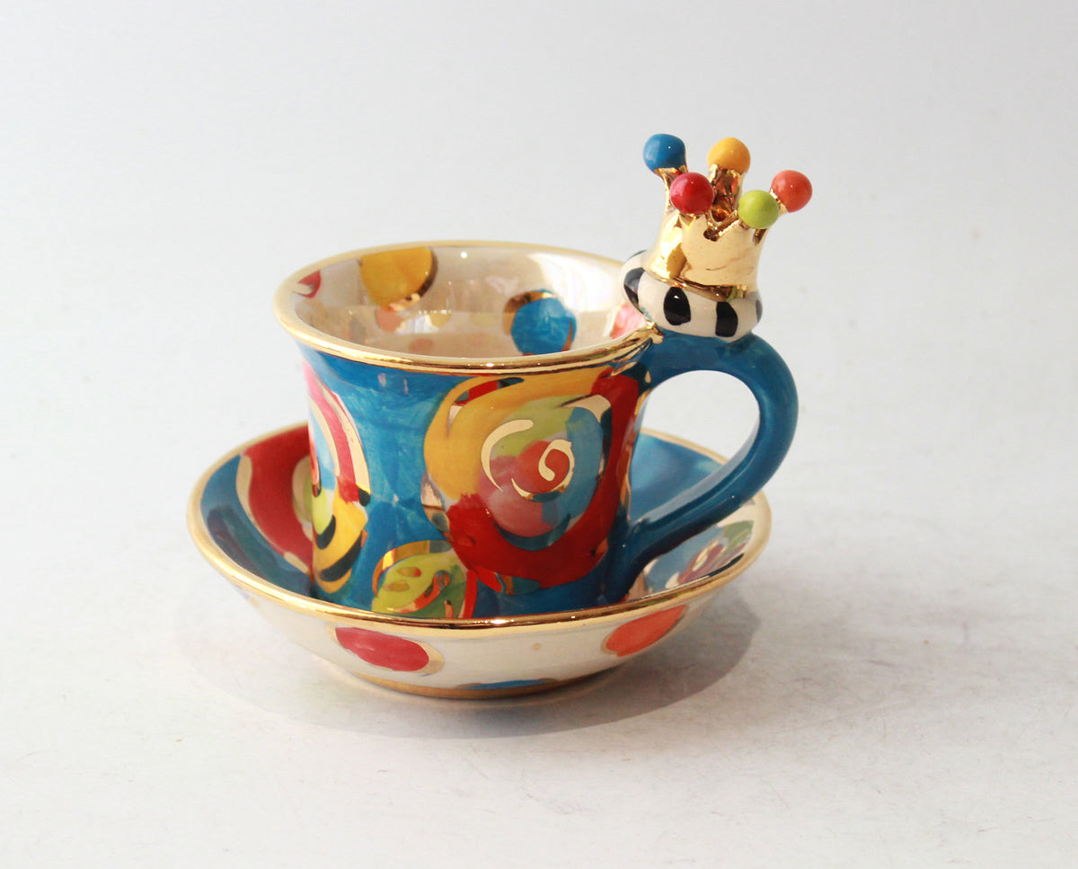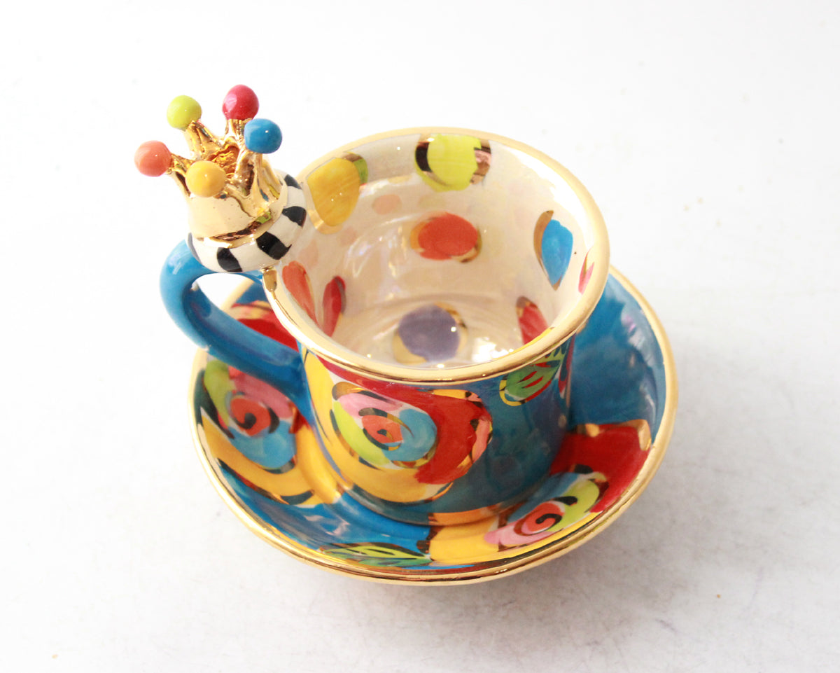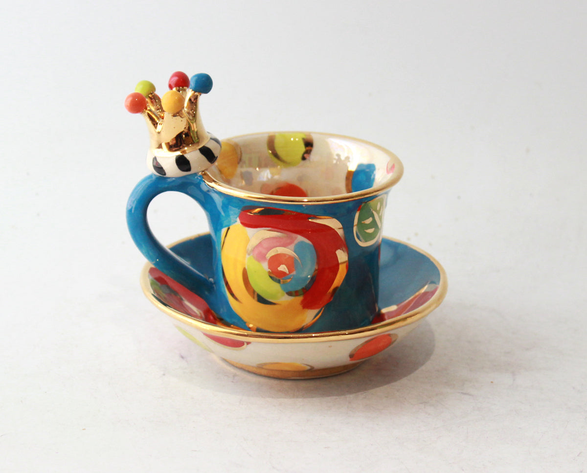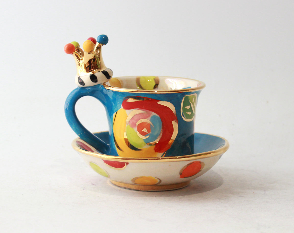 This little Demi Tasse and Saucer is the perfect size for your morning espresso! It stands around 3 inches tall and features a little ceramic 24 carat gold crown atop its handle...it is painted in "Gold New Rose" on a background of deep blue, with contrasting "Coloured Dot" design inside the cup and on the bottom of the saucer
