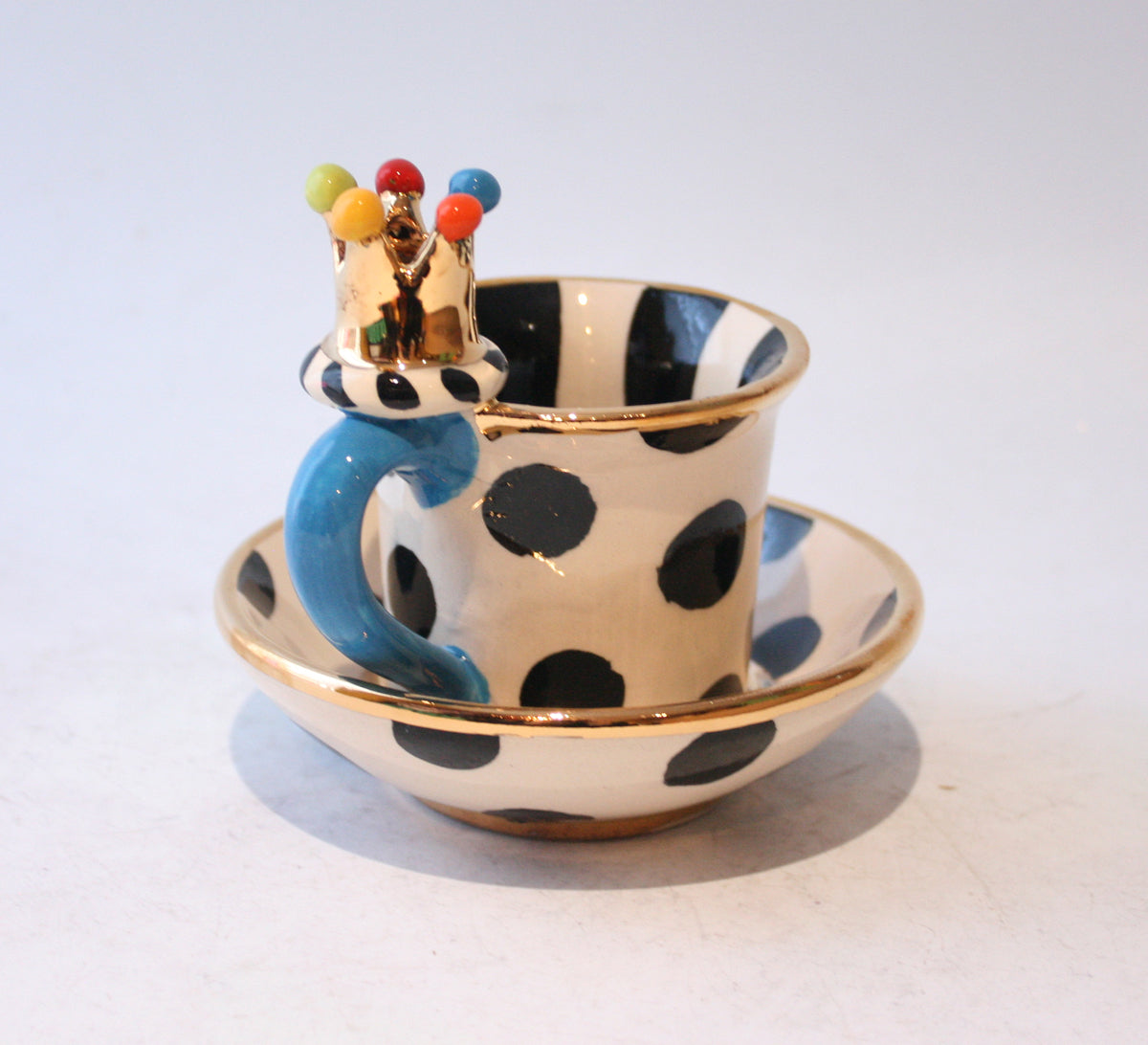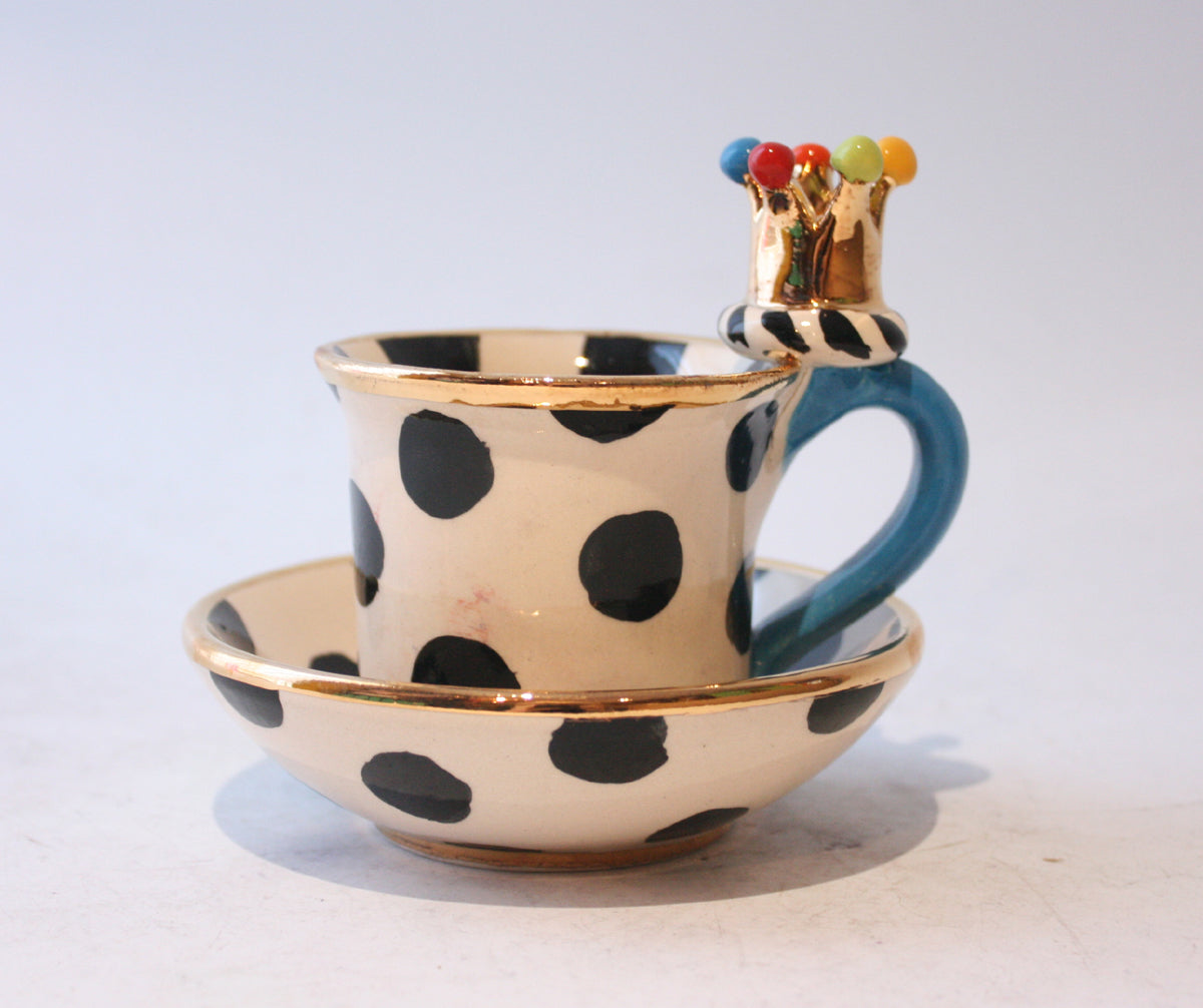 This little Demi Tasse and Saucer is the perfect size for your morning espresso! It stands around 3 inches tall and also features a little ceramic crown atop its handle...The design is Black Polka Dots on the outside with Black Stripes inside, which contrast wonderfully with its eye-catching blue handle