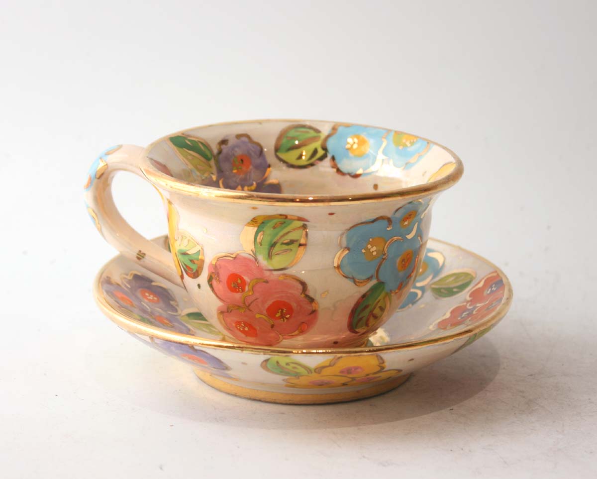 A classic tea cup and saucer...the shape that Mary Rose creates is actually more or less the same as the ones her grandmother used to use! Standing 9cm high, this one is painted in a new for 2020 design "Petit Fleur", which features colourful blooms of flowers that sit on a beautiful iridescent background....