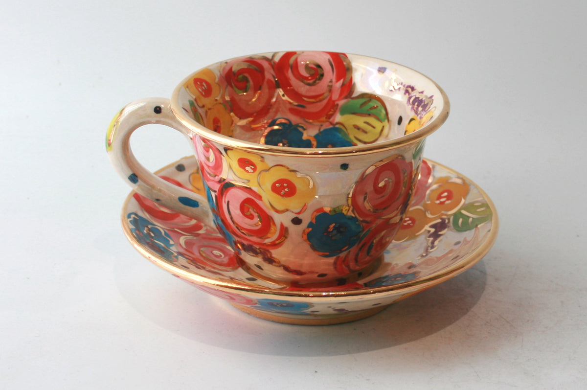 Mary Rose's Cups and Saucers have a height of around 9cm, and are the perfect receptacle for your favourite beverage...they actually have more or less the same shape as the ones her grandmother used to use! This one is painted in a classic design "Vintage Floral", with accents of 24 carat gold..