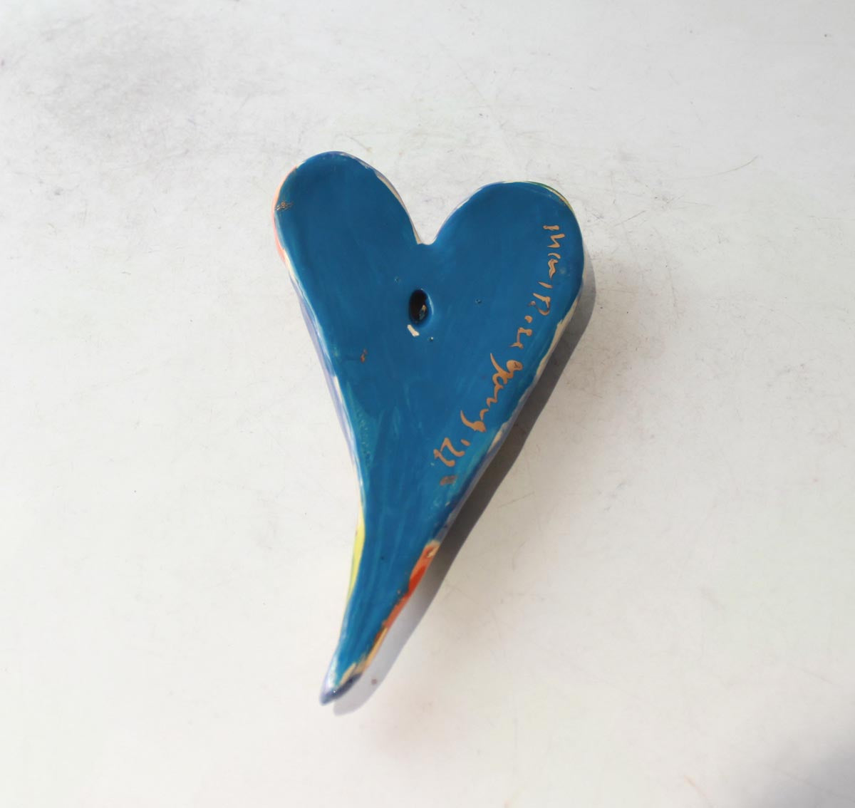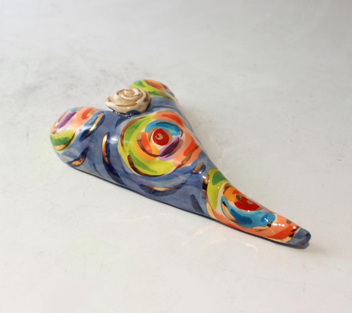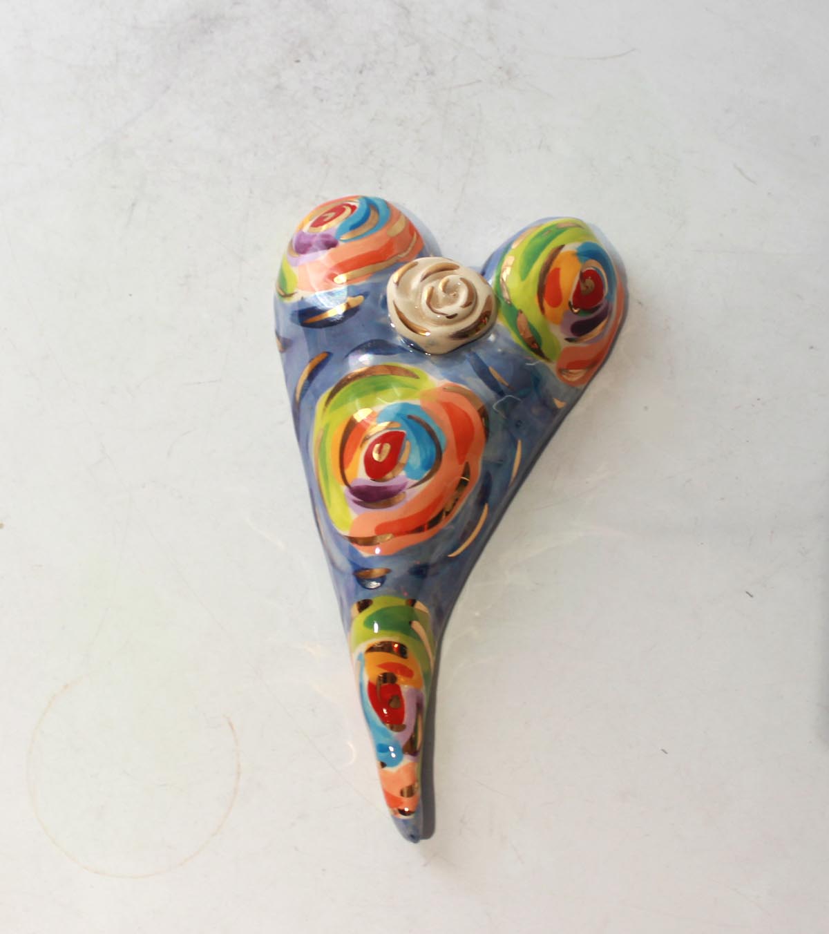 Mary Rose's Curly Wall Hanging Hearts measure around 7 inches top to bottom, and make the perfect fillers for any wall but also fantastic paperweights! This one is painted in "Swirls" with accents of 24 carat gold and an intricate rose in the centre...they also have an angled hole on the back so they can be hung on a hook or nail