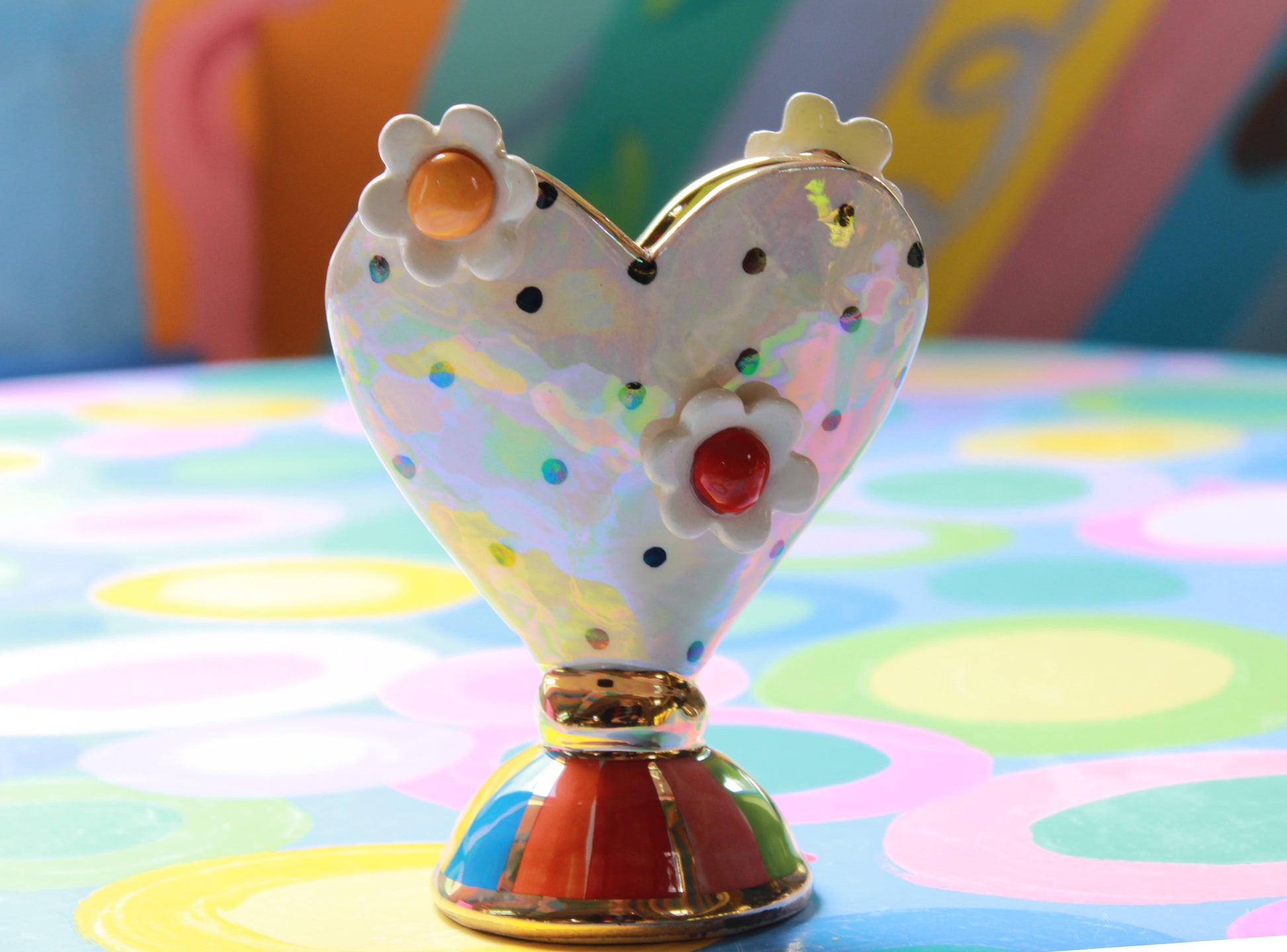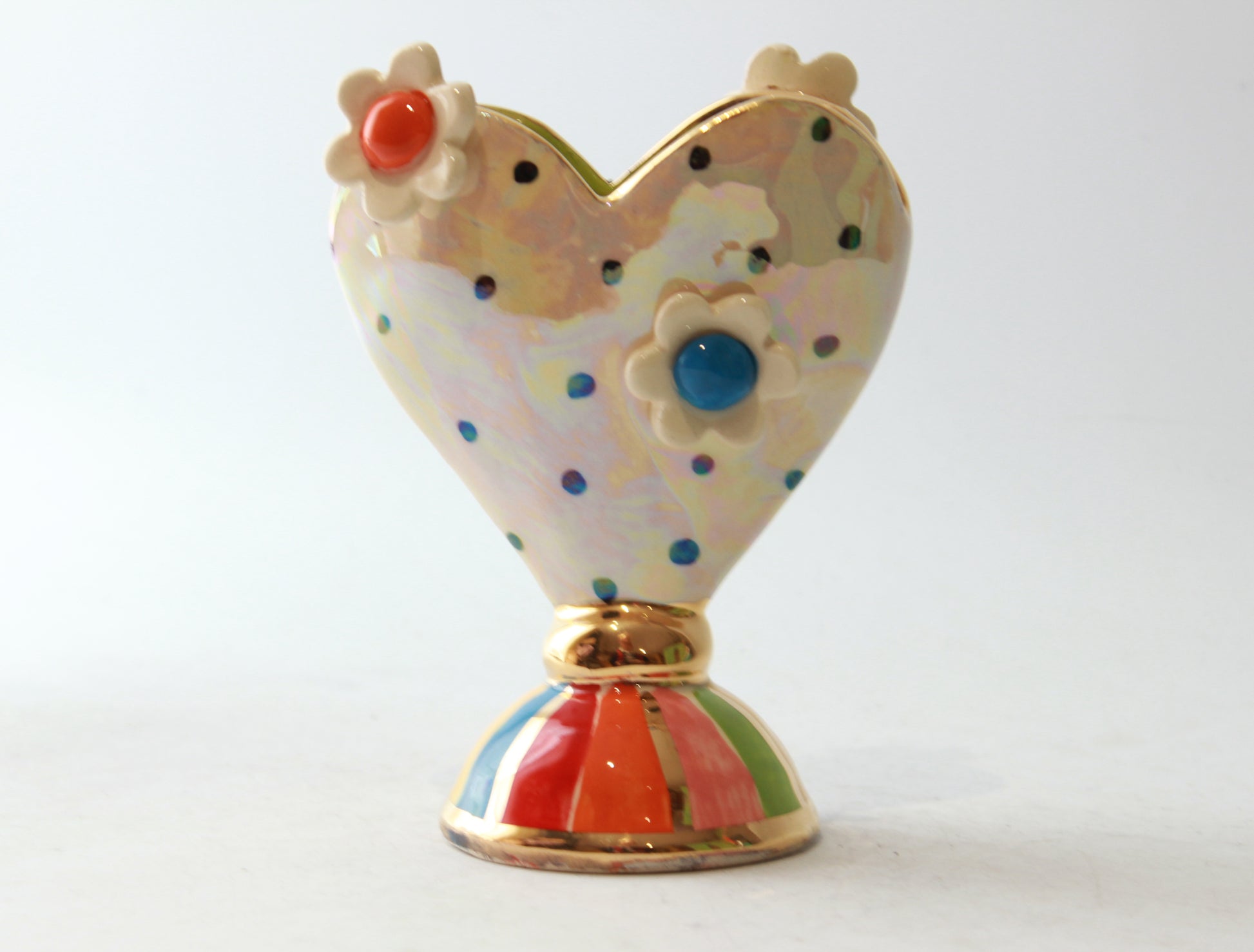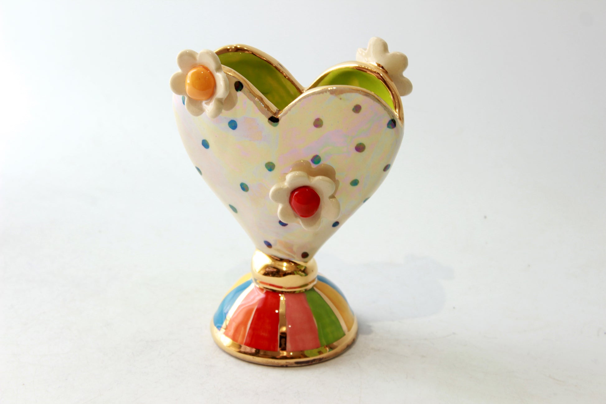 Mary Rose's Baby Heart Vase is almost 5 inches tall and is a thing of eye catching wonder when casually left on a mantlepiece in your home. On this version Mary Rose has scattered the surface with her hand fashioned daisies in a variety of unlikely bright colours.