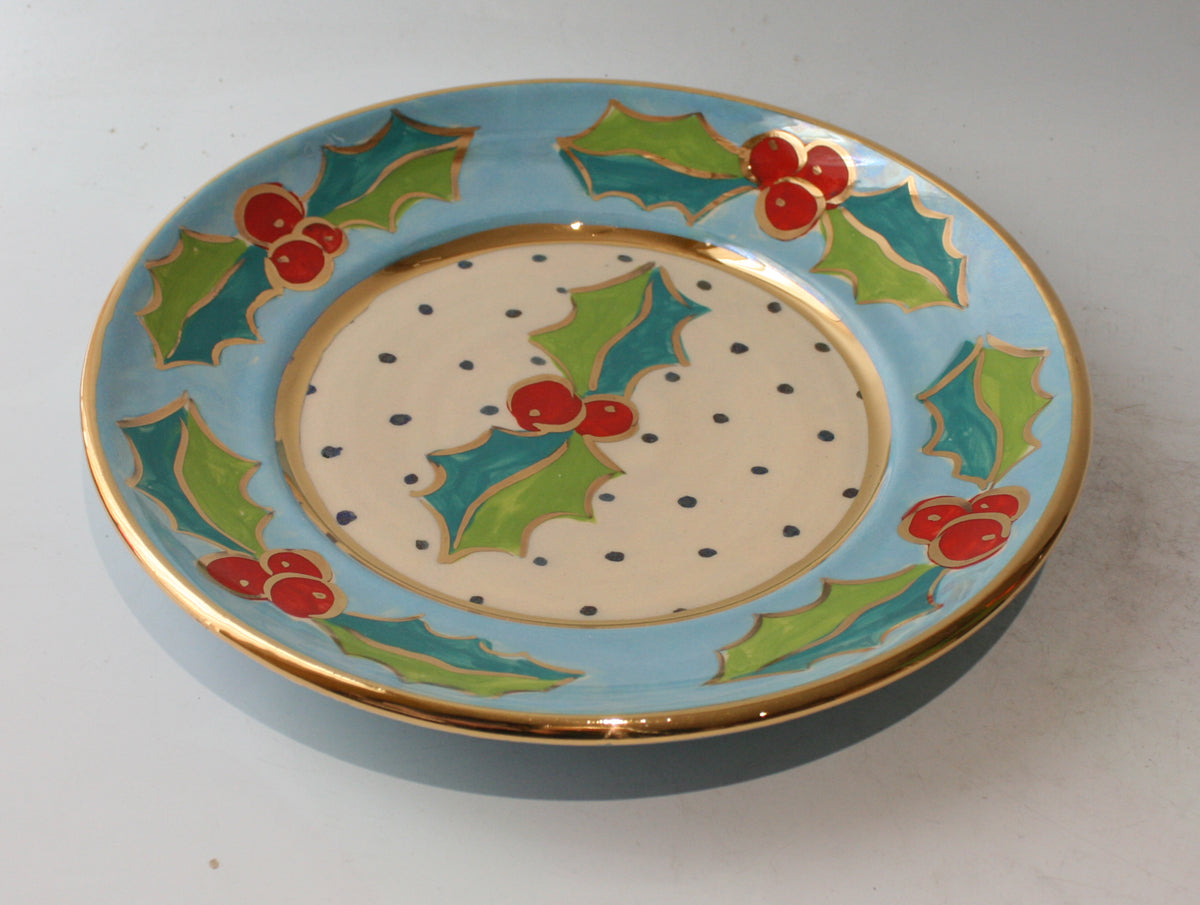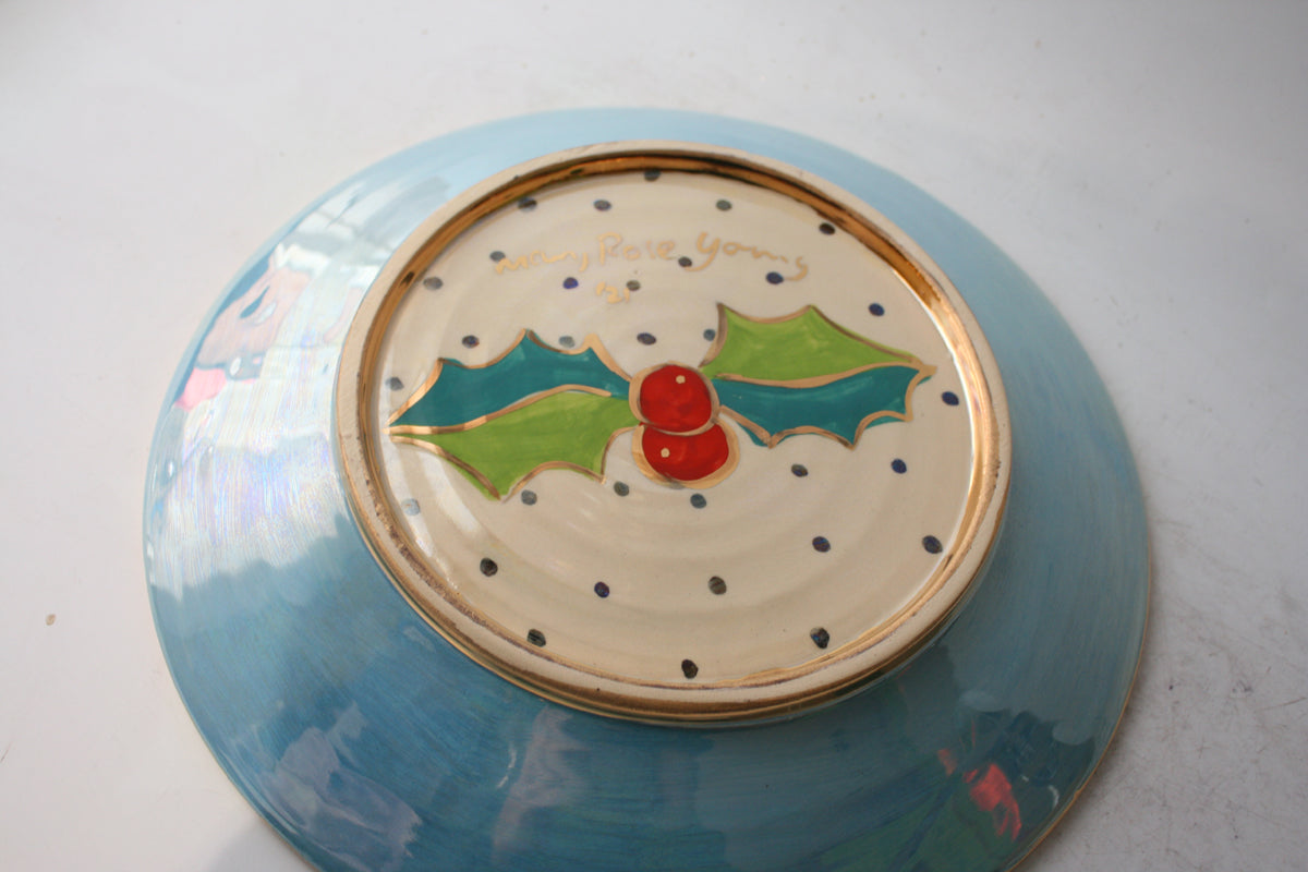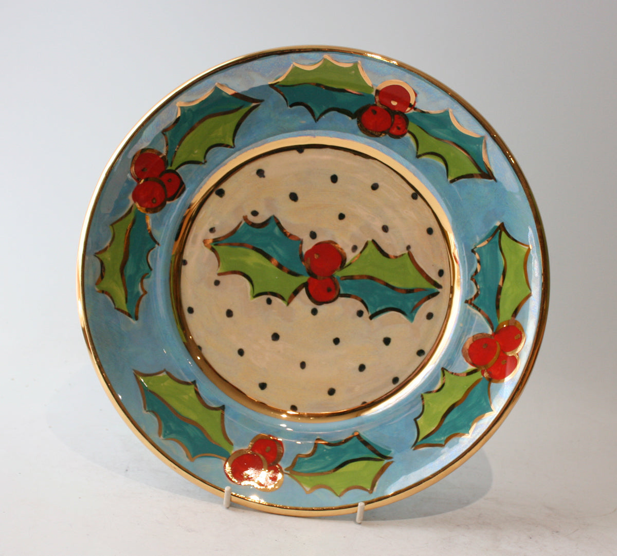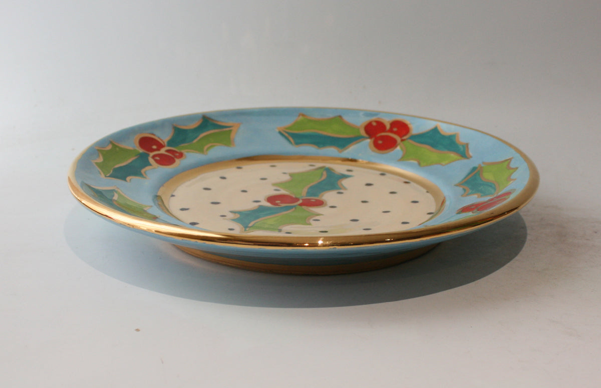 Mary Rose's Dinner Plates measure around 11 inches in diameter and are a wonderful canvas for her vivid designs. This one displays a variation upon the "Holly" design, which features a bright iridescent blue around the rim...The plate is completed with accents of 24 carat gold and if you so wish can form part of a beautiful set!