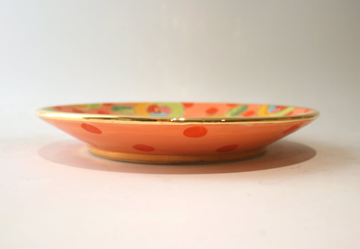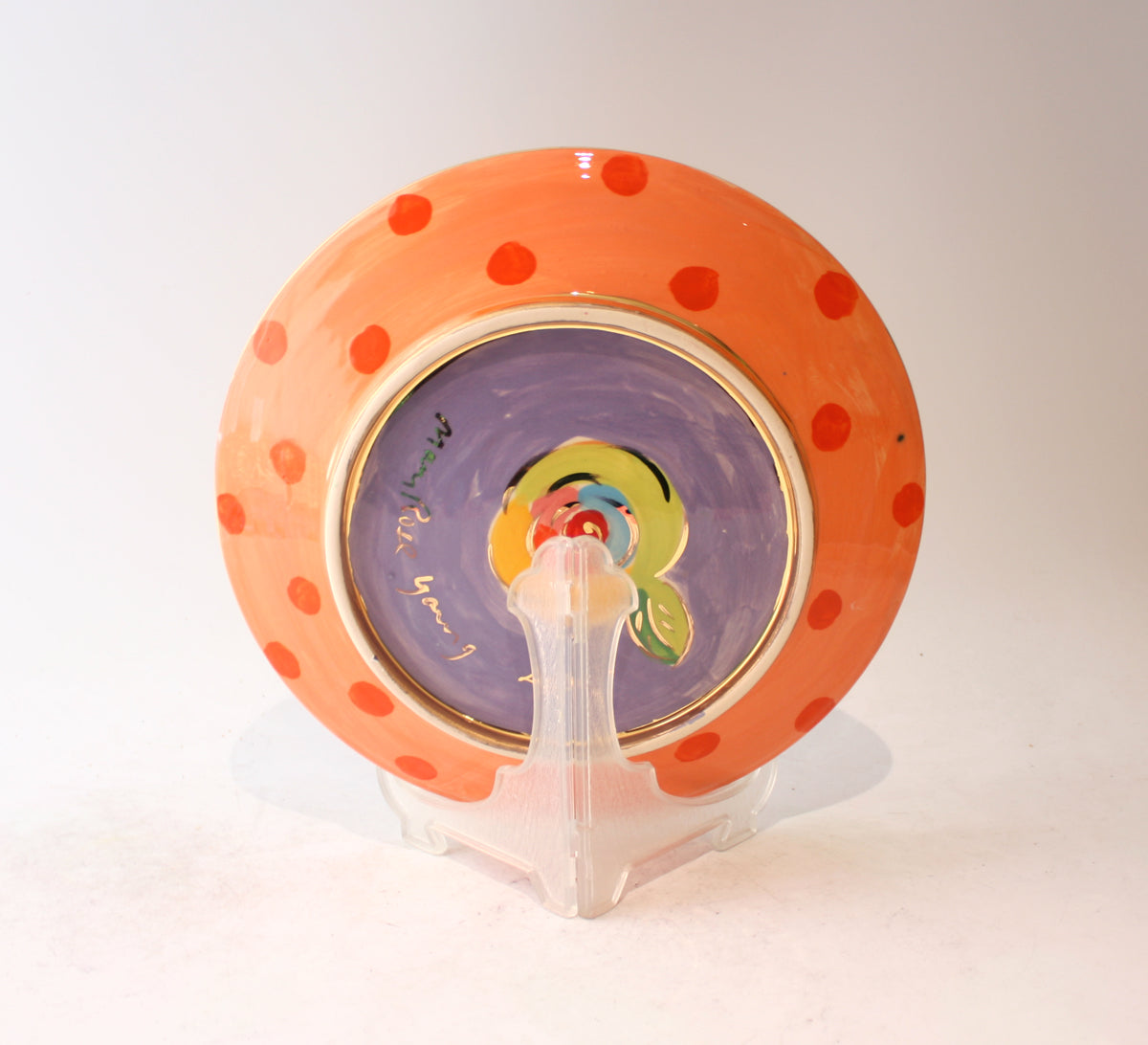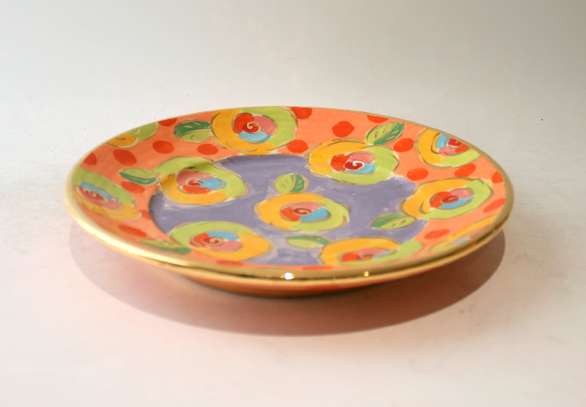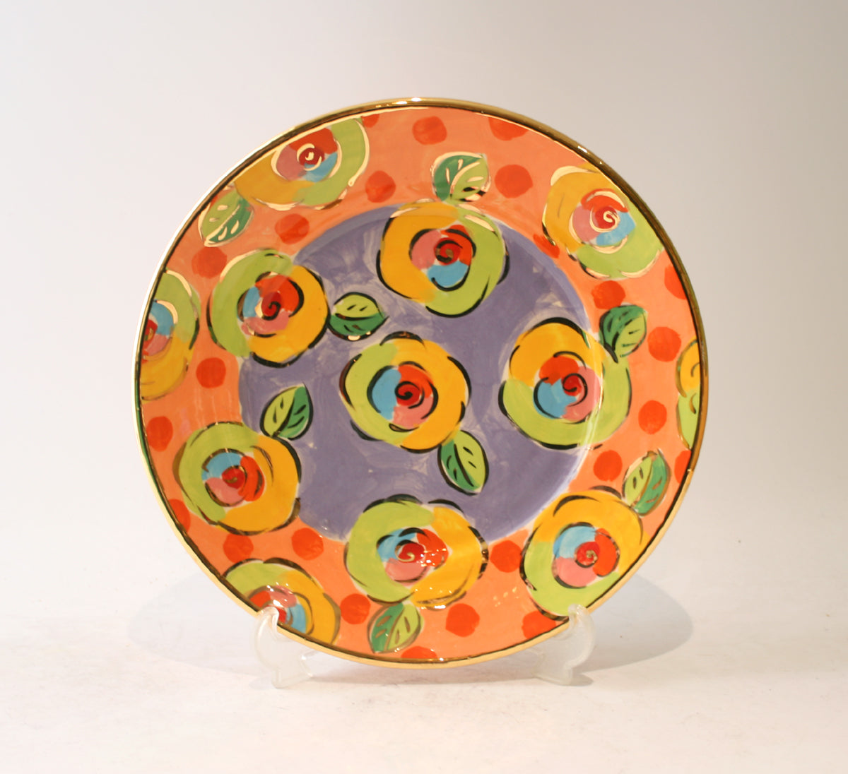 Mary Rose's Dinner Plates measure around 11 inches in diameter and make wonderful canvases for her unique designs...this one is painted in Roses Purple with Dotty Orange on its outside rim and is eminently use-able, however it is best that it only experiences the dishwasher on occasion and it is not suitable for heating in the oven!