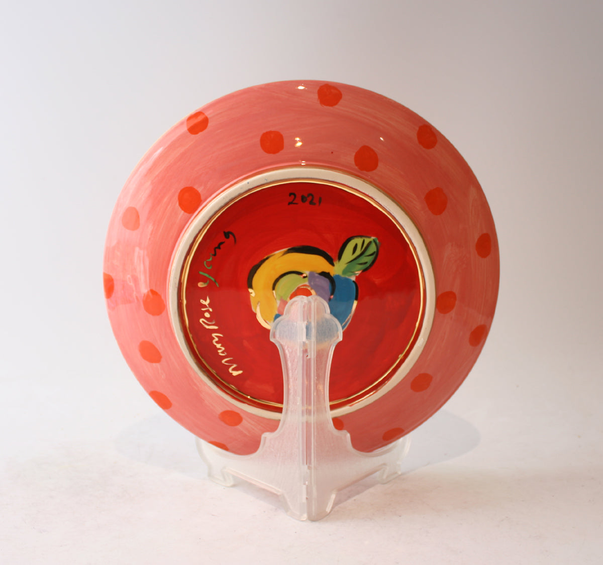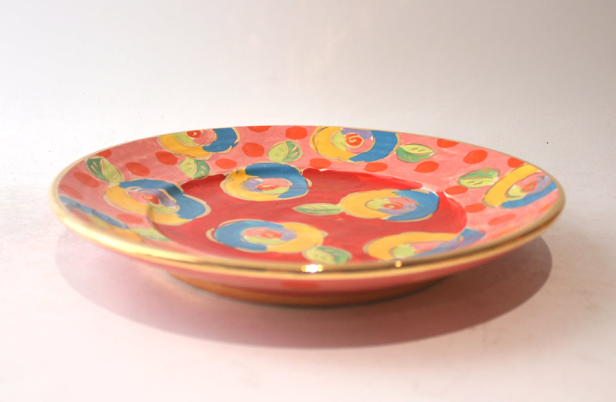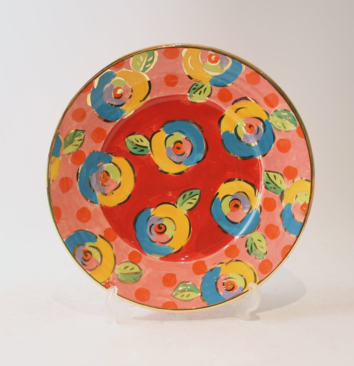 Mary Rose's Dinner Plates measure around 11 inches in diameter and make wonderful canvases for her unique designs...this one is painted in Roses Red with "Dotty Pink" on its outside rim and is eminently use-able, however it is best that it only experiences the dishwasher on occasion and it is not suitable for oven heating!