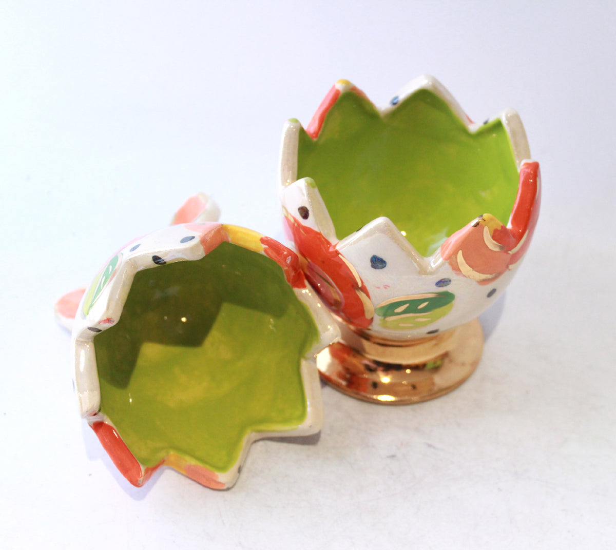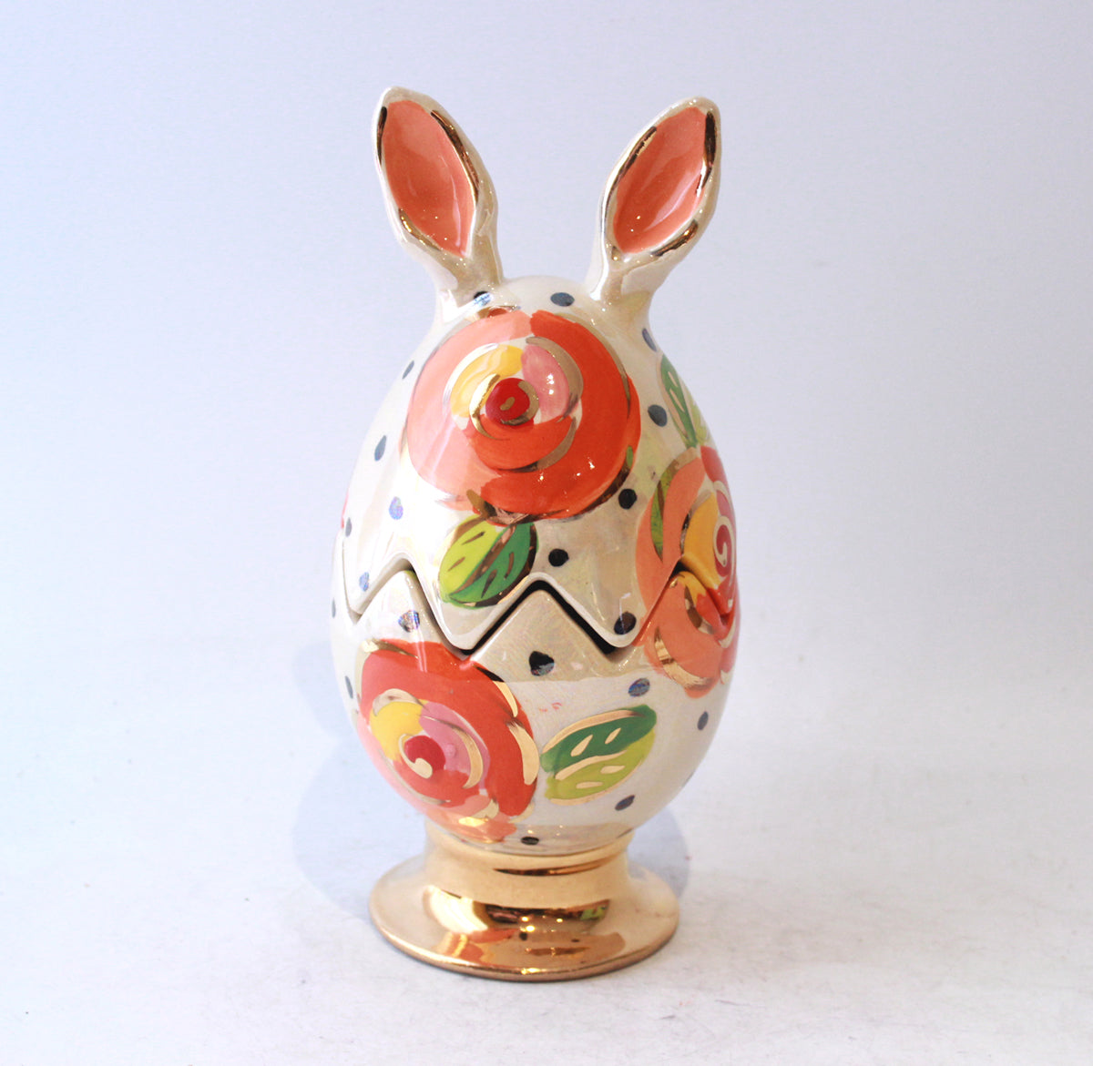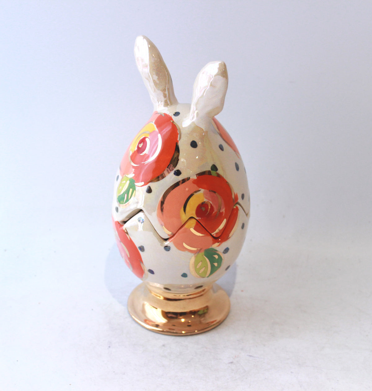 This Easter Egg made by Mary Rose stands around 8 inches tall and features a mock broken edge in its middle where one could suppose a chicken has burst its way out! It is painted in Gold New Rose on a background of polka dots with iridescence, and has a little pair of ceramic ears on top...