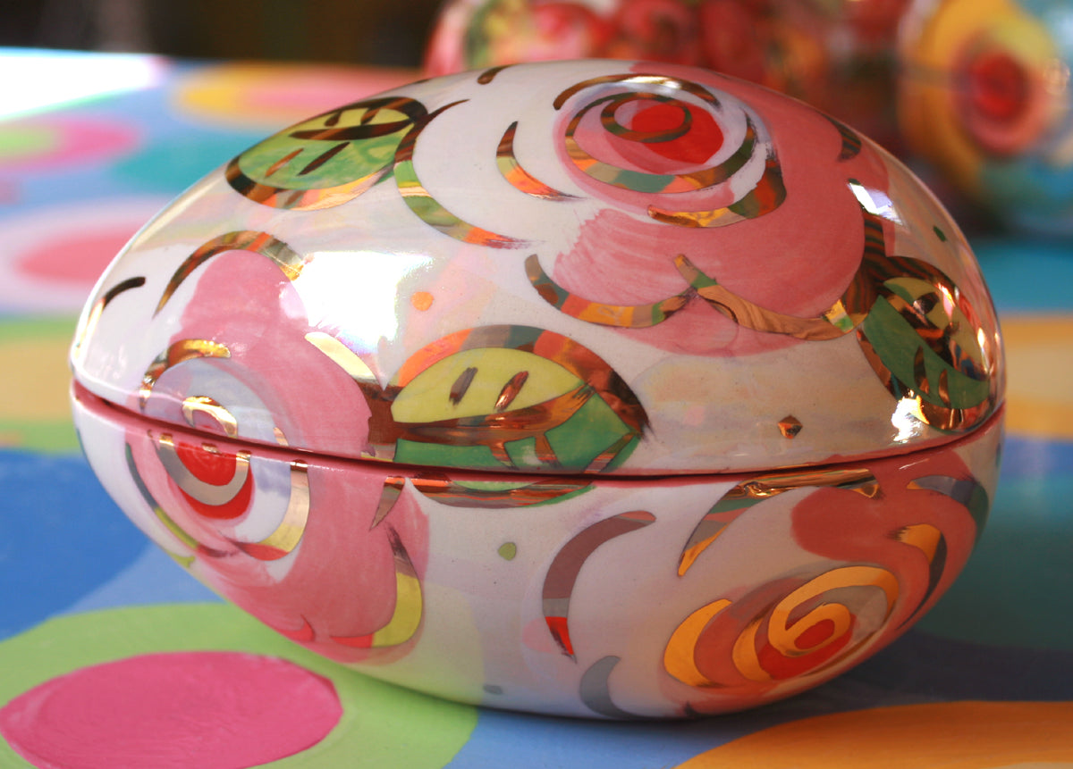 Mary Rose's Easter Eggs measure about 5.5 inches in length and are in two parts, so they open up to whatever Easter treats you decide to enclose! This one is painted in "Pale Rose Pink" on an iridescent background, and will make somebody's Easter extra special indeed!