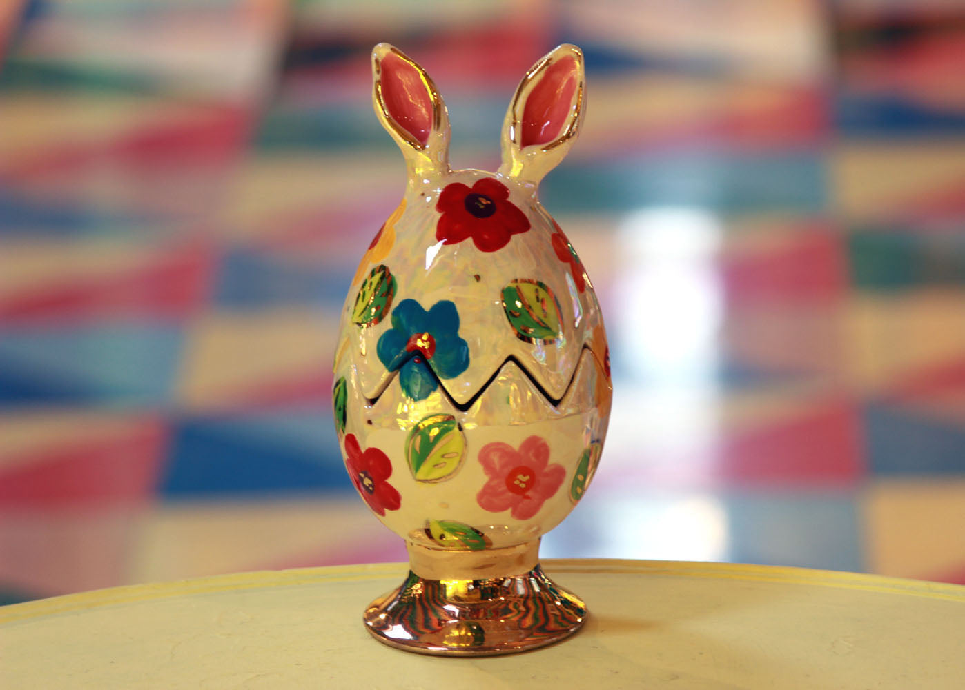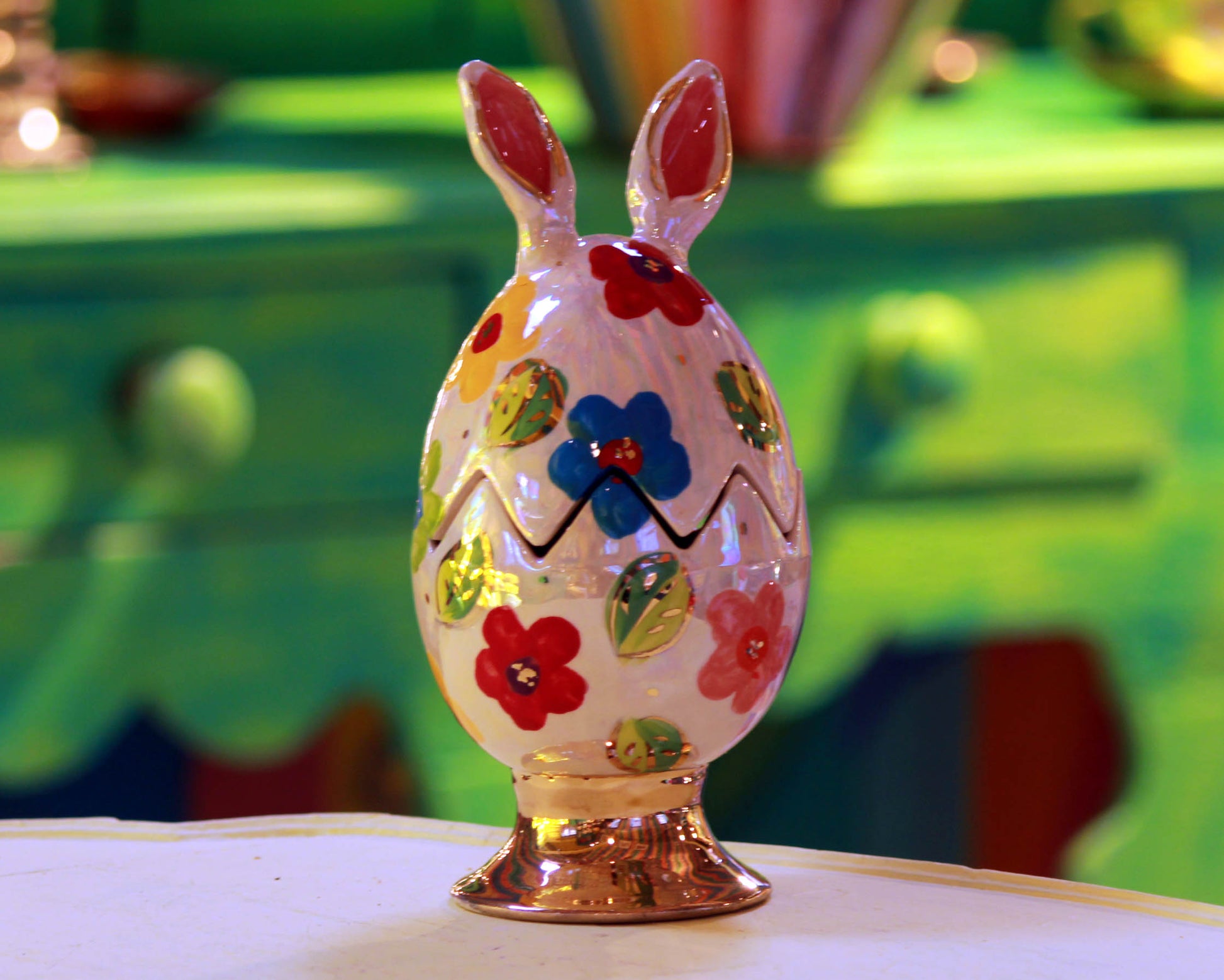 An Easter Egg with Ears is 8 inches high to the tip of the ears. It opens into two halves and can be stuffed with all kinds of chocolate goodies to finally end your Forty Days of fasting (as if). The Daisy design is in Multi Colours as a tribute to the many colours that we hope will surround us when Easter arrives