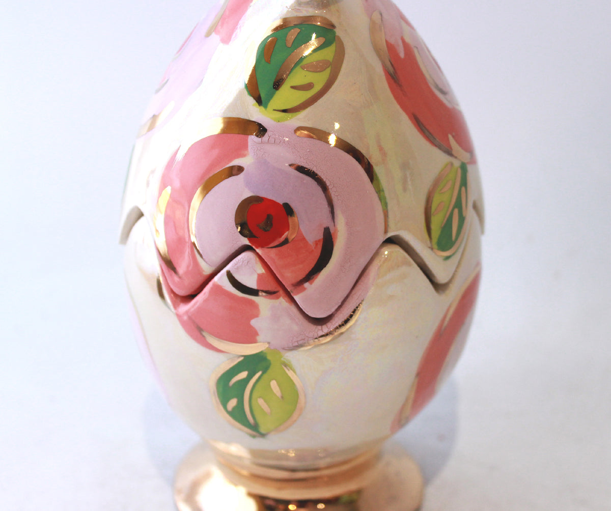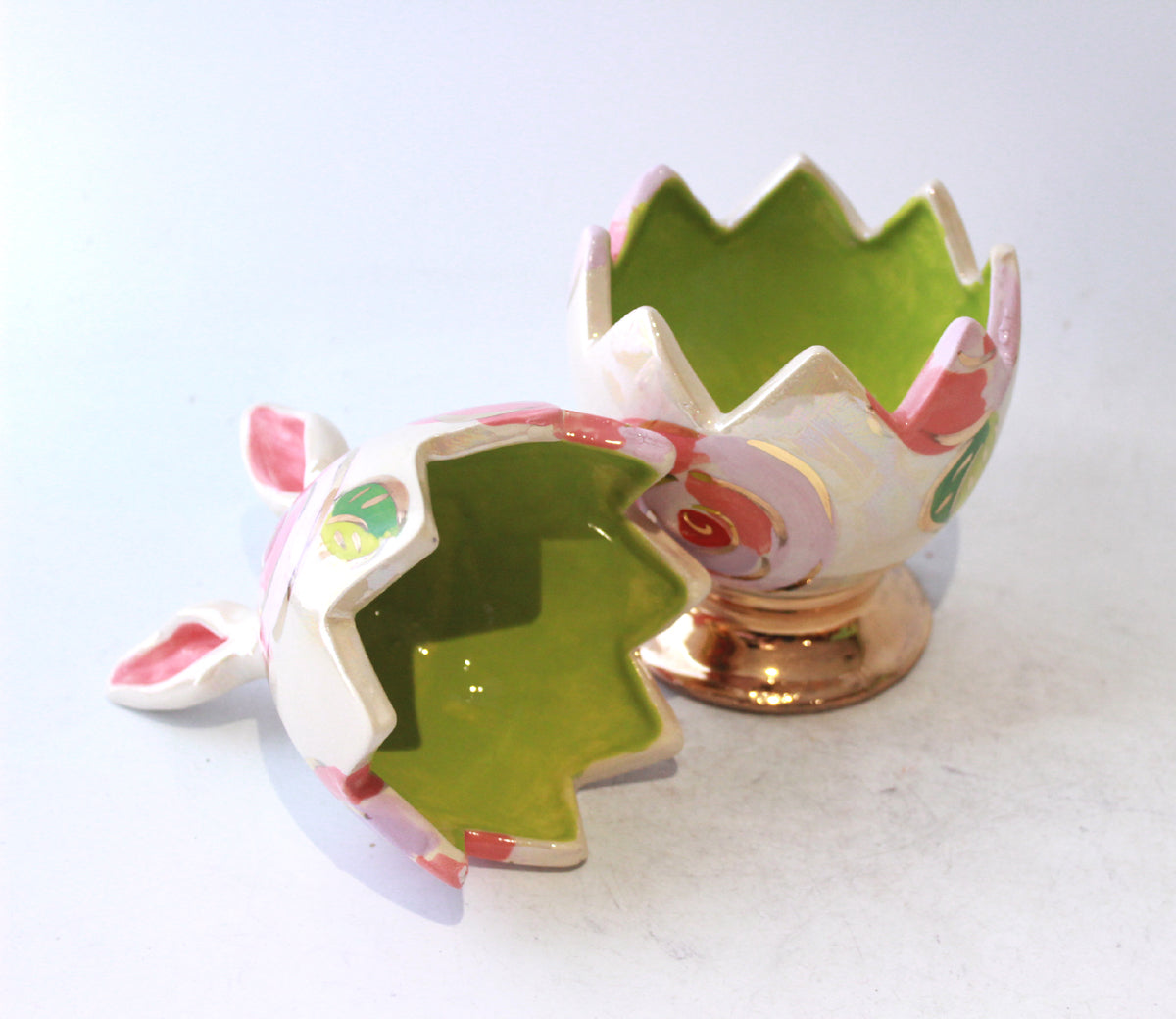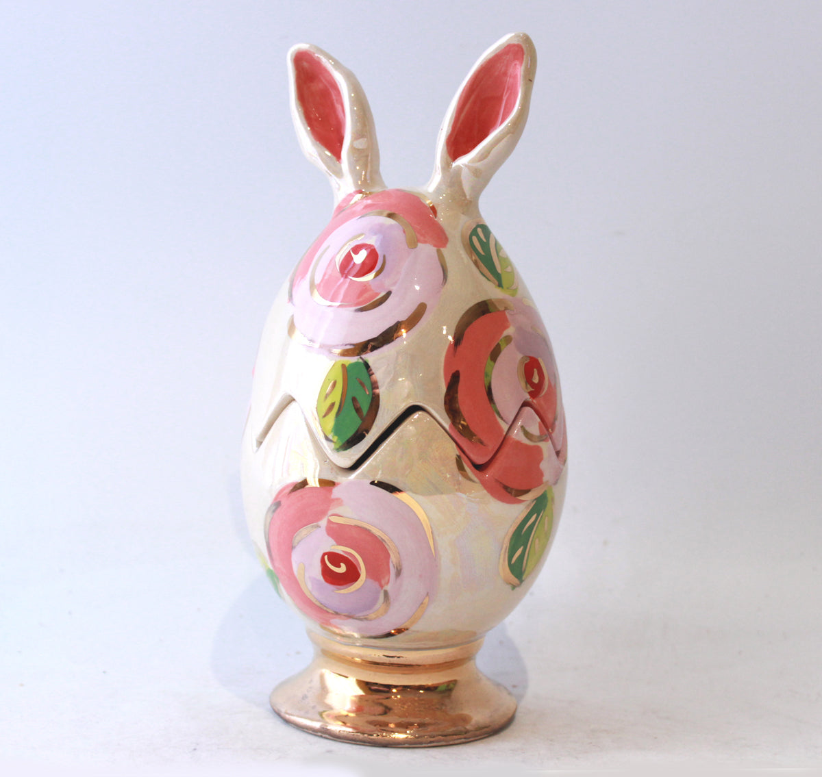 This Easter Egg made by Mary Rose stands around 8 inches in height and features a mock broken edge where one could suppose a chicken must have burst its way out! It has a pair of ears, and is painted in Gold New Rose on an iridescent background...