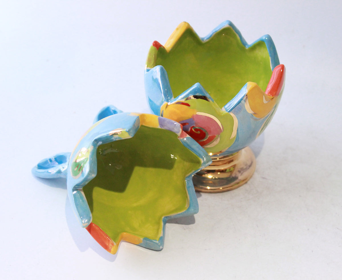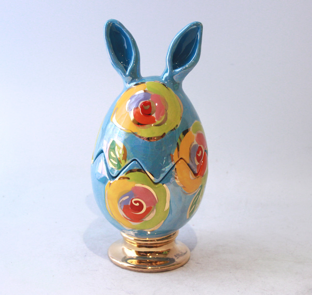 This Easter Egg made by Mary Rose stands around 8 inches in height, and has a mock broken edge around its middle where one could suppose a chicken might have burst its way out! It has a pair of ears and is painted in Gold New Rose on a dreamy iridescent blue....