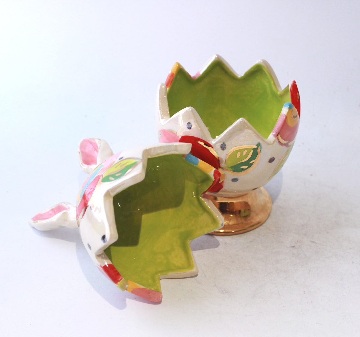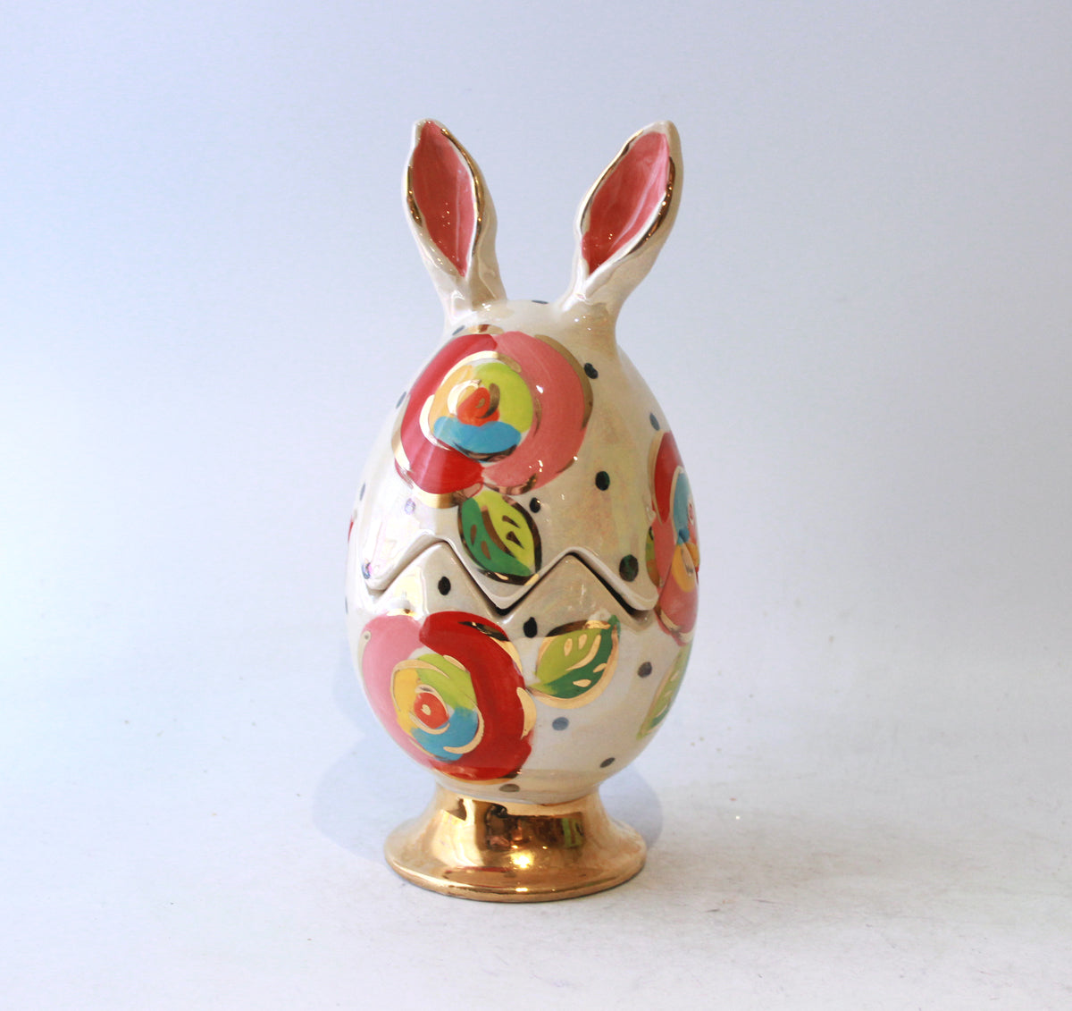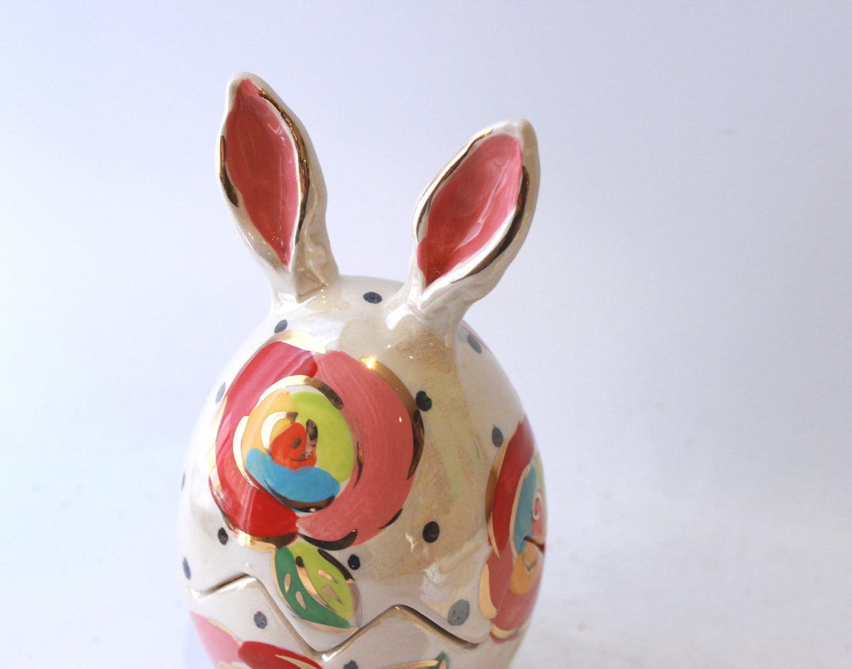 This Easter Egg made by Mary Rose stands around 8 inches in height and has a mock broken edge in its middle where one could suppose a chicken might have burst its way out! It has a pair of ears, and is painted in Gold New Rose on a background of Polka Dots on iridescence....