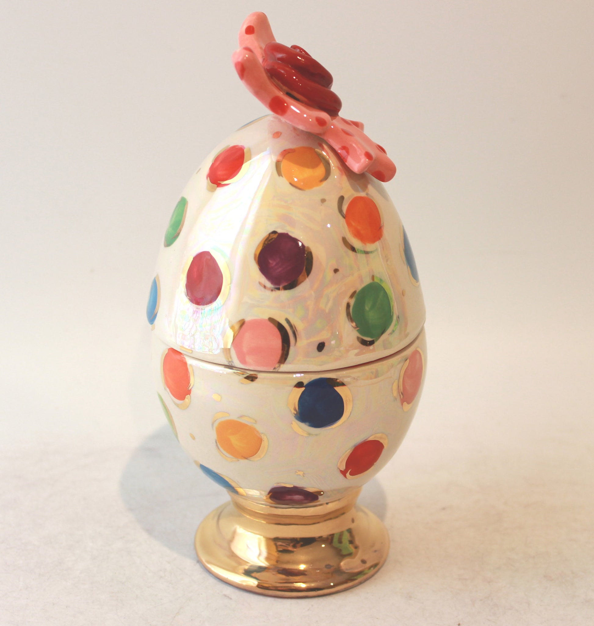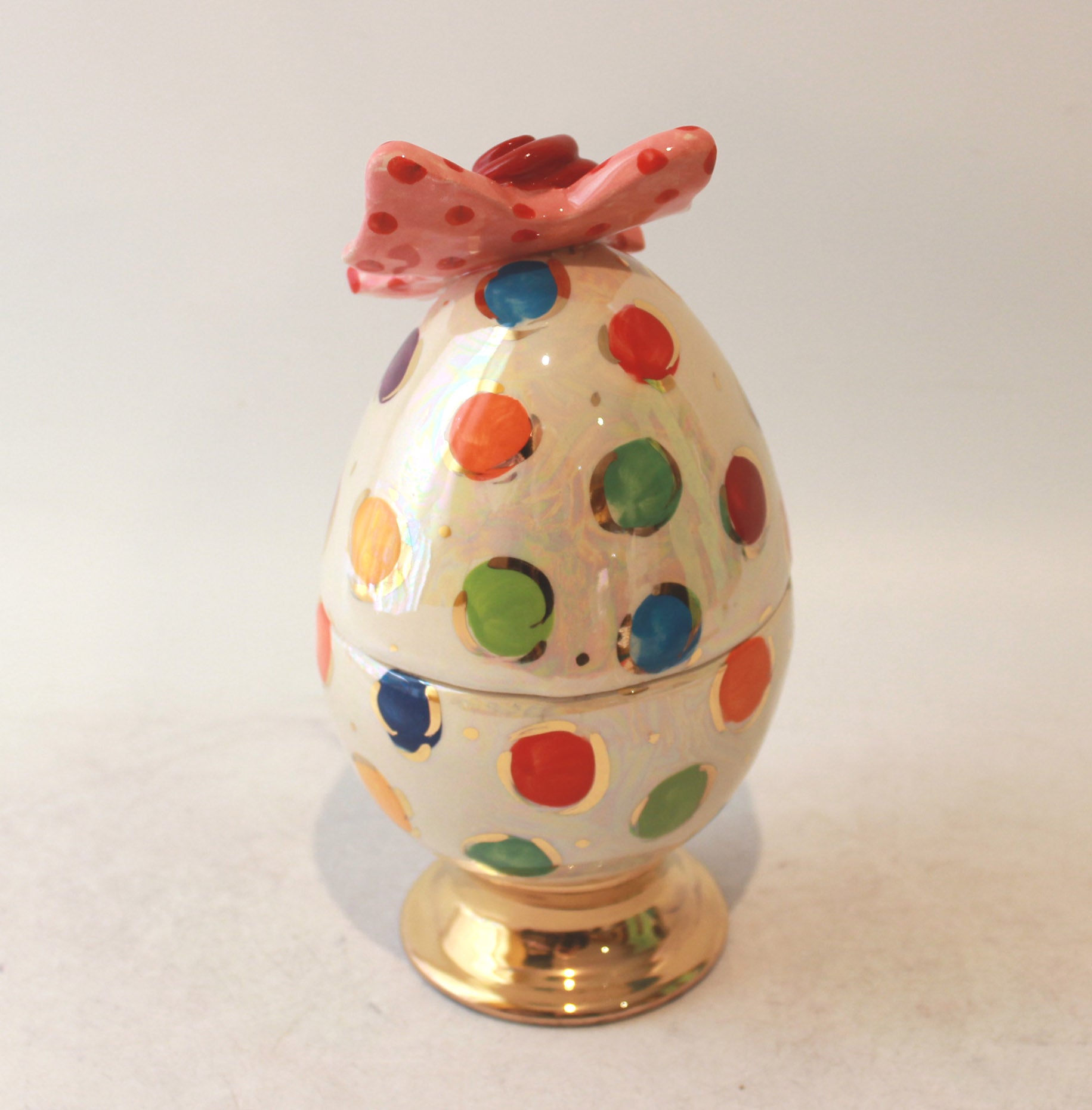 An extremely precious looking model...the ribbon is teid in a neat bow atop the egg and the effect is perfect. Coloured Dots roam all over the surface and the egg stands on a gold plinth