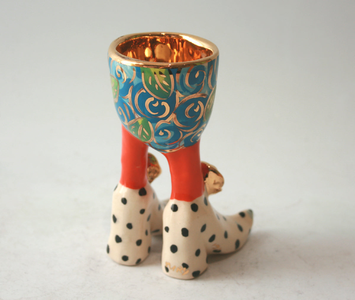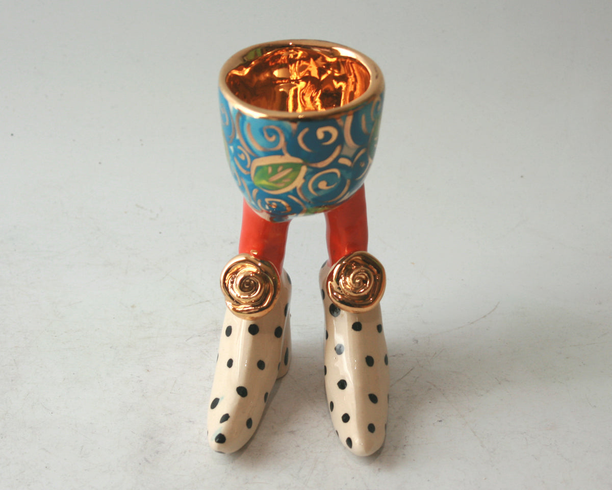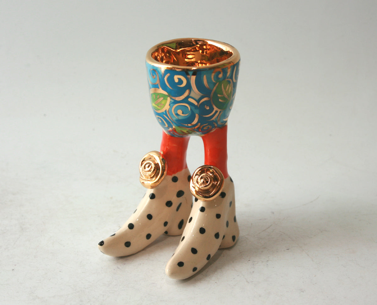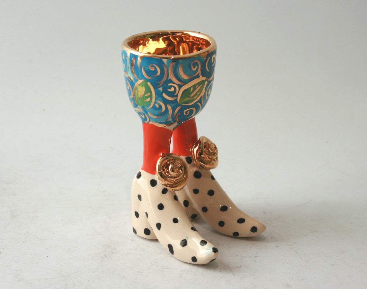 A classic Mary Rose Young Egg Cup standing around 4.5 inches tall in "Blue Rosebush" design with an inside of 24 carat gold and polka dot feet....