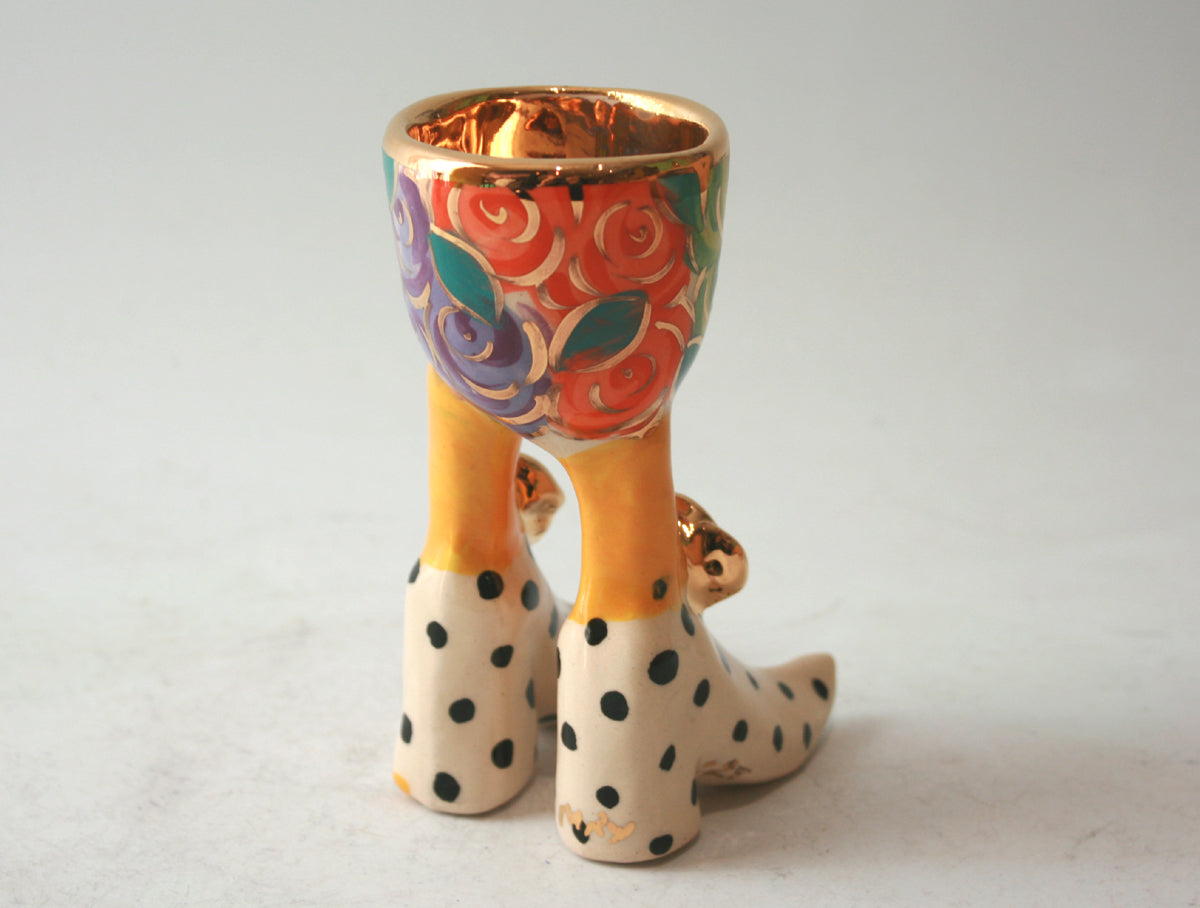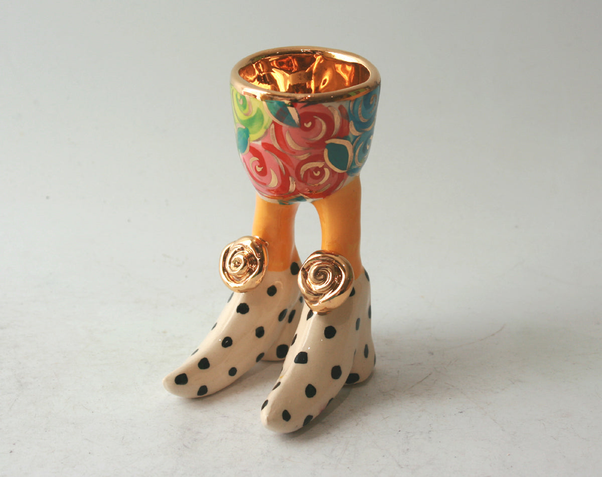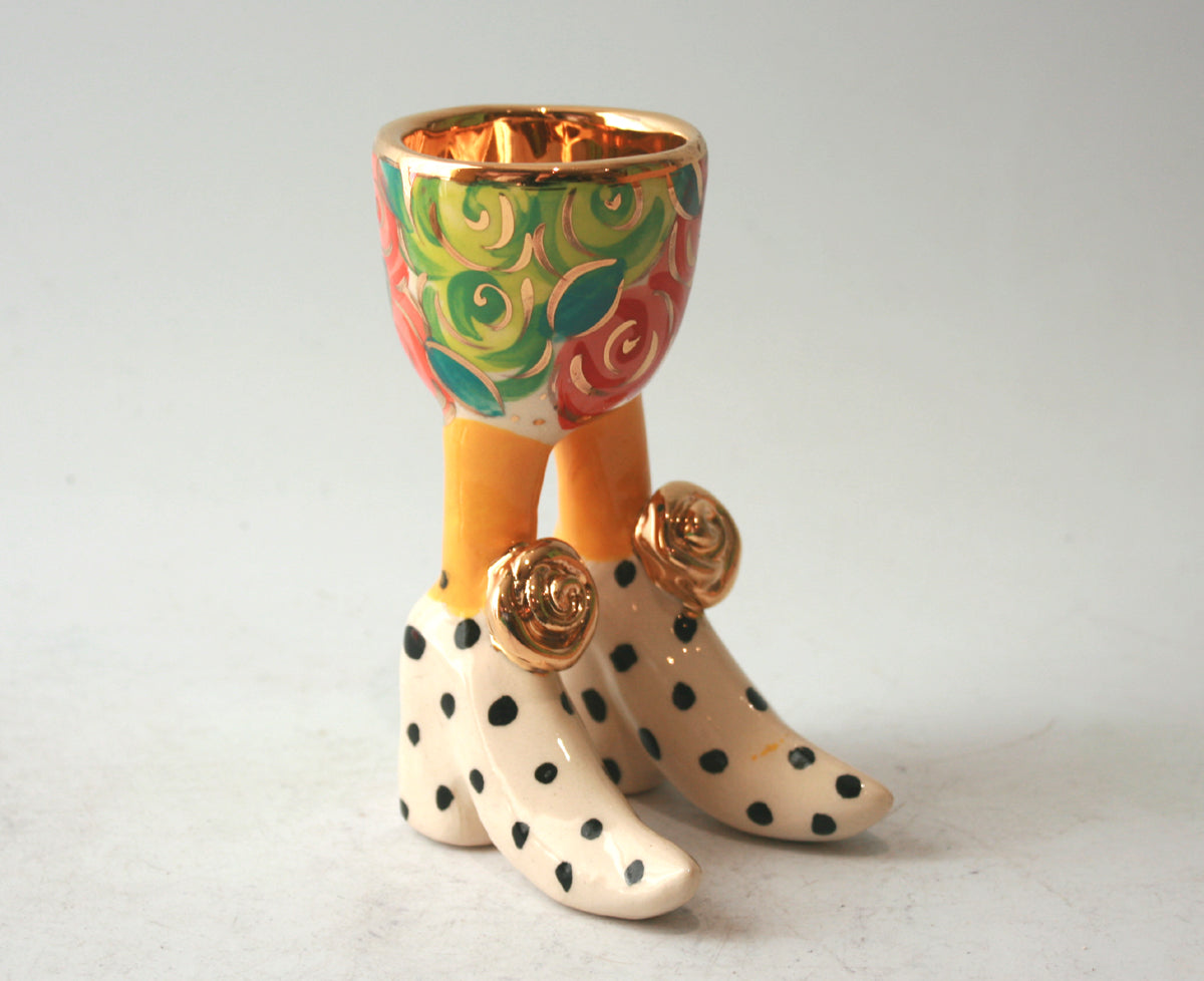 A classic Mary Rose Young Egg Cup standing around 4.5 inches tall and painted in "Pastel Rosebush", a multicoloured variation upon the popular design which contrasts with its Polka Dot feet!