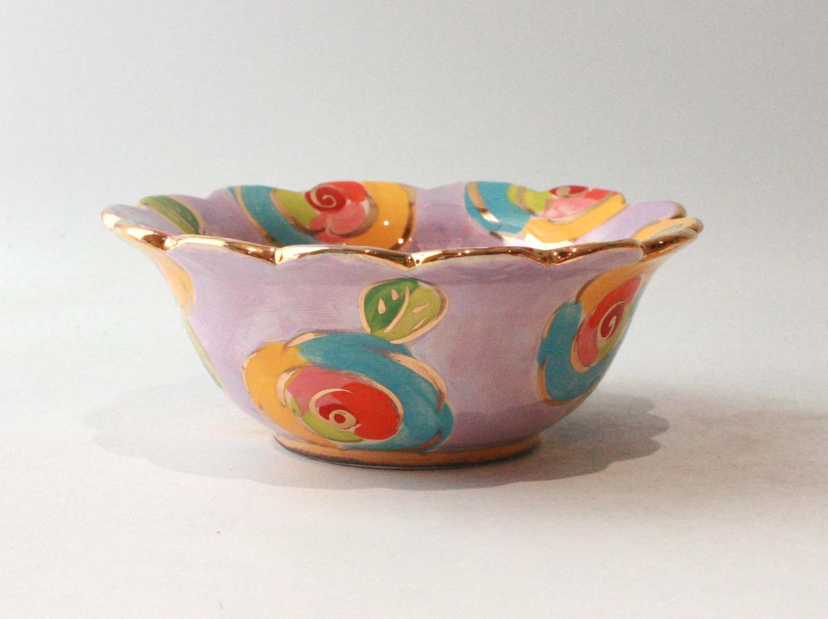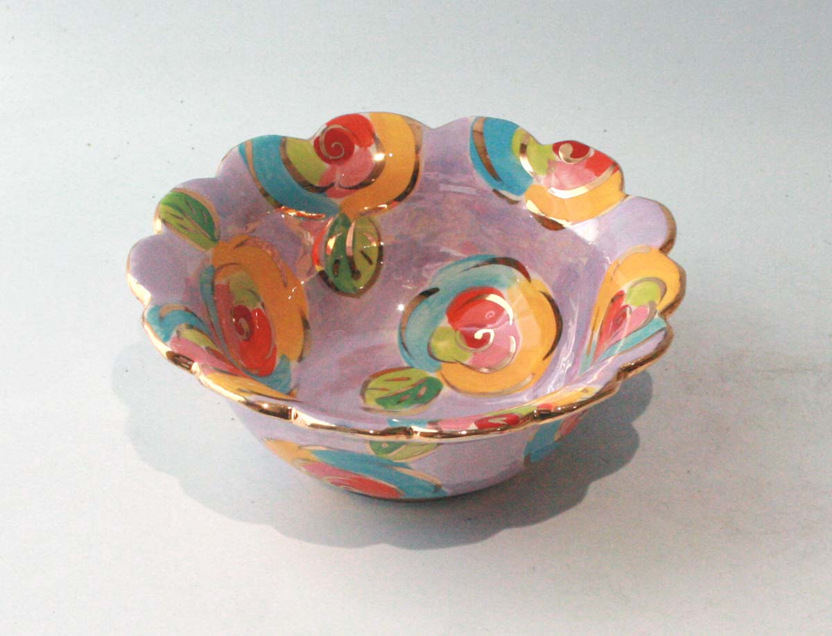 This Cereal Bowl is looking rather different than the others...it measures around 7 inches in diameter and has been given a "Fluted" rim! It is painted in "Gold New Rose" on a pretty iridescent purple with accents of 24 carat gold...
