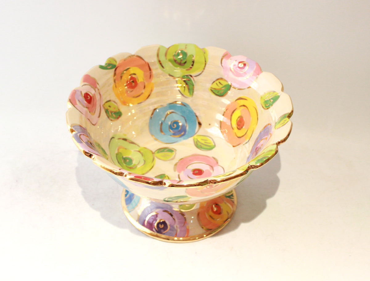 Mary Rose's Punch Bowls measure around 12 inches in diameter and are the perfect receptacles for indeed, Punch, or whatever you choose to put in them! This one is decorated in the very pretty "Pale Roses" design, on a background of shimmering Mother of Pearl with accents of 24 carat gold...