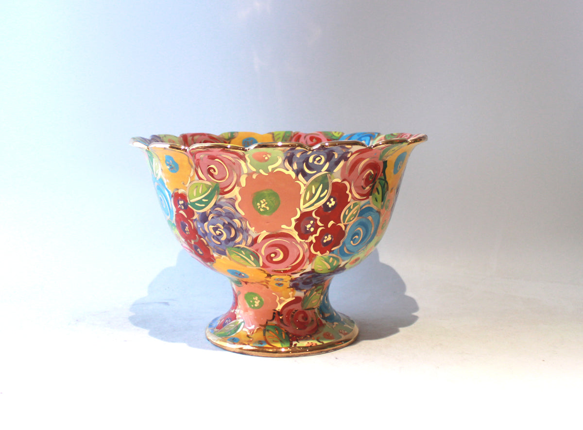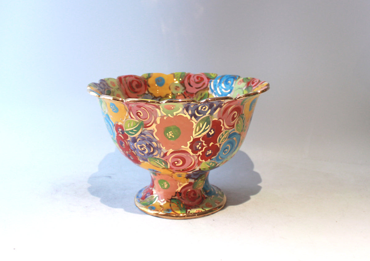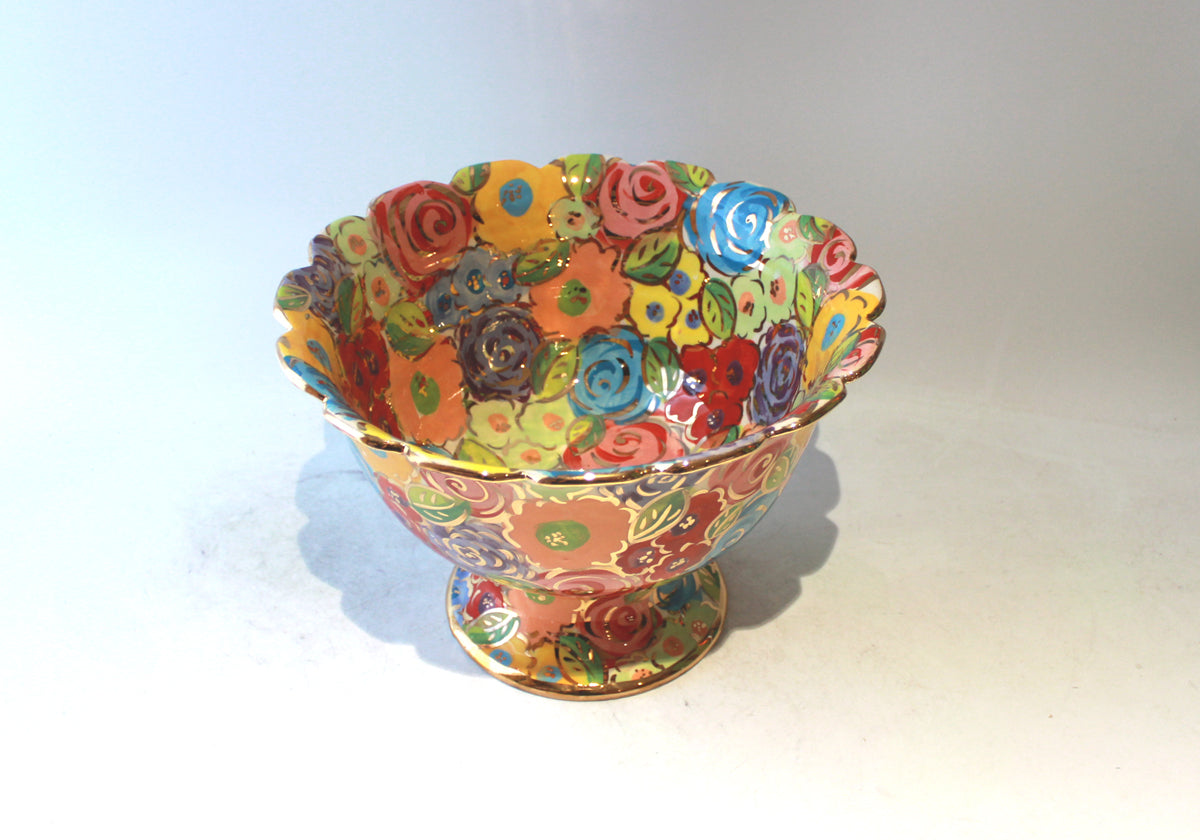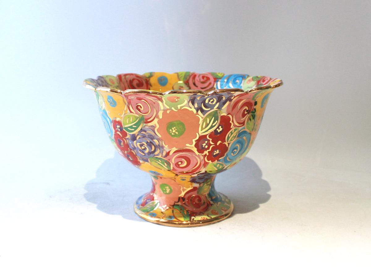 Mary Rose's Punch Bowls measure around 12 inches in diameter and make wonderfully fun containers for Punch, or indeed simply beautiful display pieces! This one is painted in "Pastel Blooms", with accents of 24 carat gold throughout and illuminating its base and "Fluted" rim...