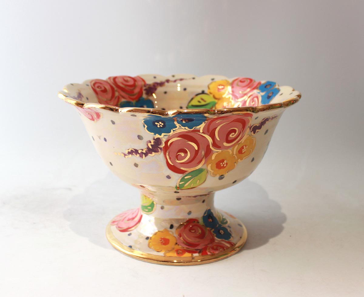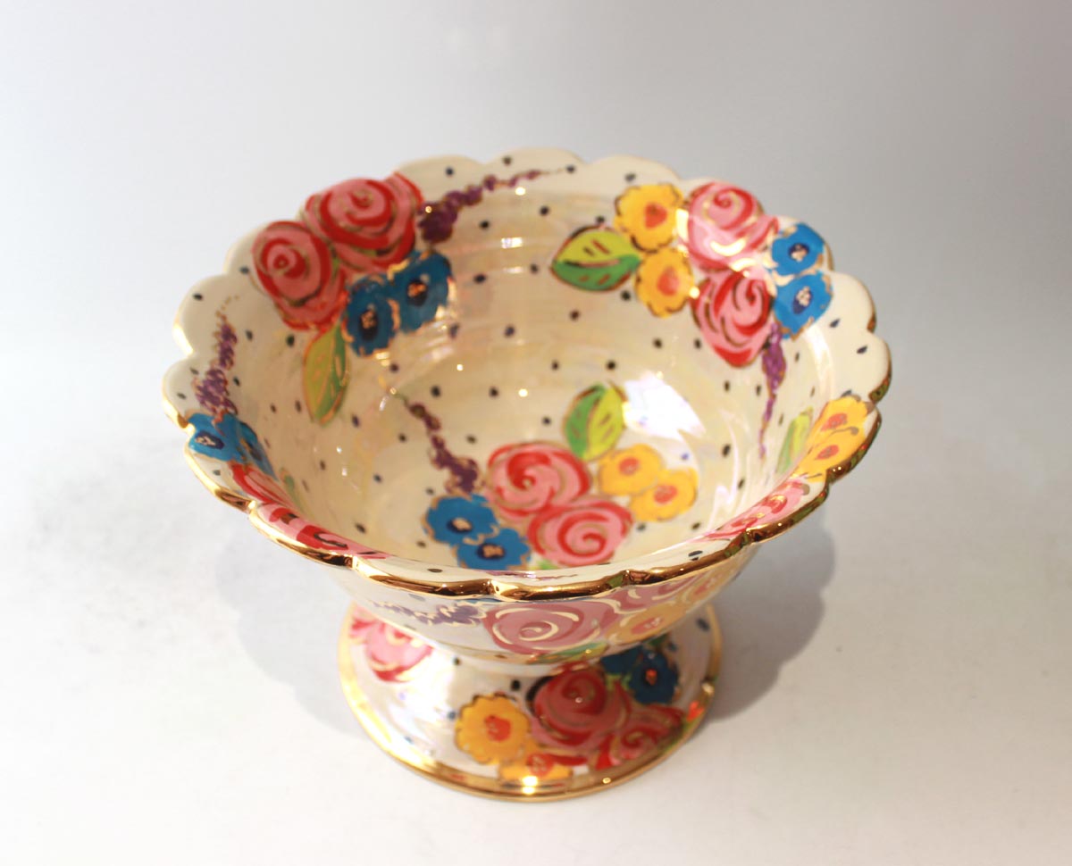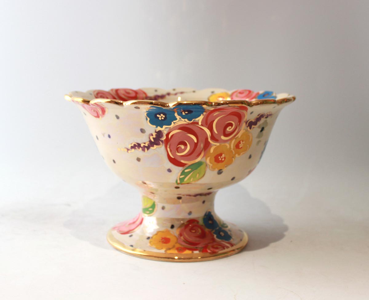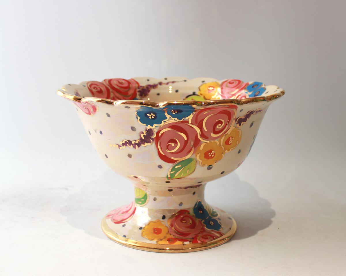 This Punch Bowl measures around 12 inches in diameter and is painted in the classic "Vintage Floral" design, where colourful blooms sit on an iridescent background accented by flecks of 24 carat gold...