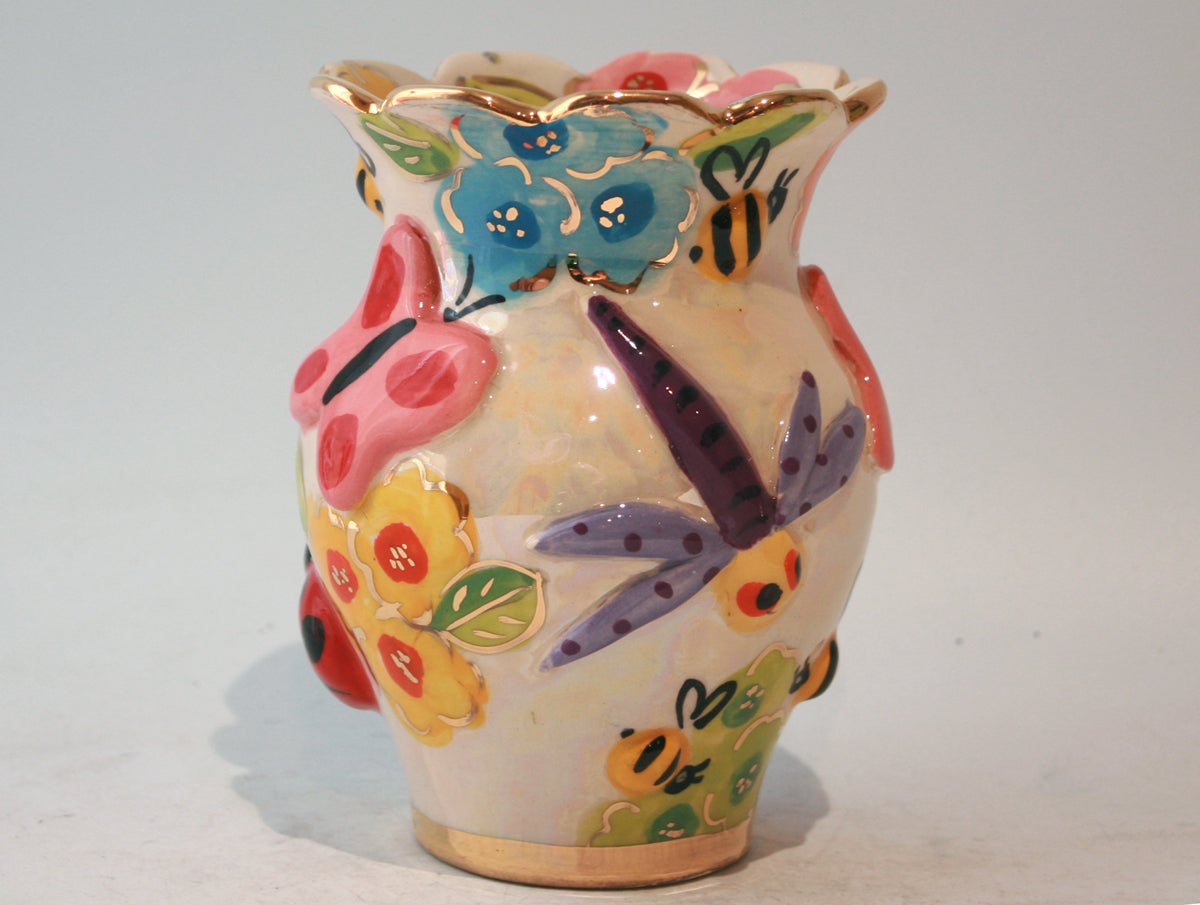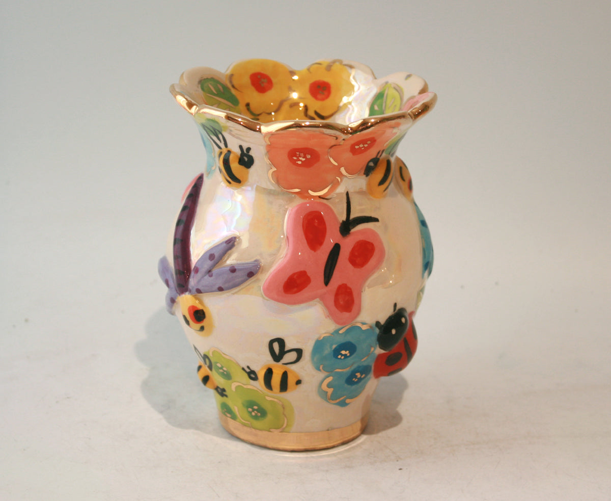 This Small Fat Vase stands nearly 6 inches tall and has a Scalloped edge...the design is new for 2020 "Bugs", which features adorable little ceramic creatures on a background of iridescence!