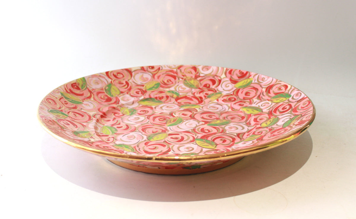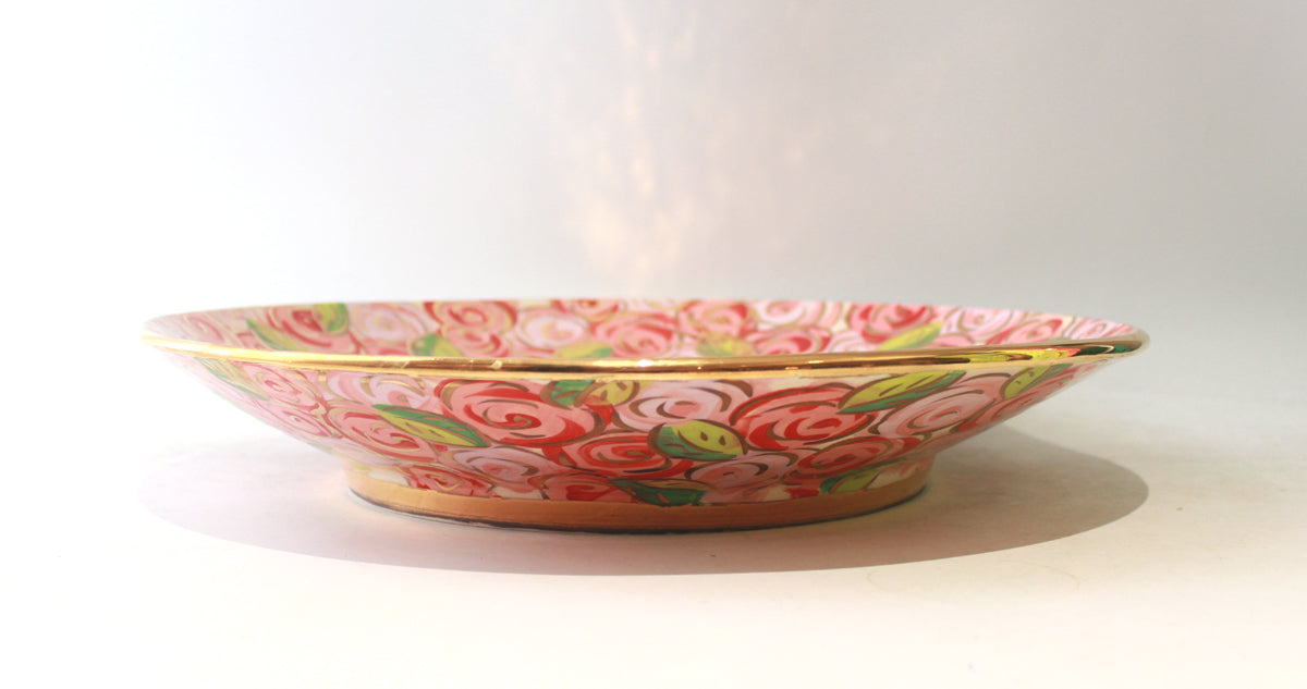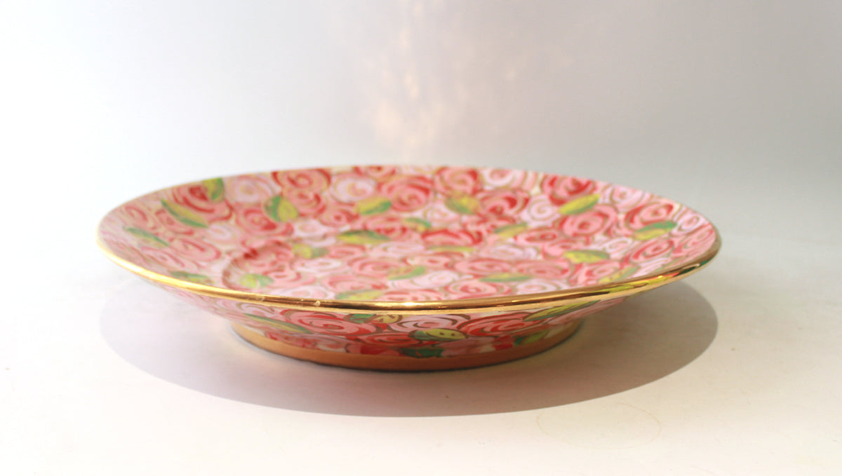 Mary Rose's Giant Platters are certainly show-stoppers, with a diameter of 16 inches they will brighten up any dark corner! They are hand-thrown, which means that the whole piece is created in just one sitting by Mary Rose on the wheel...this one is decorated in the very pretty "Red Rosebush", where colourful clusters of roses group around accents of 24 carat gold!