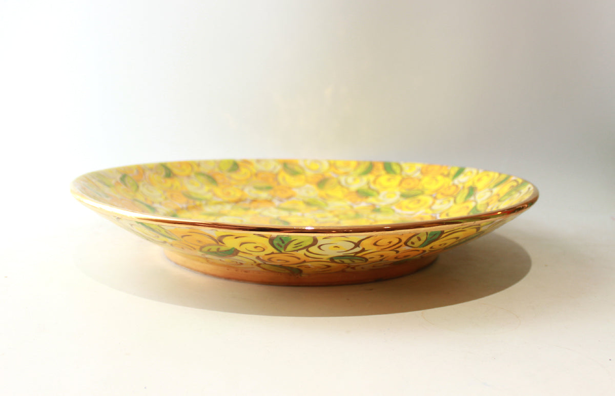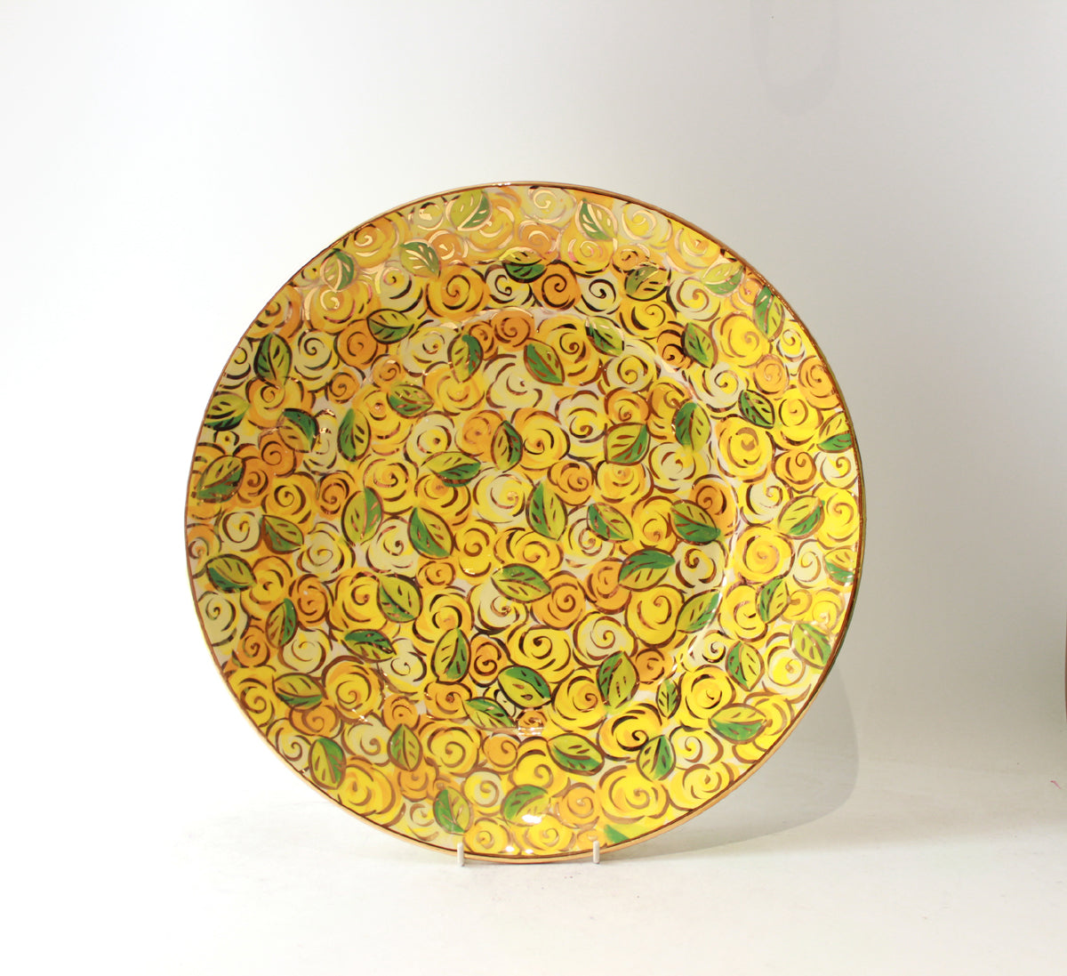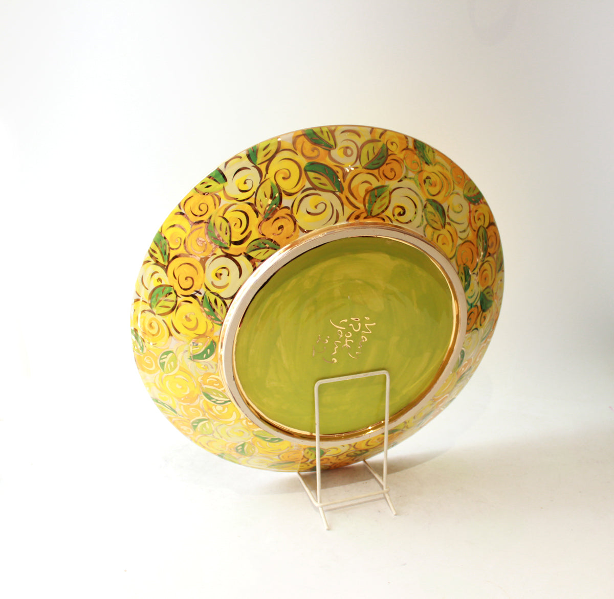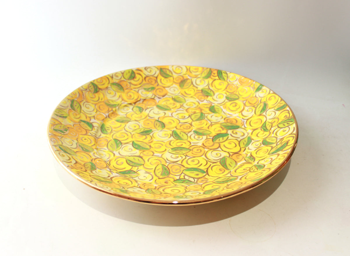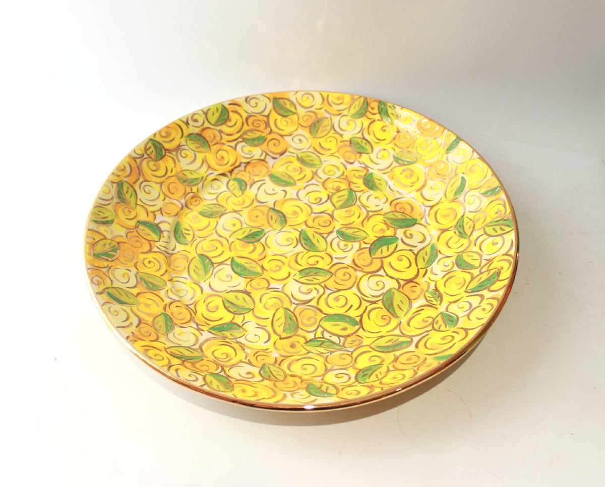 Mary Rose's Giant Platters are certainly show-stoppers, with a diameter of 16 inches they will brighten any dark corner! They are hand-thrown, which means that the whole piece is created in just one sitting by Mary Rose on the wheel...this one is decorated in "Yellow Rosebush" design, with accents of 24 carat gold throughout...