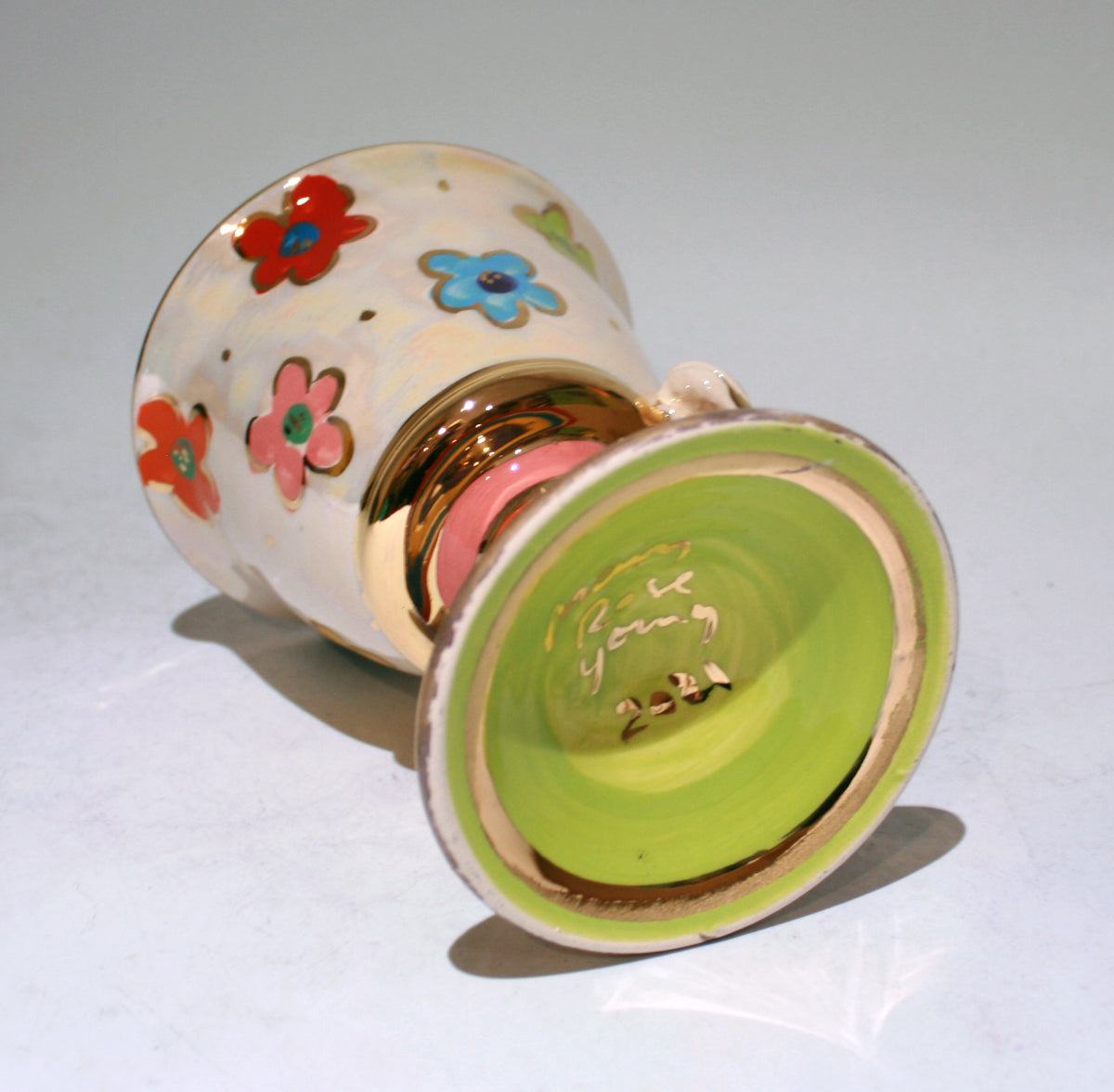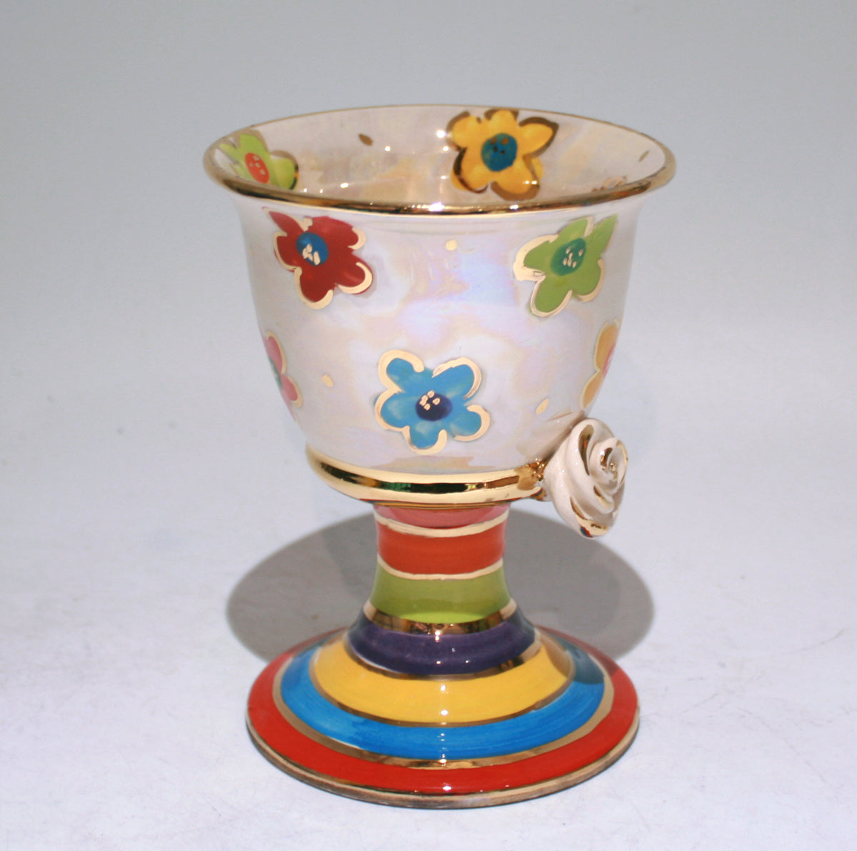 Mary Rose's classic Goblet shape here features a new for 2021 design "Daisy", which is painted with colourful Daisies on a pearlescent background with accents of 24 carat gold...the Goblet stands around 5 inches tall and has also a little ceramic rose where the cup and stem meet...the price is for one only.
