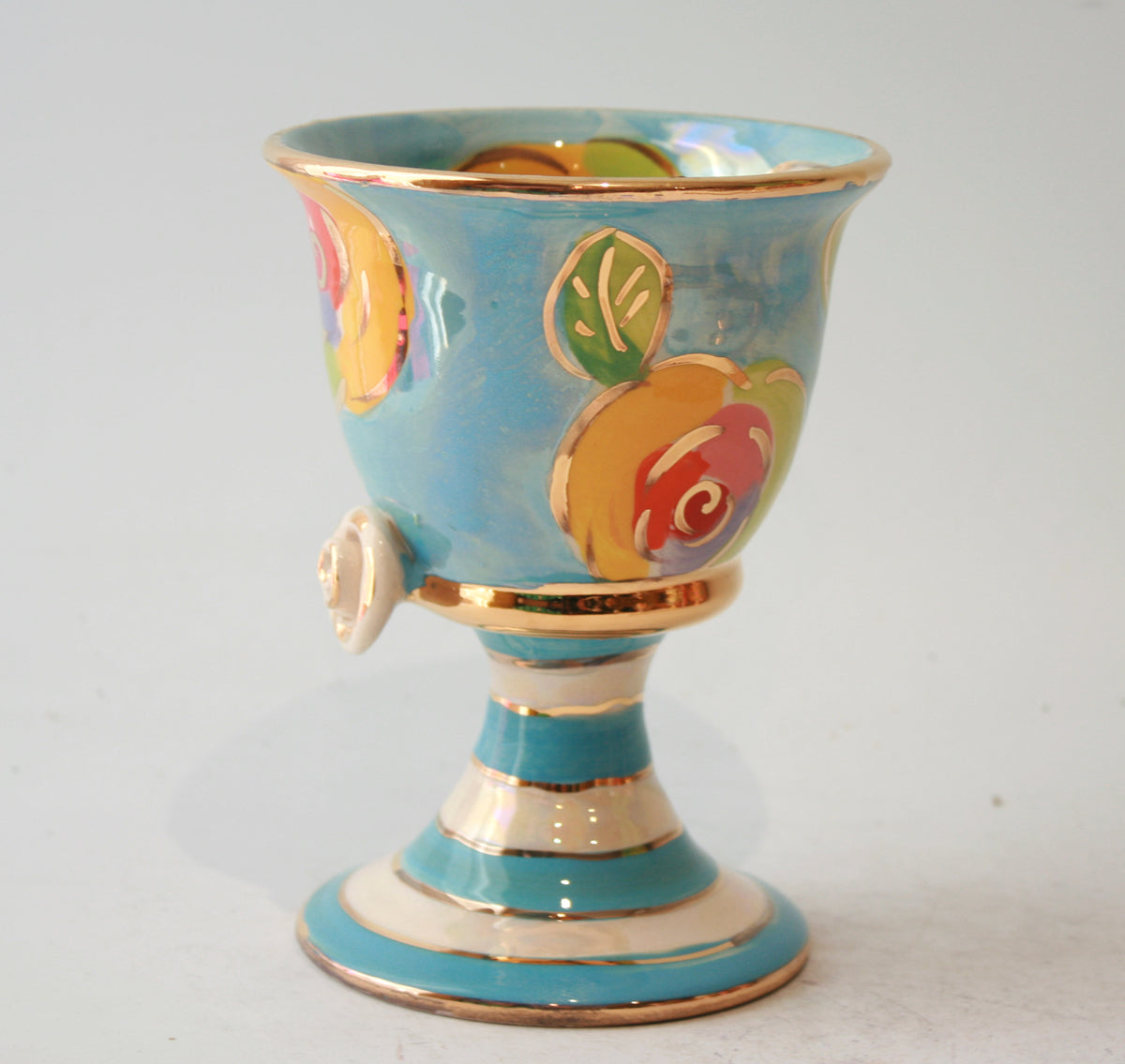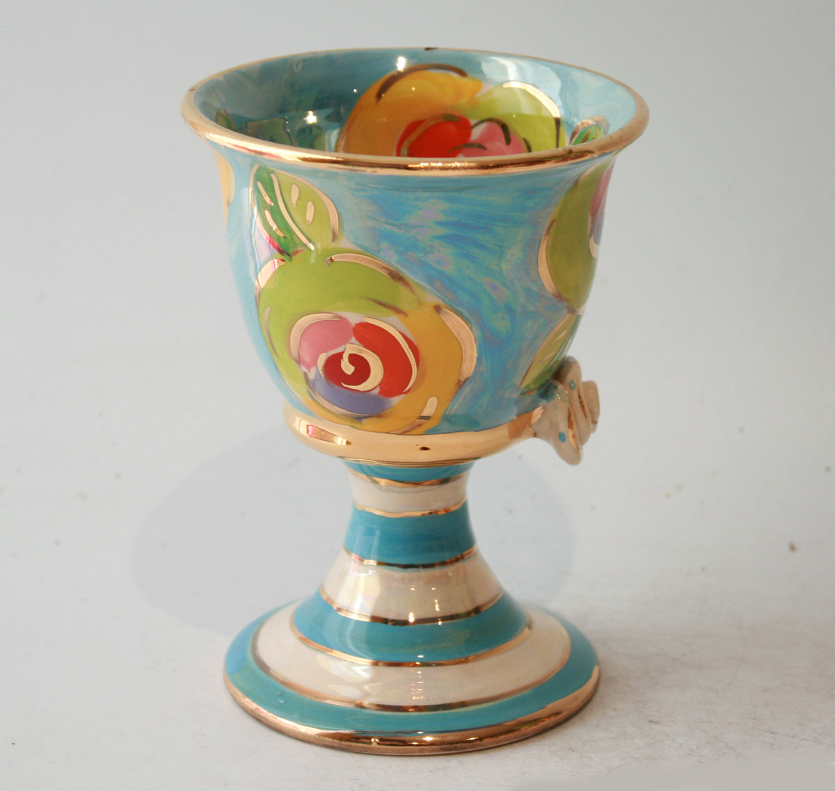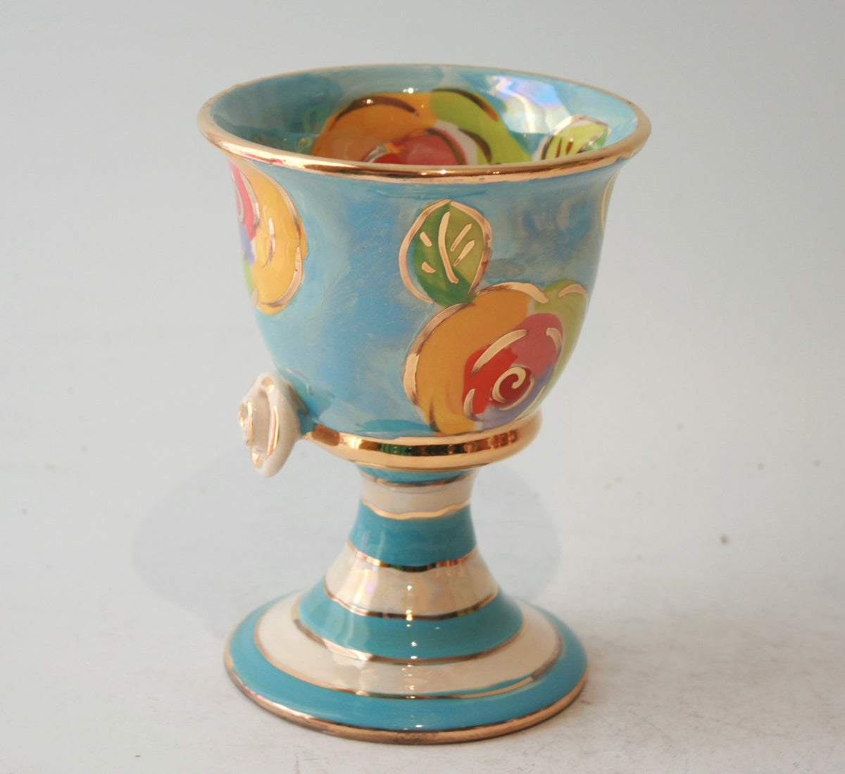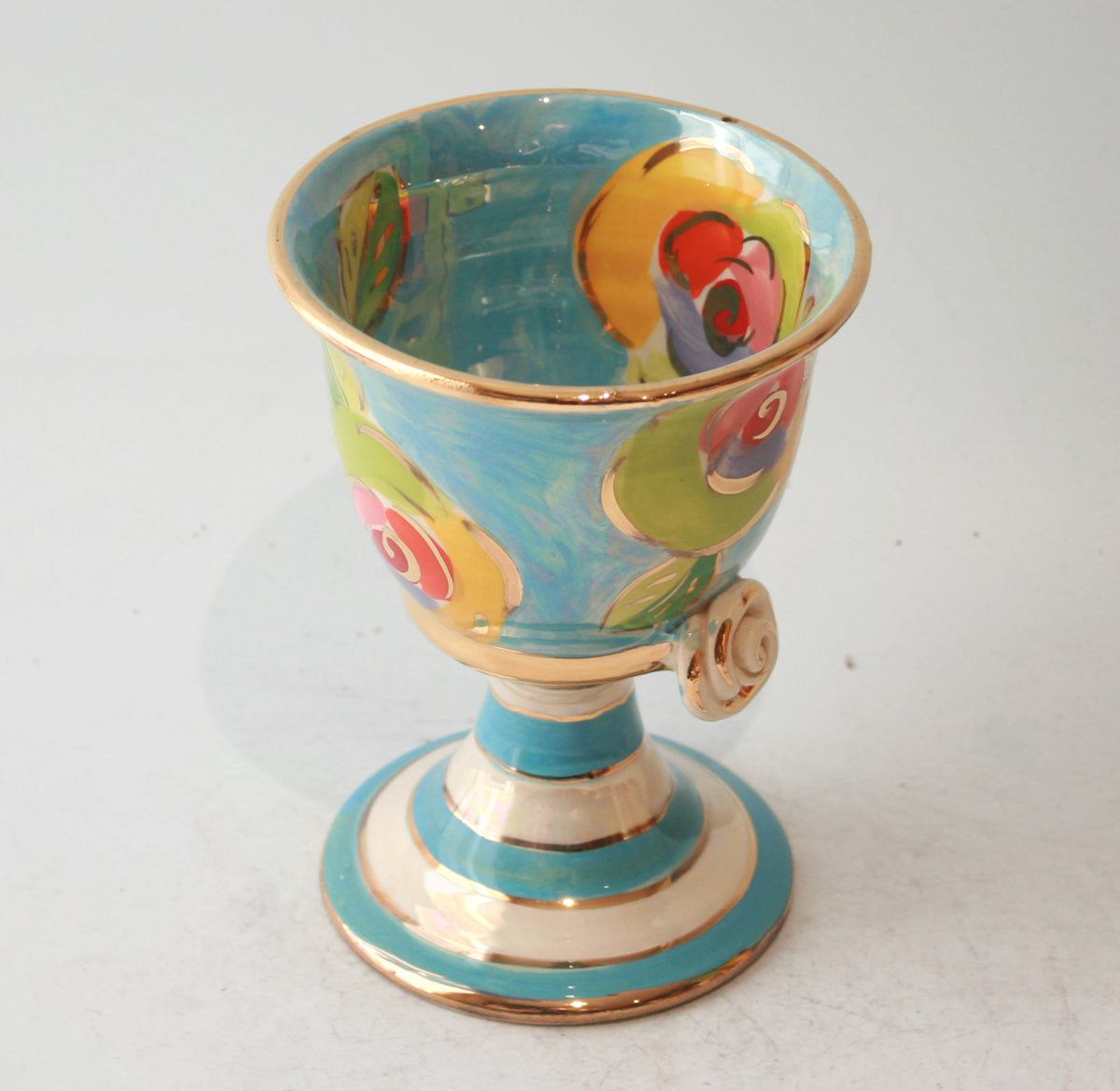 Mary Rose's classic Goblet shape stands around 5 inches tall, and here takes on a "Gold New Rose" design on a background of iridescent blue...there is also a little ceramic rose where the cup and stem join, and the piece is finally tied together with accents of 24 carat gold...