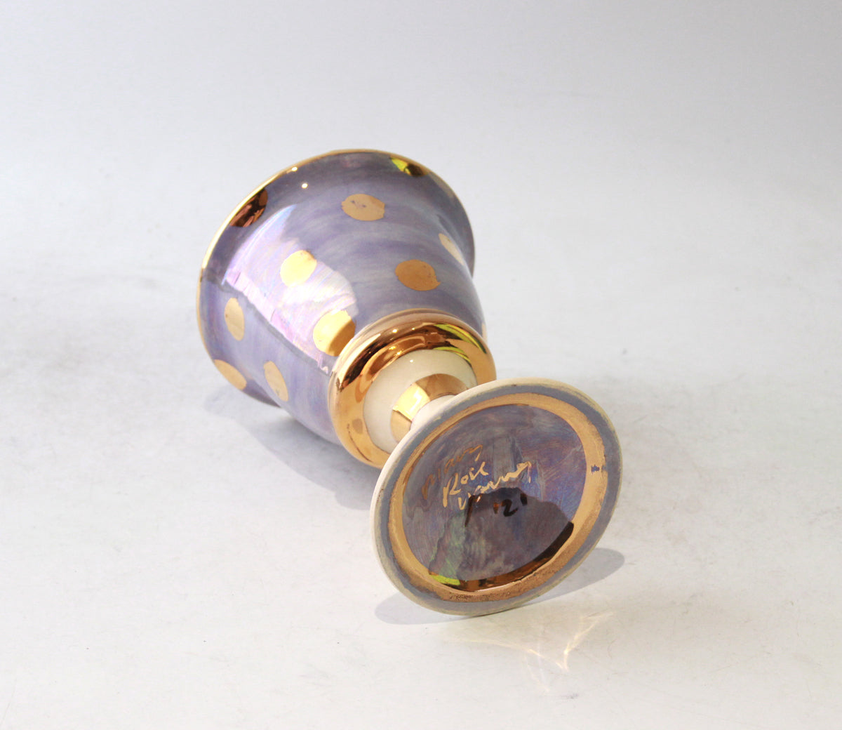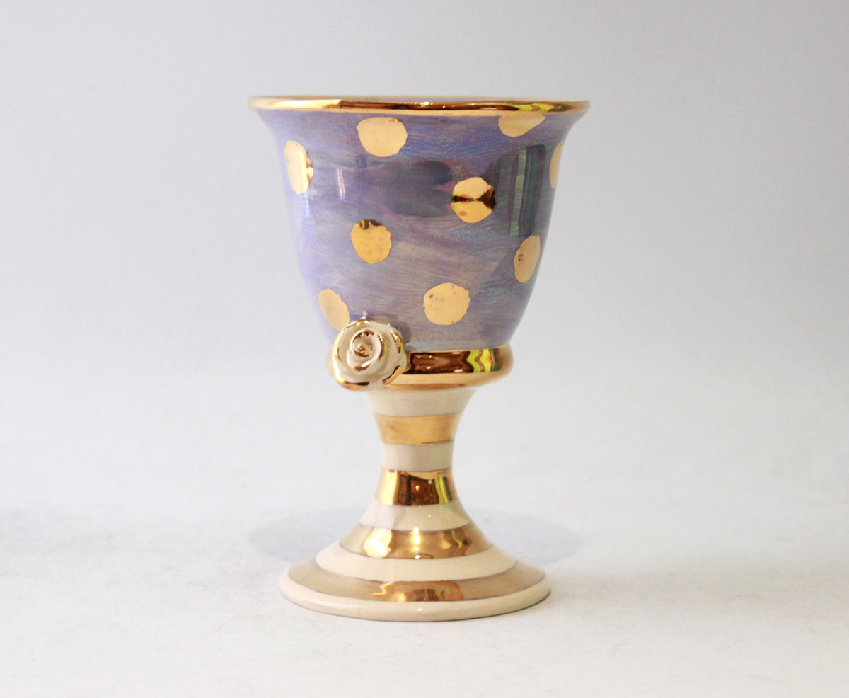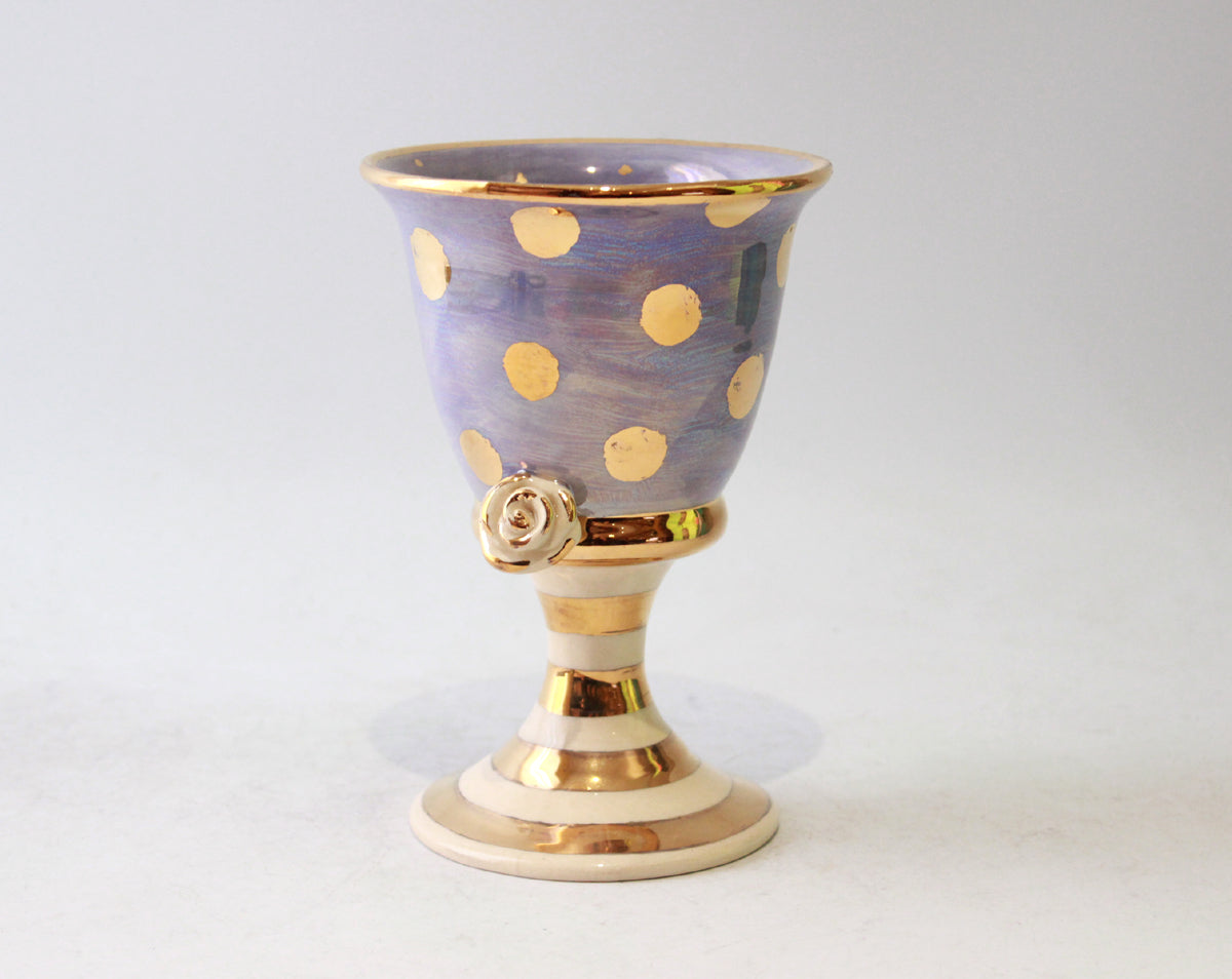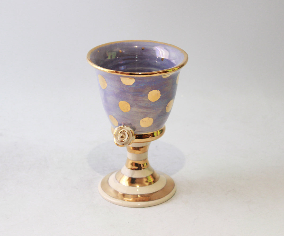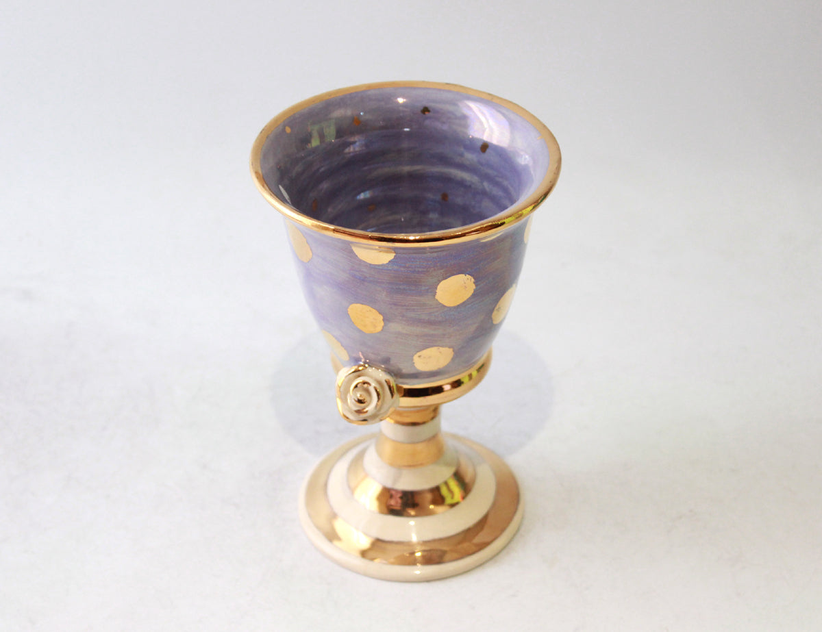 Mary Rose's Classic Goblet Shape here has been lovingly painted in the prettiest purple, with a layer of iridescent Mother of Pearl and accents of 24 carat gold throughout! Her Goblets stand around 5 inches tall and make the most glamorous receptacles for your favourite beverages...