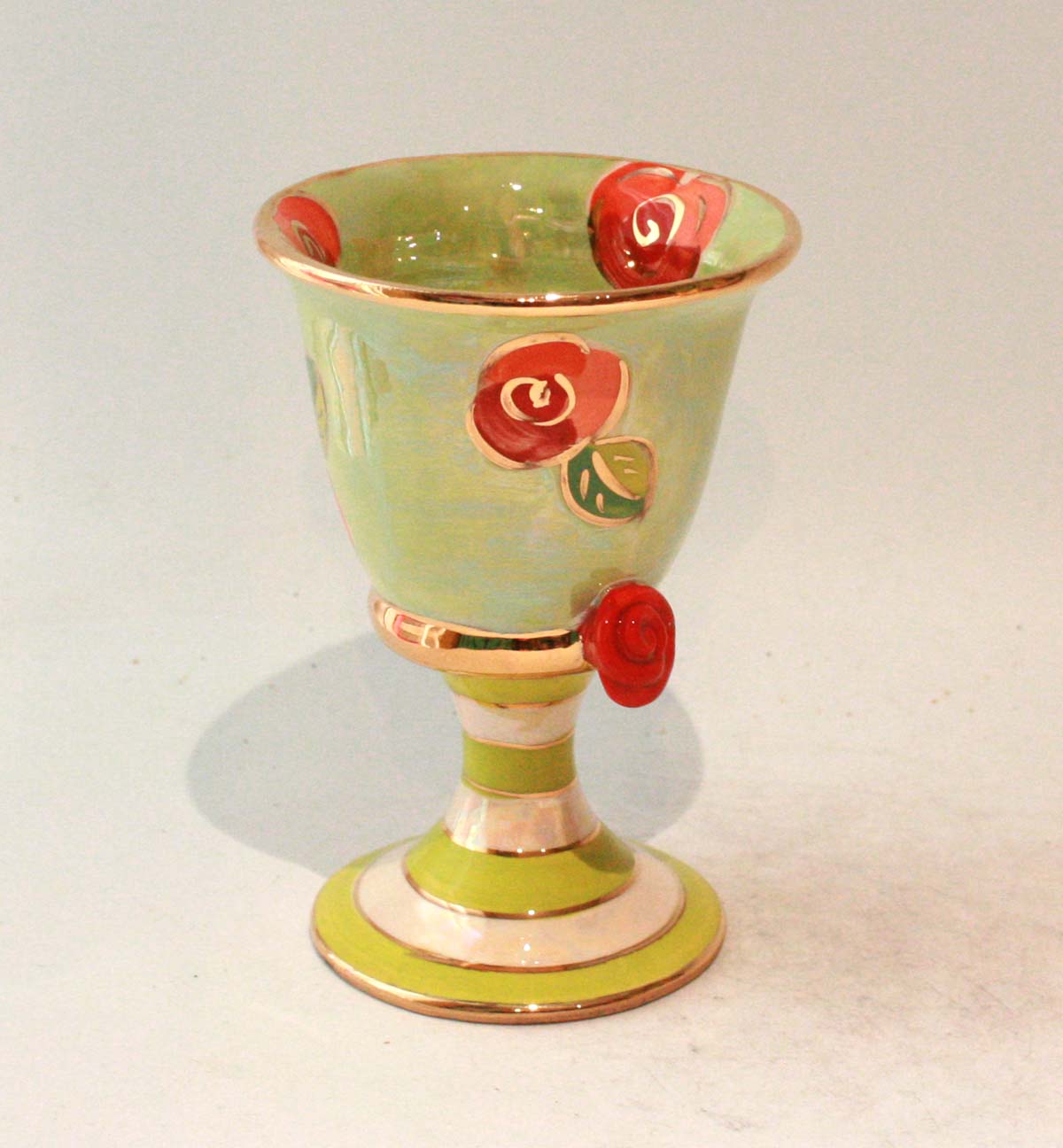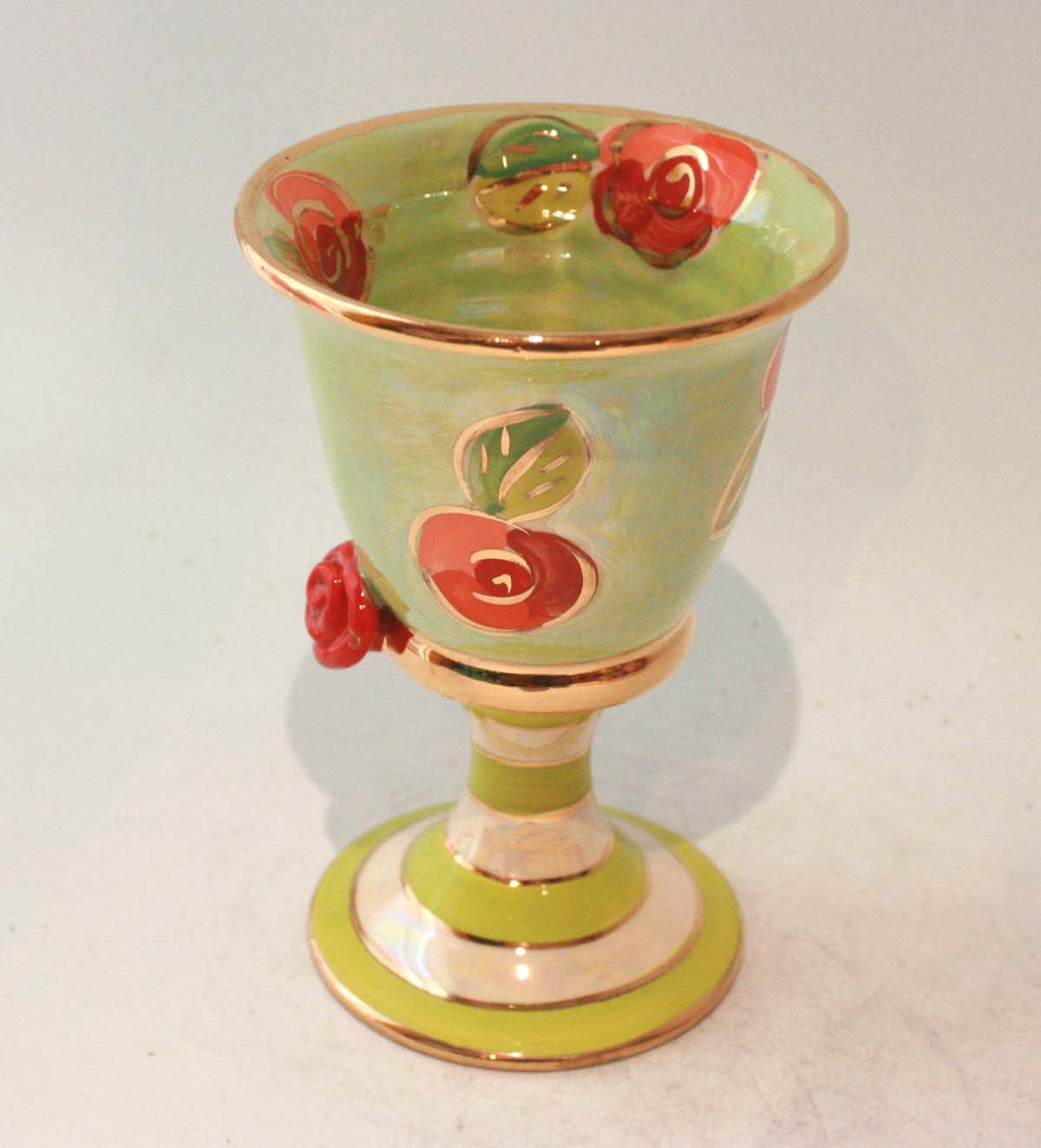Mary Rose's classic Goblet shape is here painted in the prettiest shade of green, with a layer of iridescence and bright Roses to create "Rosebud" design...it stands around 5 inches tall and is completed with stripes of green on its base with accents of 24 carat gold!