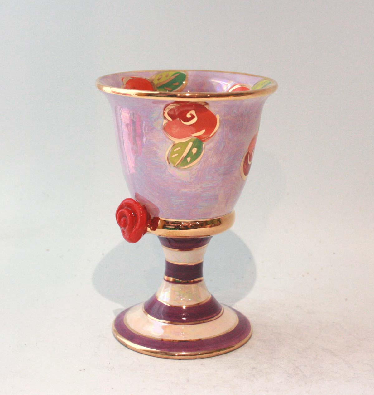 Mary Rose's classic Goblet shape is here painted in a pretty purple, with a layer of iridescence and bright roses to create "Rosebud" design...it stands around 5 inches tall and is completed with stripes of purple on its base with accents of 24 carat gold!
