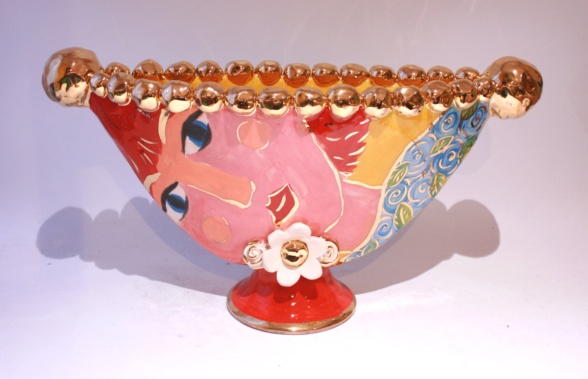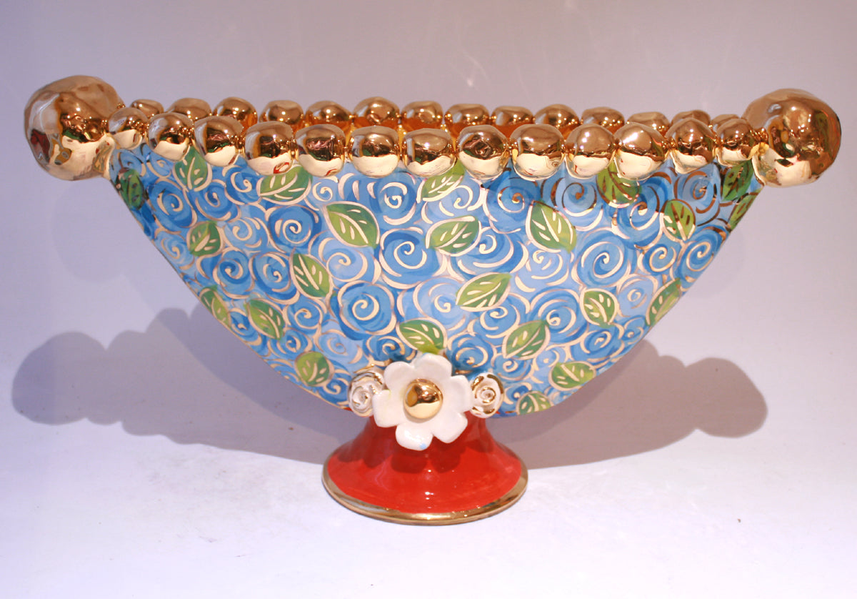This Gondola Bowl measures around 18 inches long and is "Blue Rosebush" on one side, with a beautiful woman painted on the other...it stands on a red plinth that is also encrusted with gold and white flowers. It could be a receptacle for anything you like, and has a row of gold ceramic balls atop its rim...