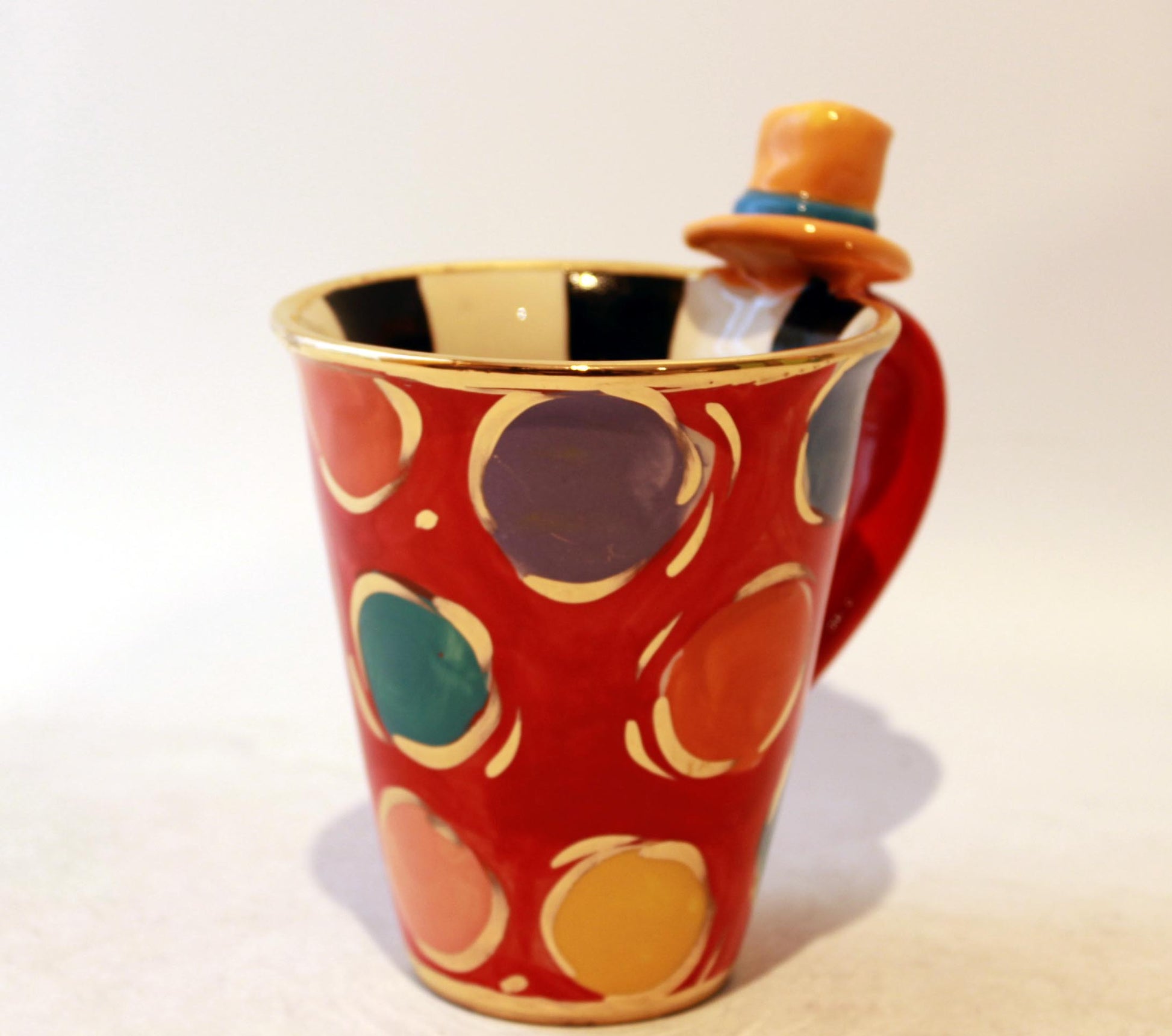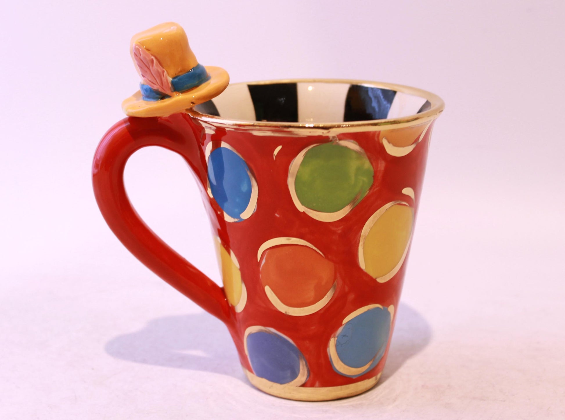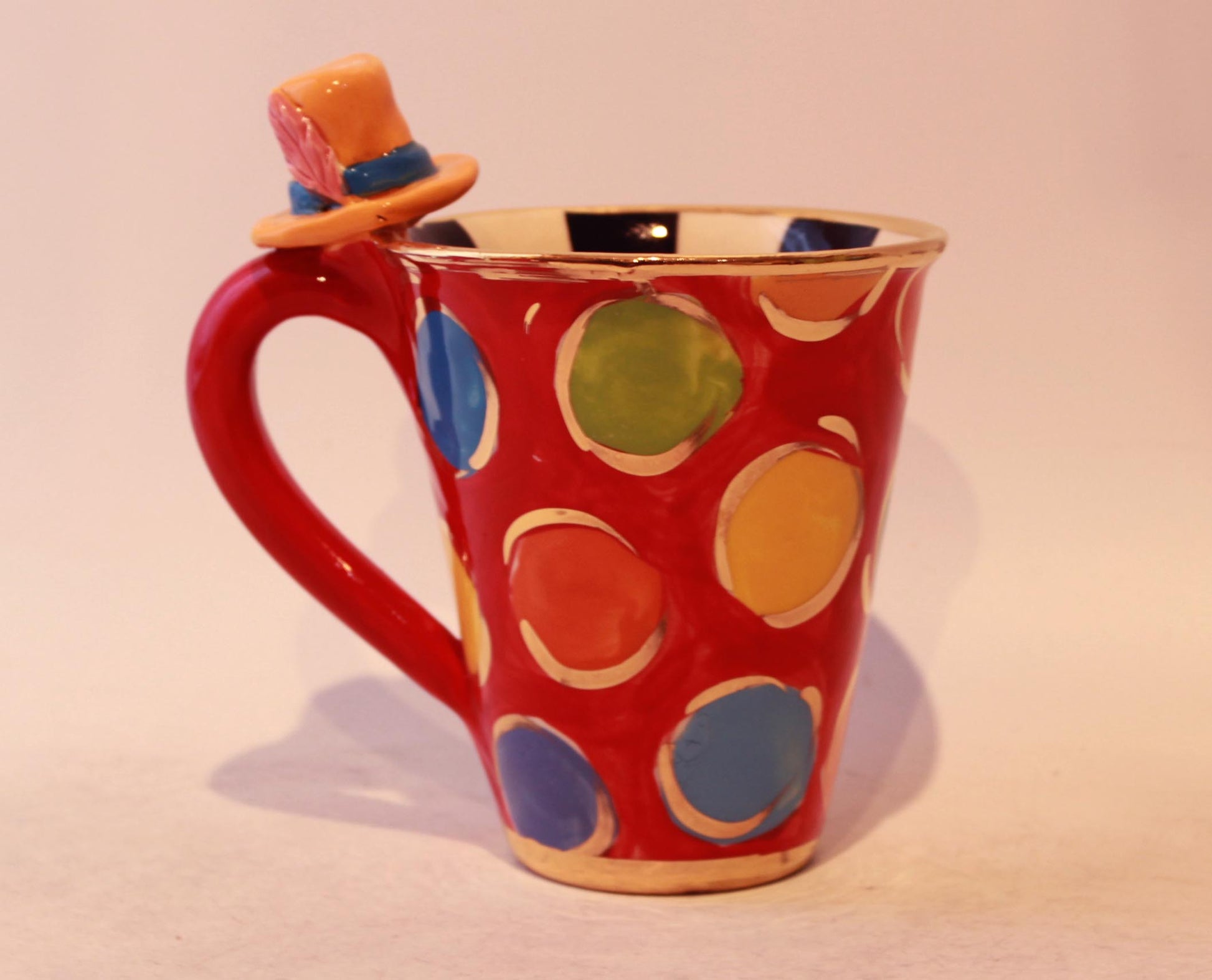 A Large Mug of the kind that can be seen elsewhere on this site except that Mary Rose fashioned a fetching yellow Top Hat and planted it at a jaunty angle on top of the handle of this one. The brim of the hat and the brim of the mug are pretty much in the same place