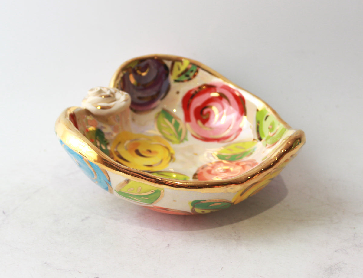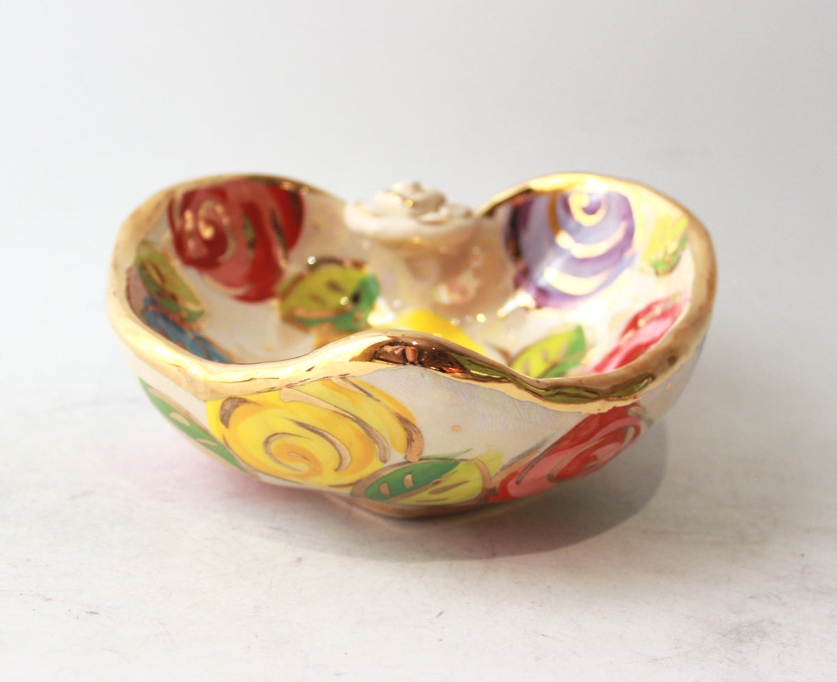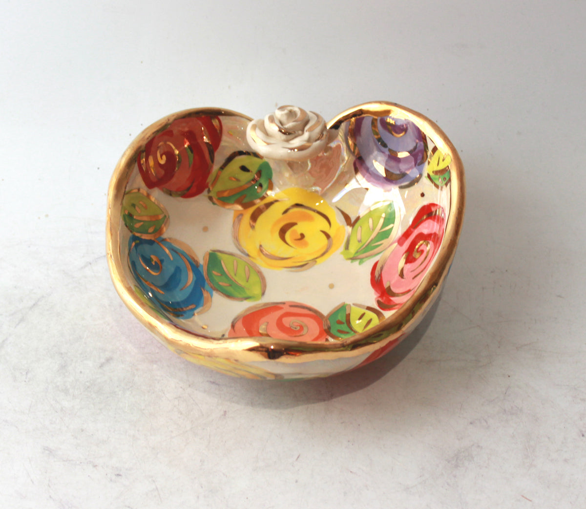 Mary Rose's Heart Shaped Bowls measure around 6 inches in diameter and feature a little ceramic rose at the apex of the heart shape...this one is painted in the very pretty "Pastel Block Rose" design, and is finished with accents of 24 carat gold!