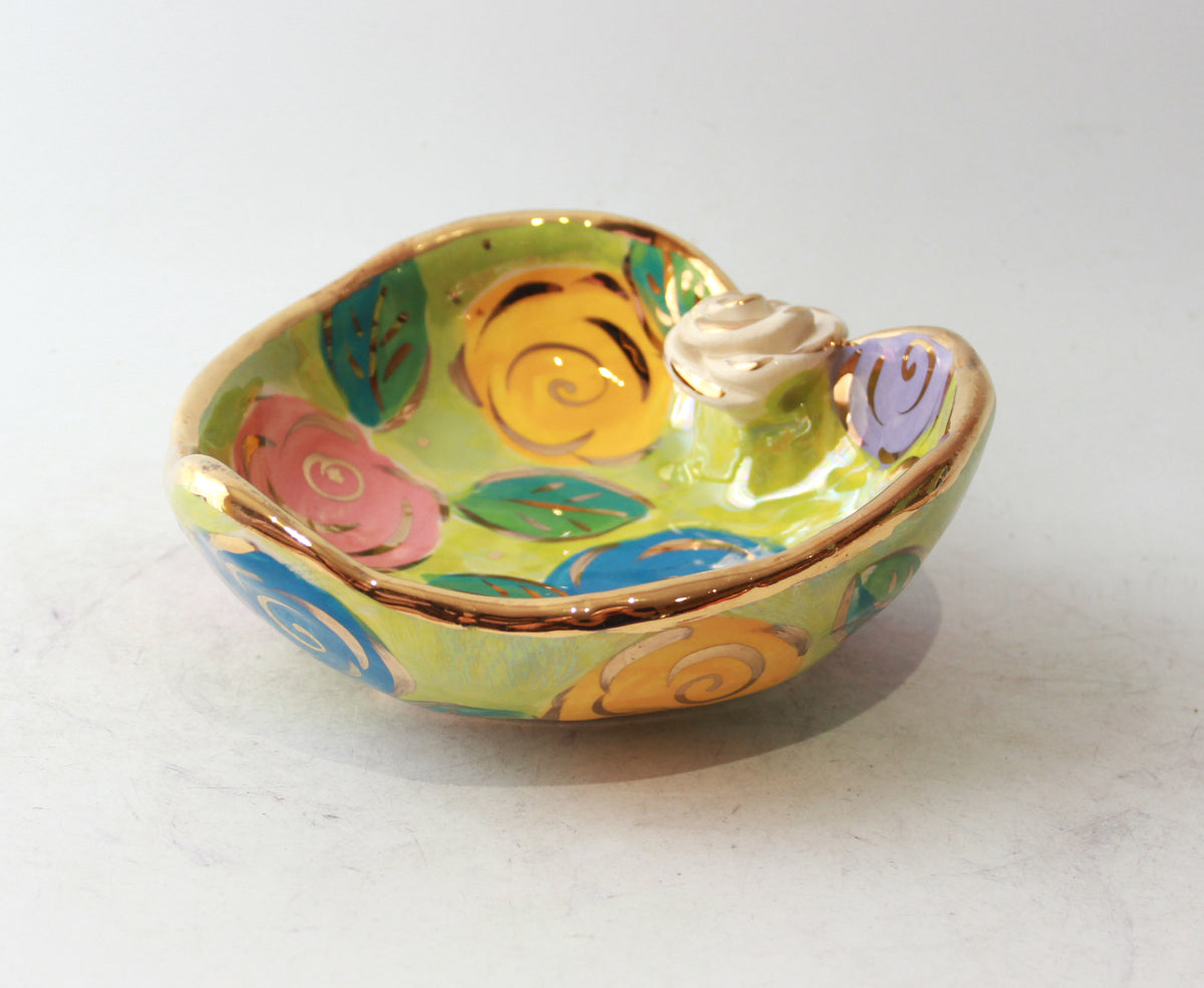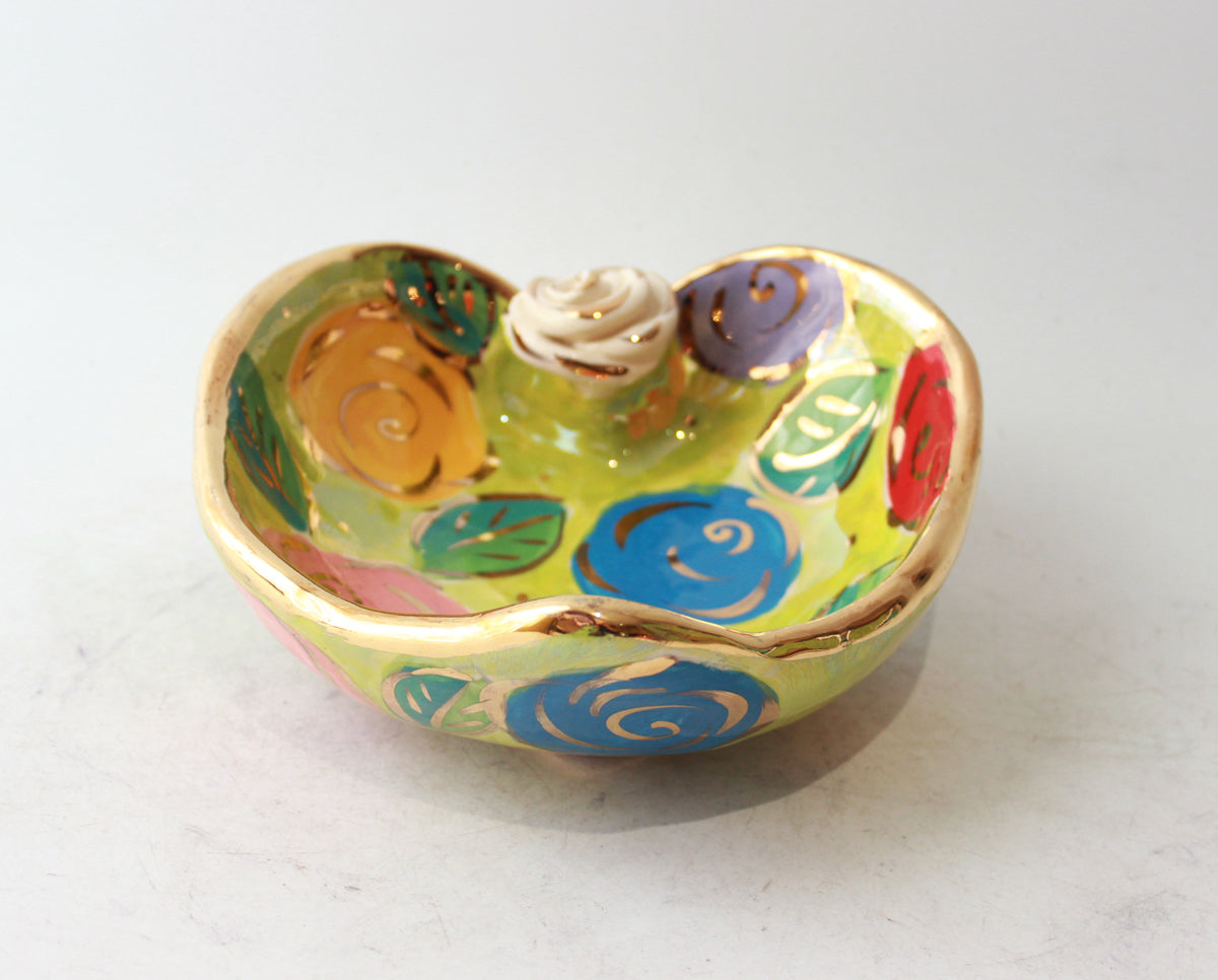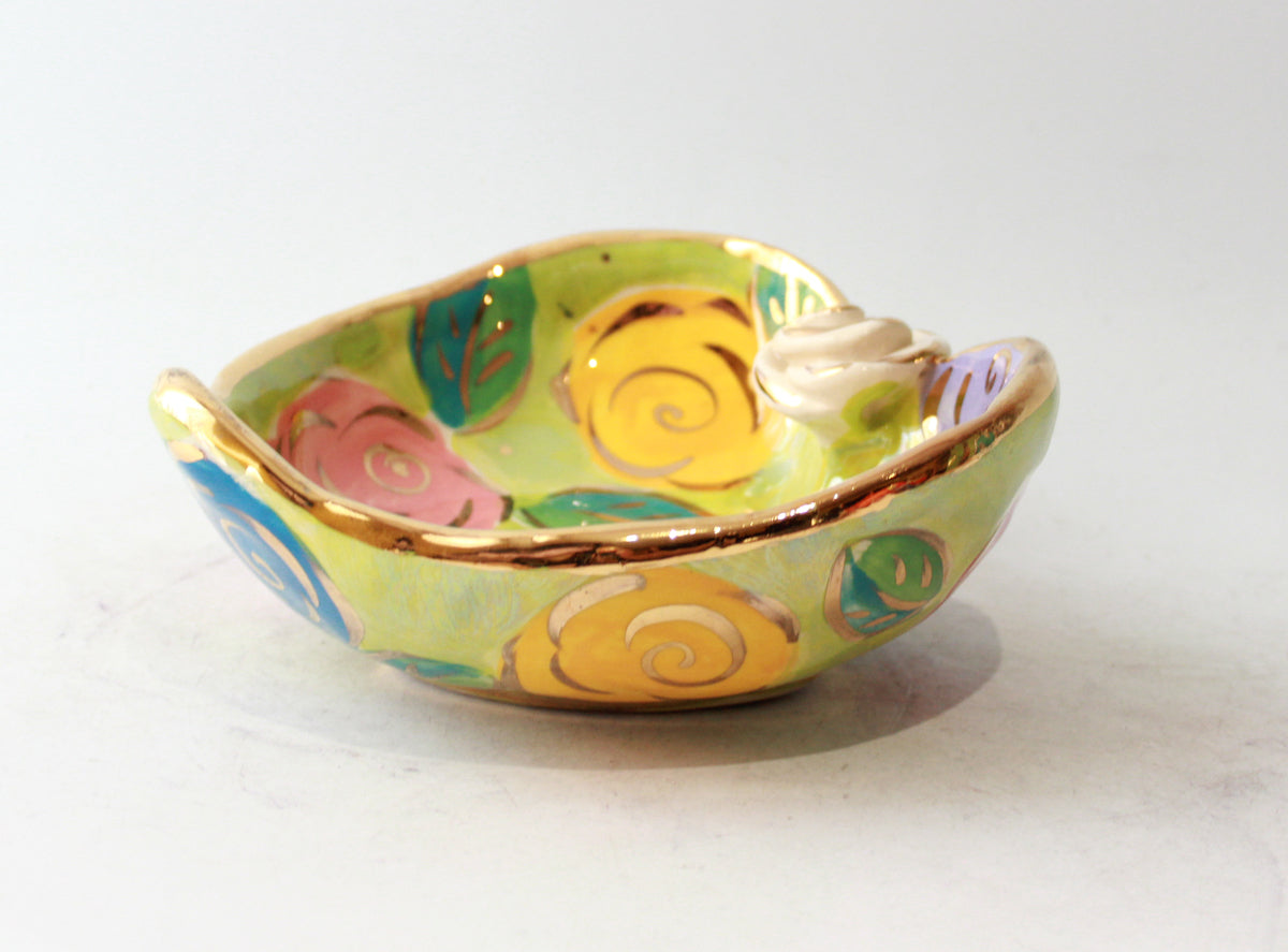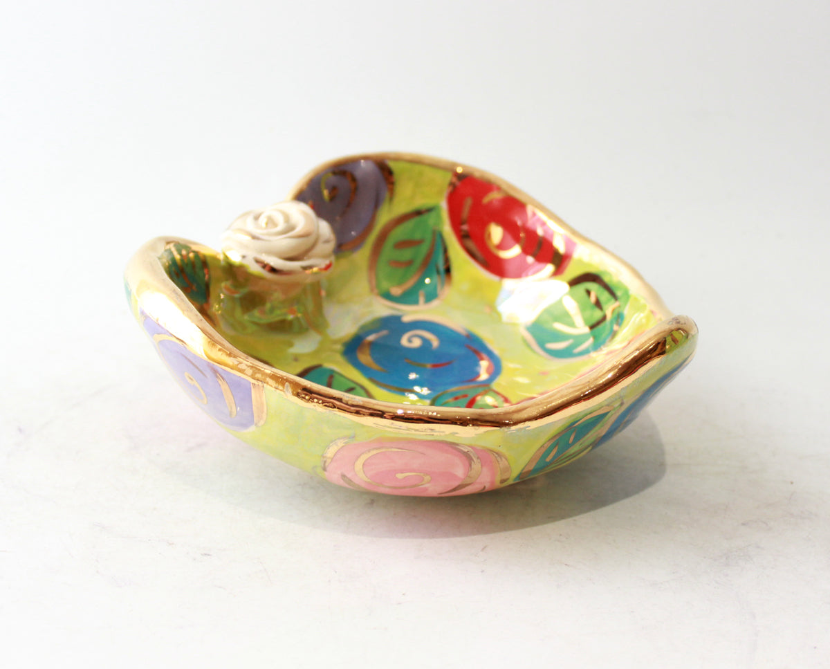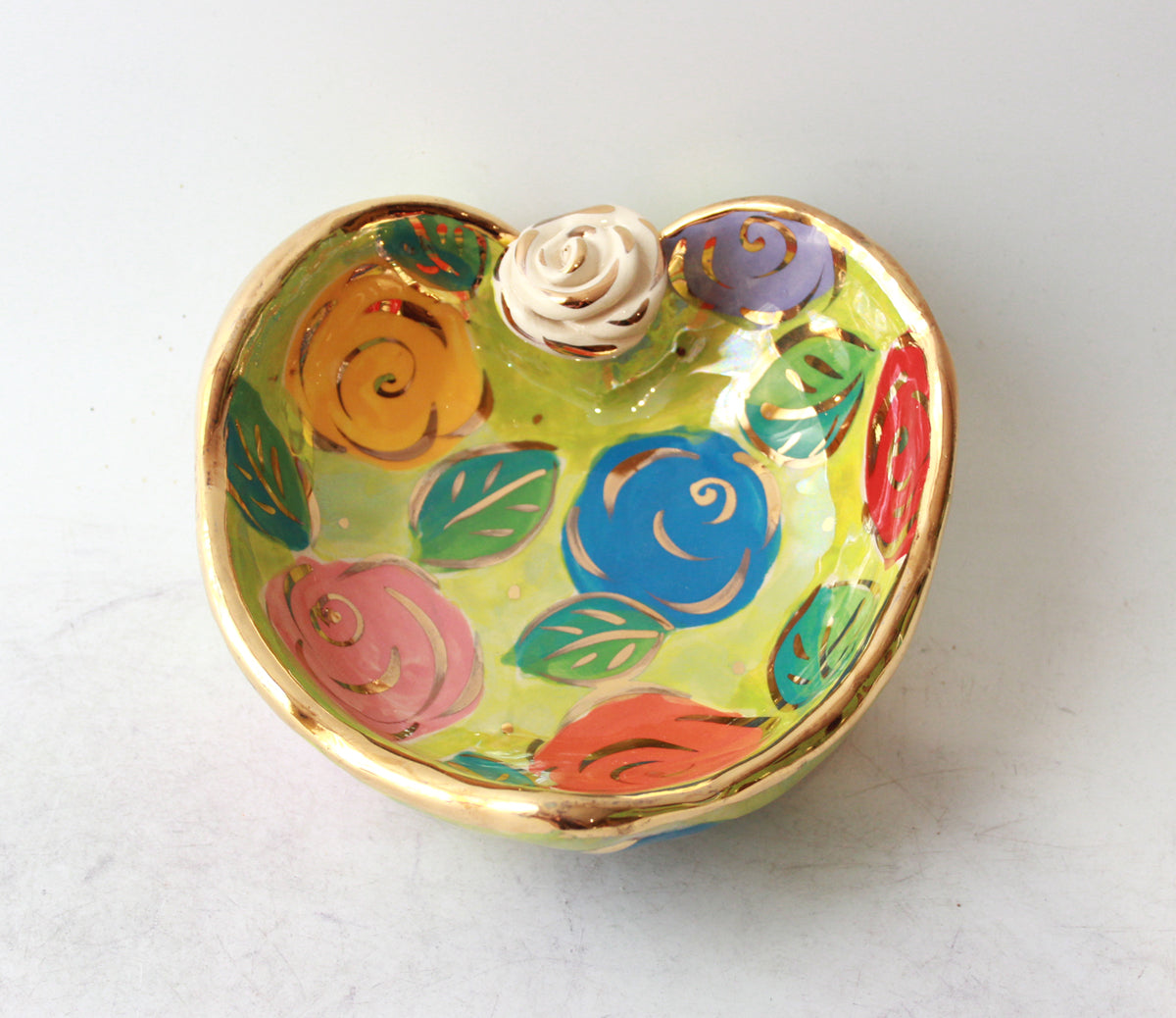 Mary Rose's Heart Shaped Bowls measure around 6 inches in diameter and feature a little ceramic rose at the apex of the heart shape...this one is painted in the very pretty "Pastel Block Rose" on a background of iridescent lime green with accents of 24 carat gold!
