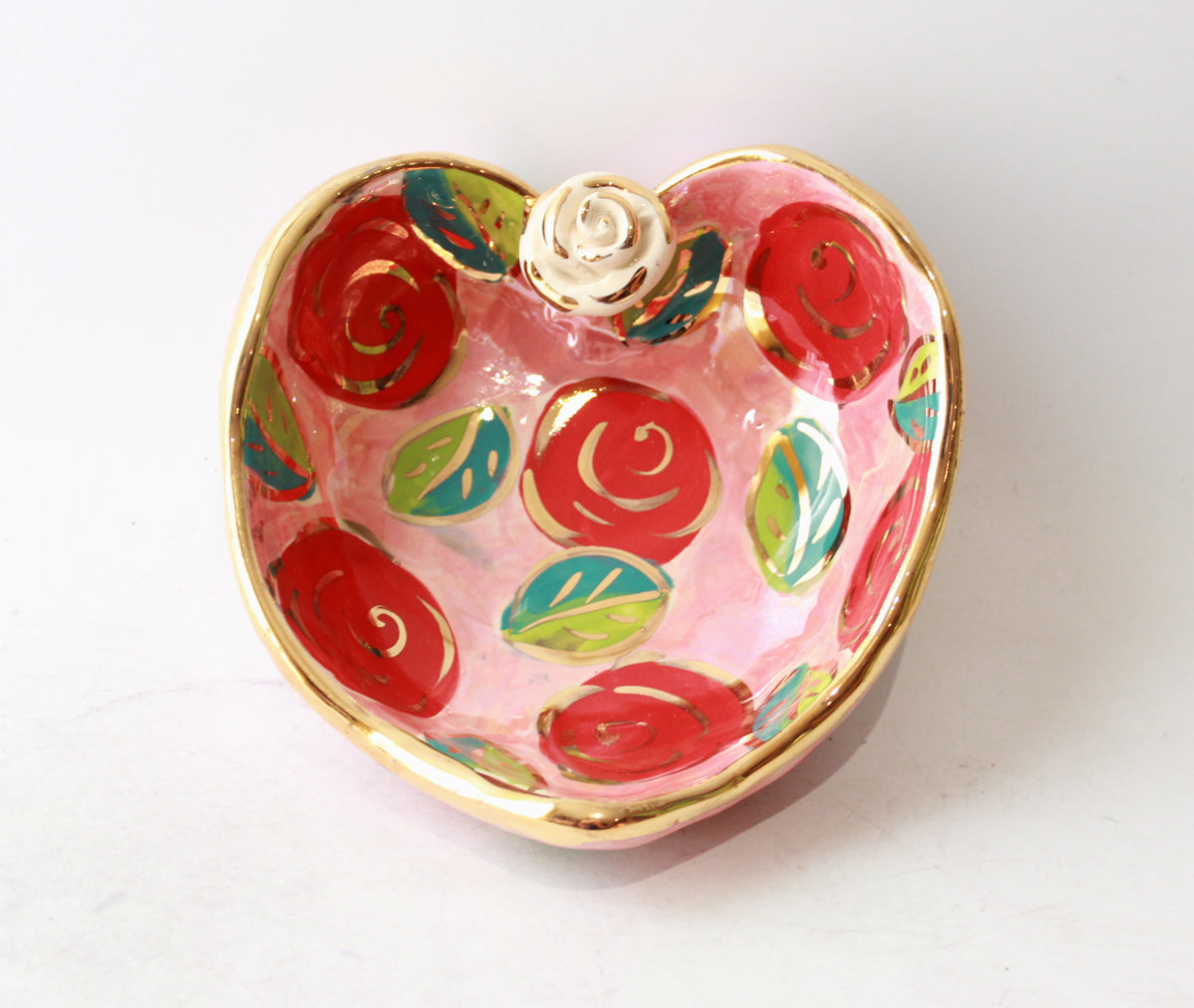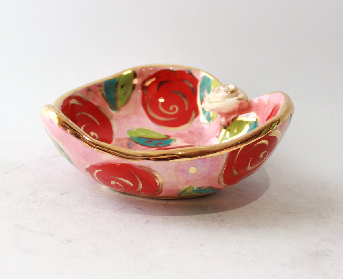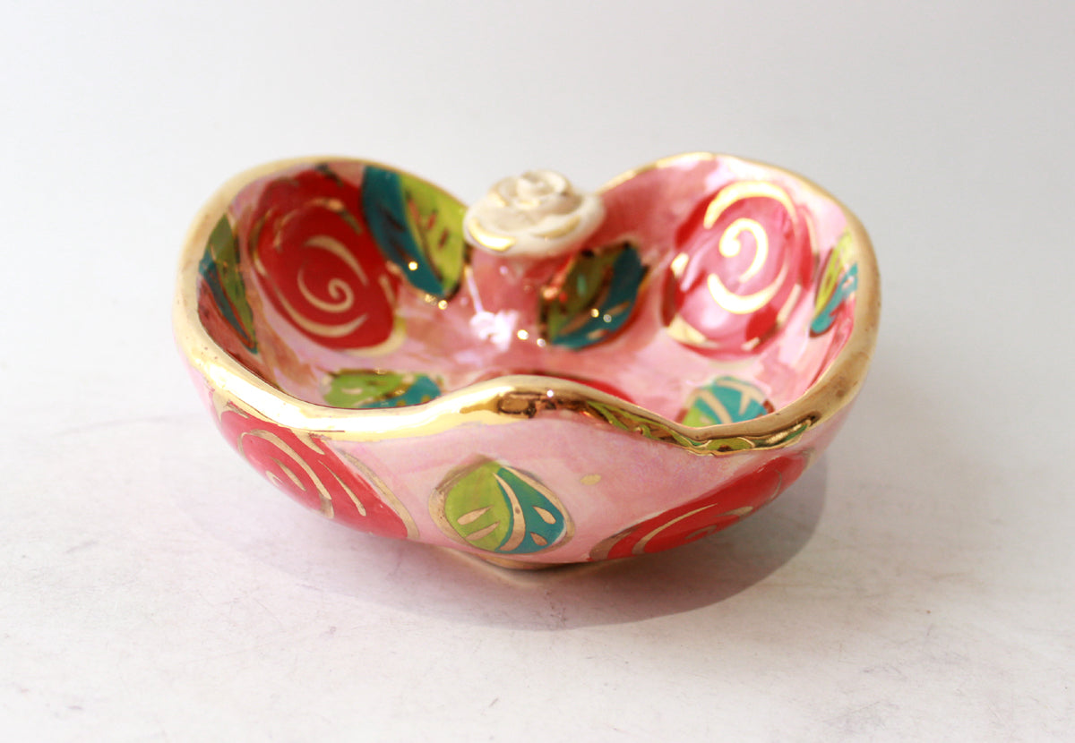 Mary Rose's Heart Shaped Bowls measure around 6 inches in diameter and feature a little ceramic rose at the apex of the heart shape...this one is painted in the very pretty "Rose Red" design on a pink iridescent background completed by accents of 24 carat gold!
