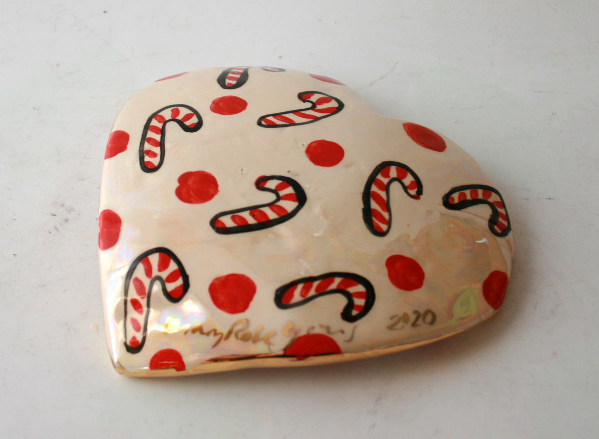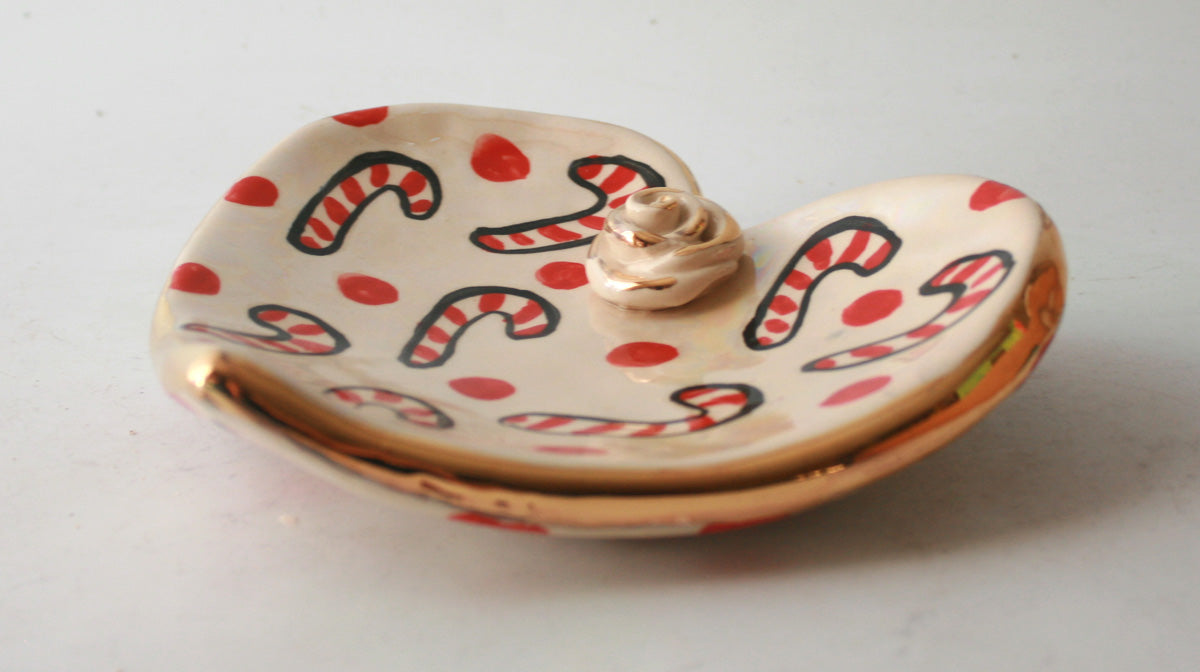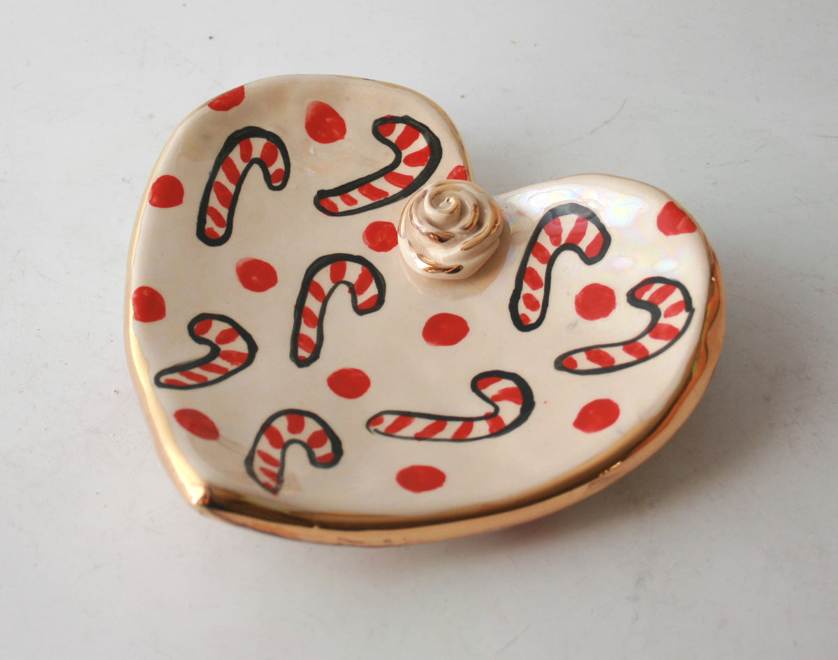 This Heart Shaped Soap Dish has opted for a rather festive look! It is adorned with Candy Canes and matching Red Dots, all on a background of iridescence and a 24 carat gold rim...it measures around 6 inches in diameter and will certainly make you feel all Christmassy