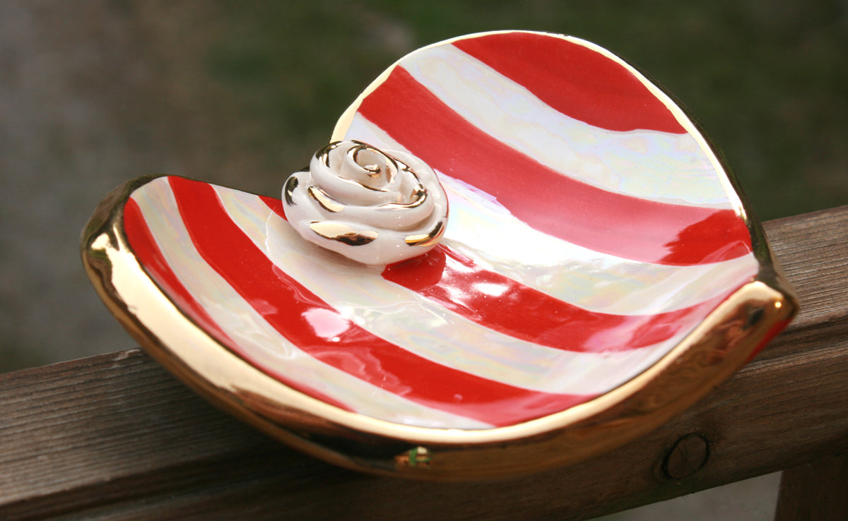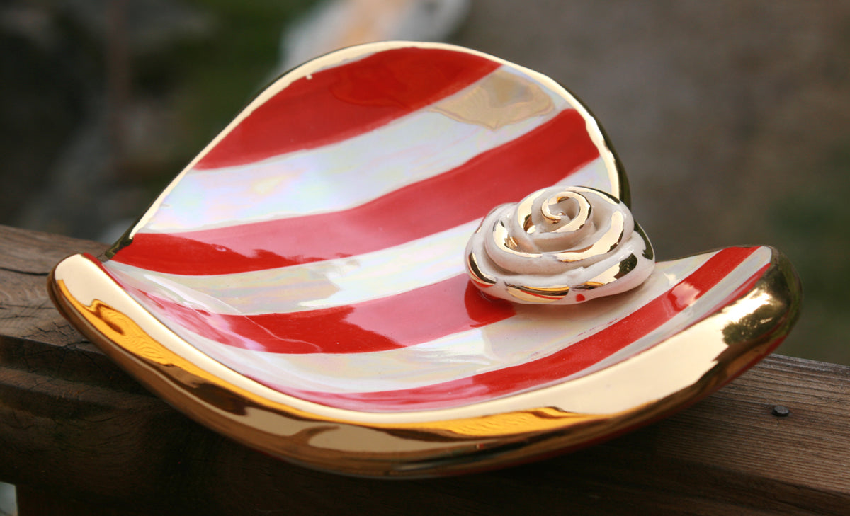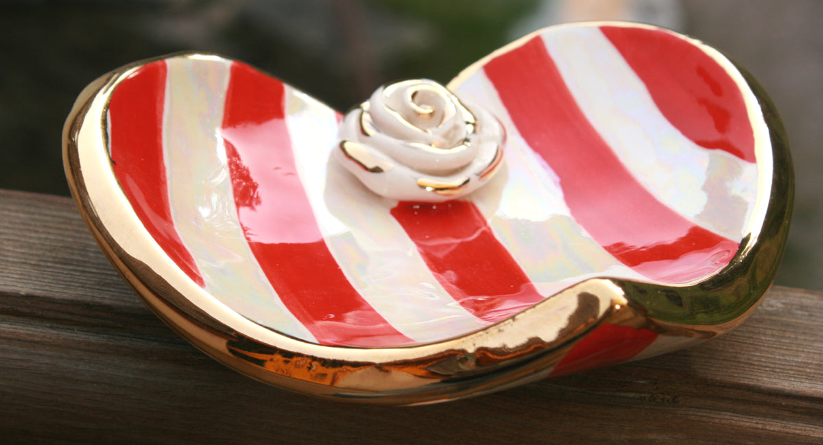 This Heart Shaped Soap Dish has been deliberately curved during its creation to give it a delightful wobble when touched! It is painted in rather eye-catching Red and White Stripes, and finished with a White Rose in its centre that boasts accents of 25 carat gold...