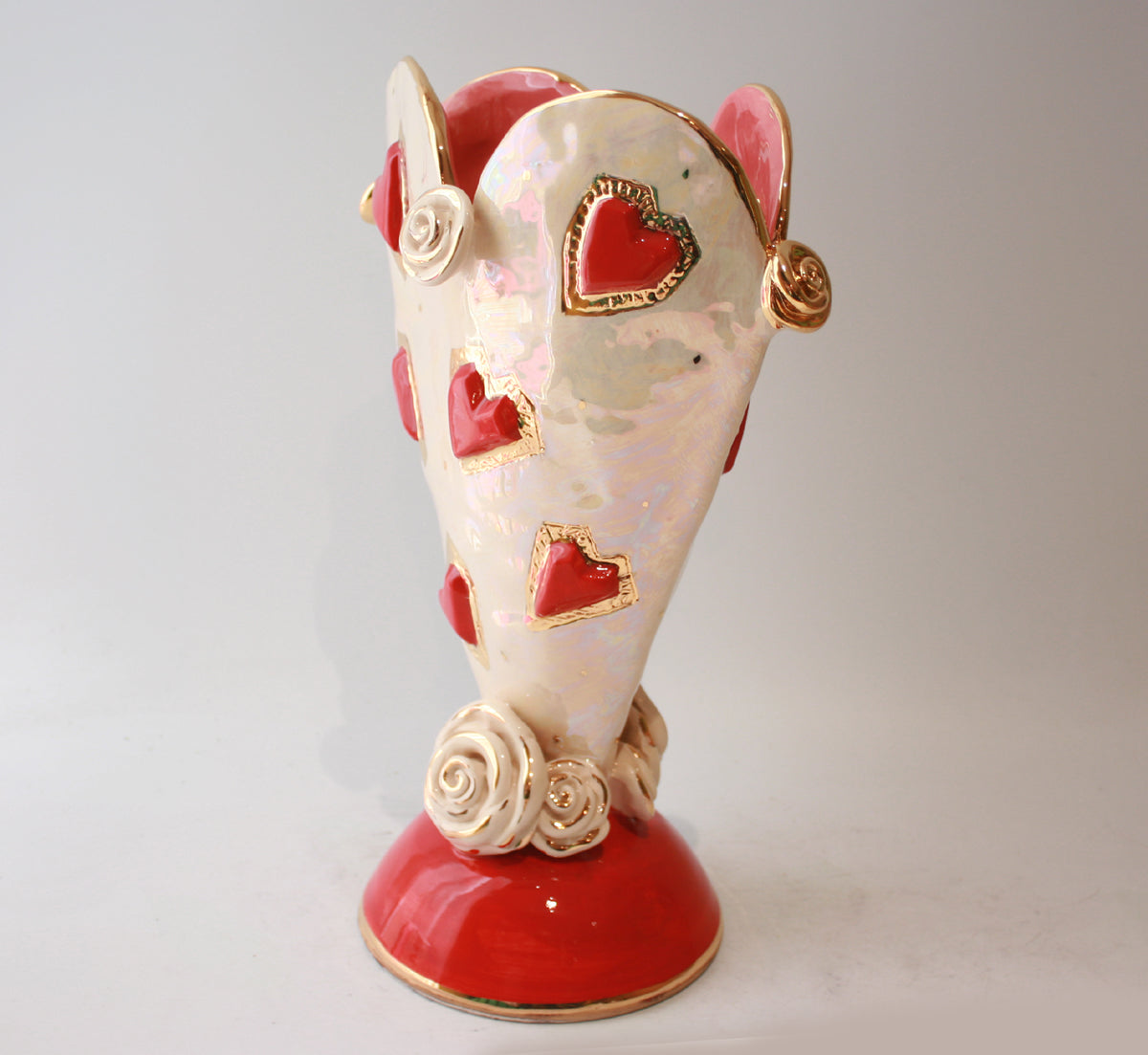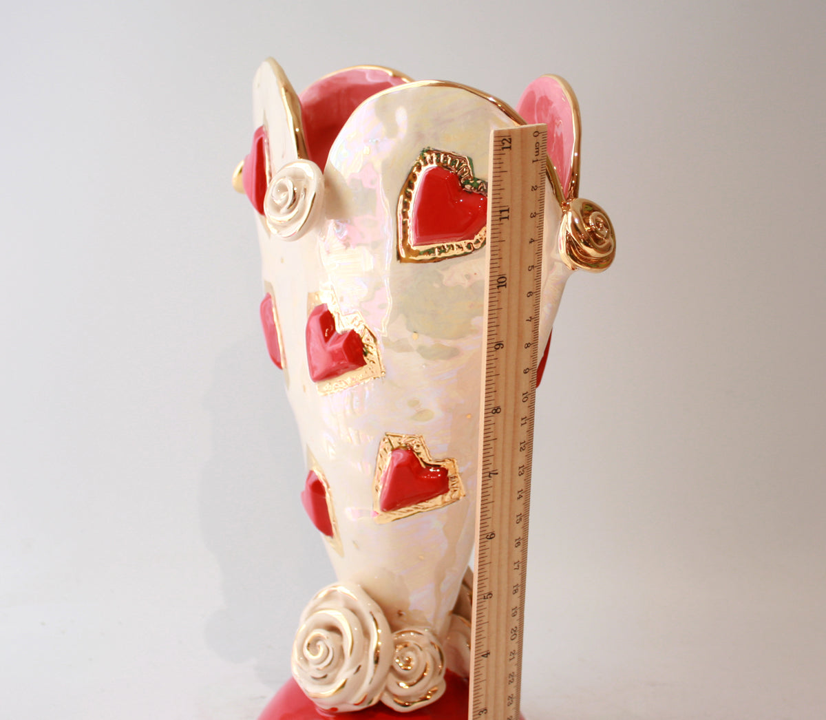 What better way to flatter the one you love than this Heart Shaped Vase which has been studded with ceramic hearts...? The red ceramic hearts are bordered by 24 carat gold and sit on a dreamy iridescent background, and match the base which is also red! There are several ceramic gold and white roses throughout the piece, and the inside is pretty pink...The vase stands over 12 inches tall, and is definitely a statement piece!