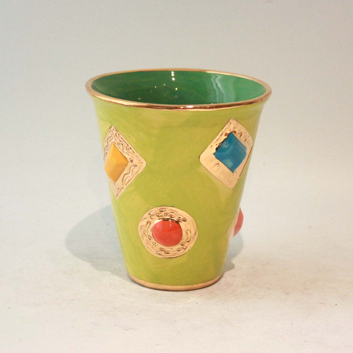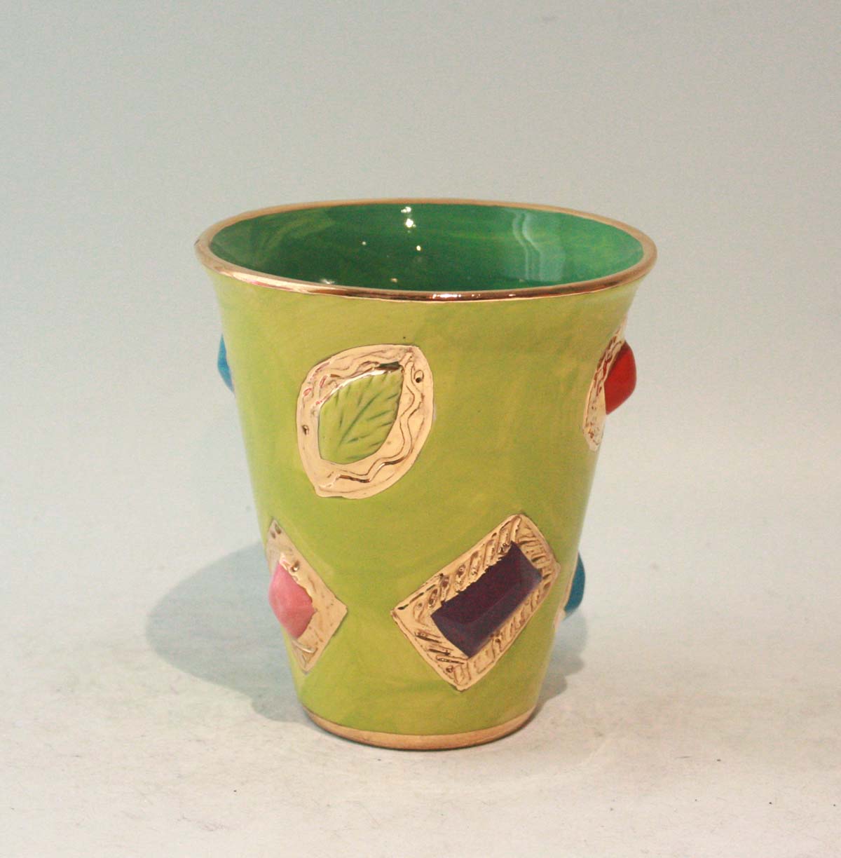 Mary Rose's Beakers are essentially the same as her New Shape Large Mugs, but are without a handle. They are perfect for holding your favourite drink but they also make rather special little Vases...The bright colours of the ceramic jewels contrast with the elaborate gold, and the piece looks like it would be better placed in a scene from Arabian Nights! It stands around 4.5 inches tall and this variation is in green