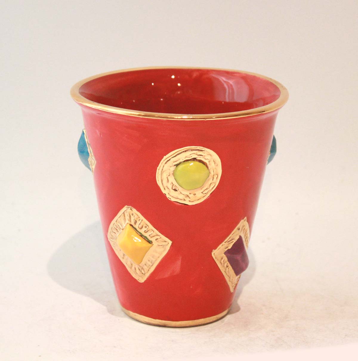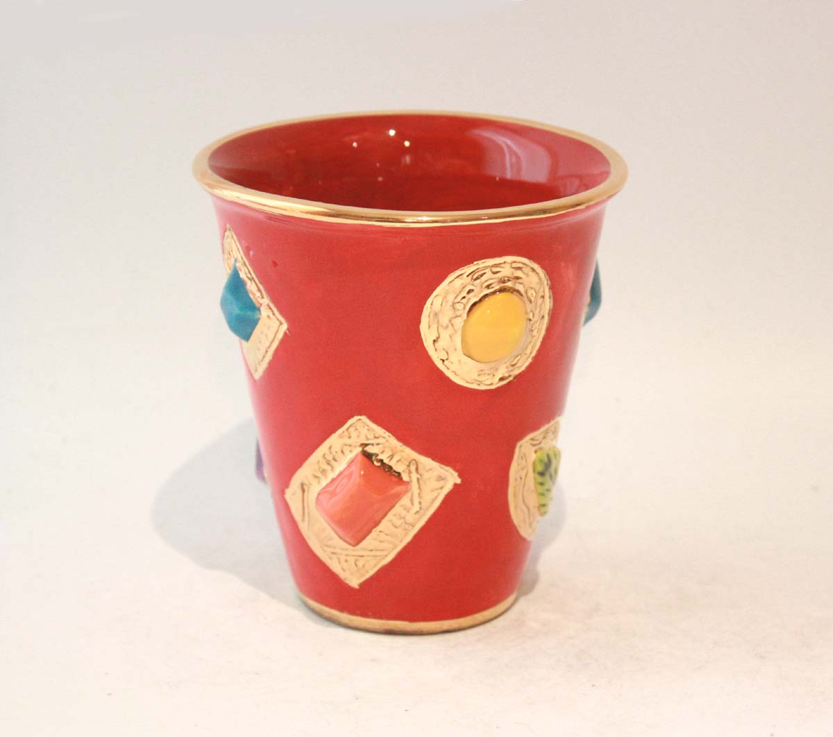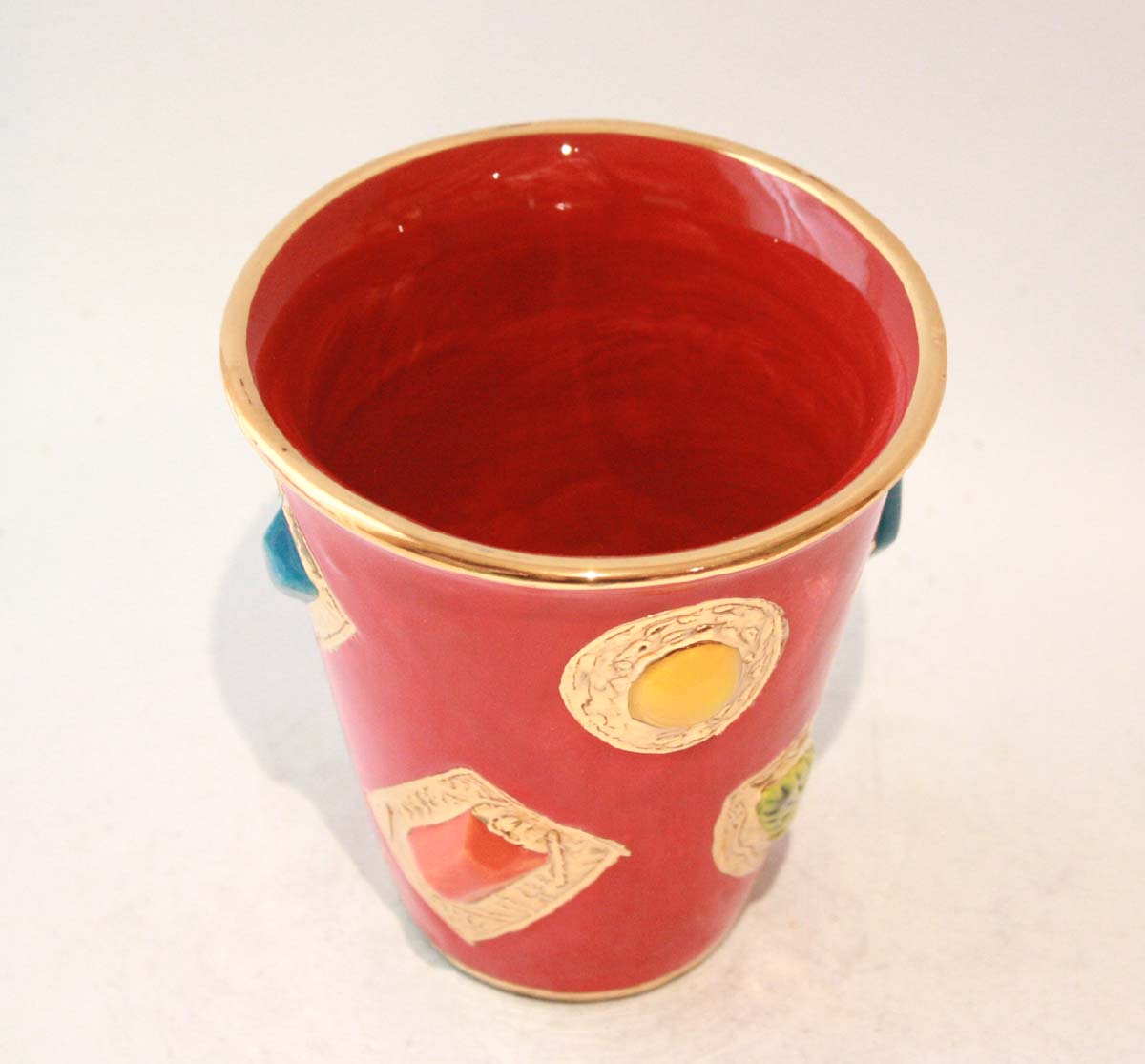 Mary Rose's Beakers are essentially the same as her New Shape Large Mugs, but are without a handle. They are perfect for holding your favourite beverage but also make rather special little vases...The bright colours of the ceramic jewels contrast so beautifully with the 24 carat gold that they would be better placed in a scene from Arabian Nights! They stand around 4.5 inches tall and this one is in Red