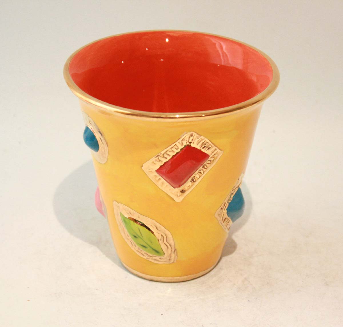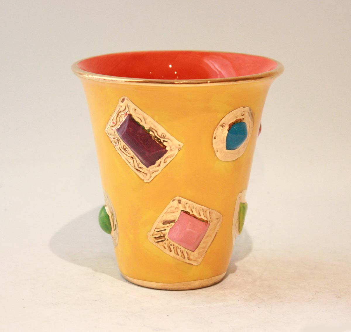 Mary Rose's Beakers are essentially the same as her New Shape Large Mugs, but are without a handle. They are the perfect receptacle for your favourite drink but also make rather special little vases...the bright colours of the ceramic jewels contrast with the elaborate gold, and the piece looks like it would be better placed in a scene from Arabian Nights! This one is in yellow and stands around 4.5 inches tall...