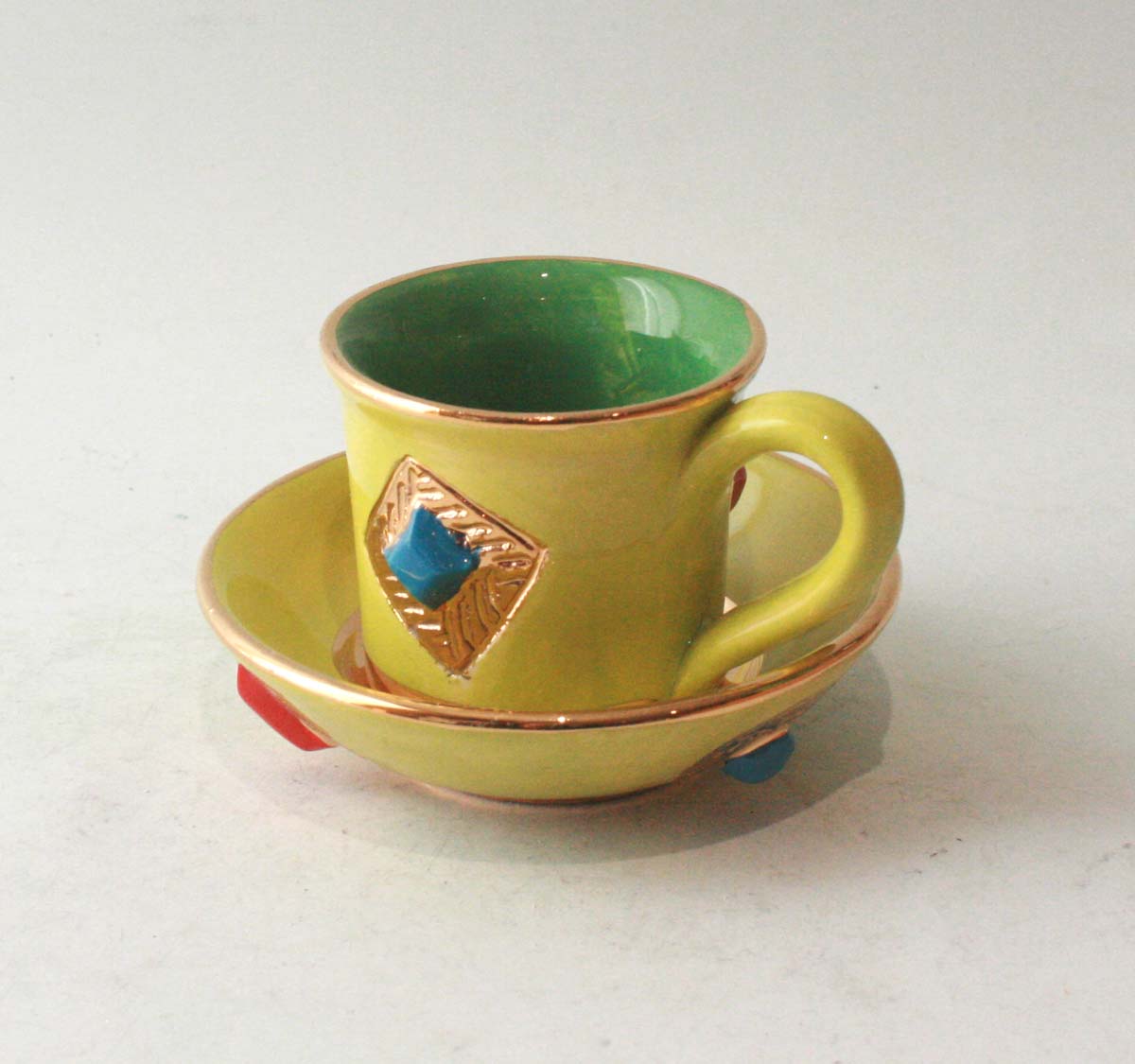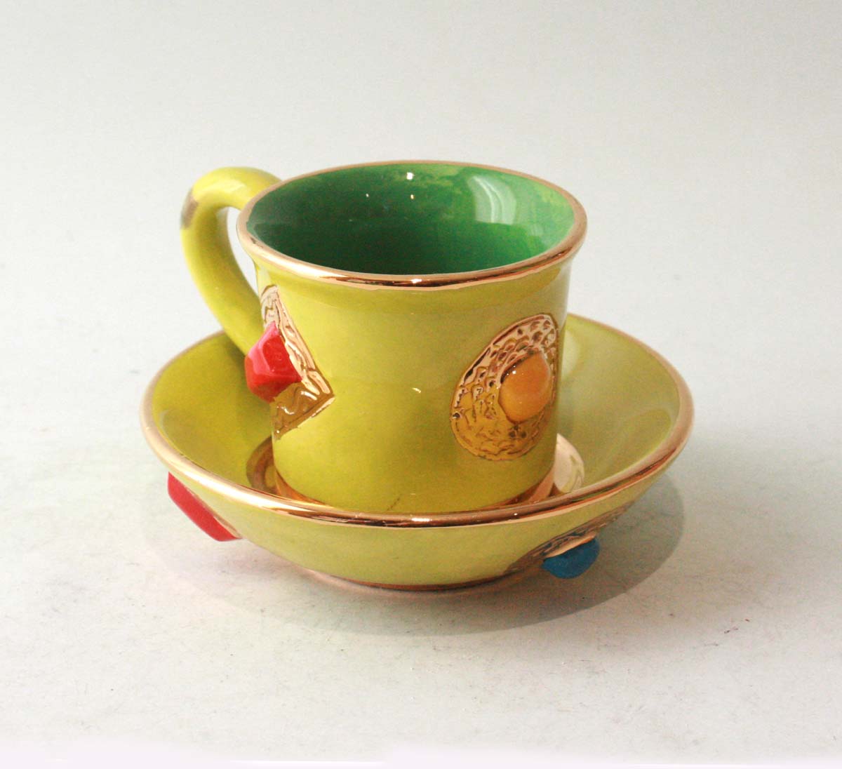 This little Cup and Saucer is the perfect size for your morning espresso, it stands nearly 3 inches tall and is painted in dark green on the inside with a lighter green outside...it is adorned with ceramic jewels of all different colours which are set with 24 carat gold to match its base and rim