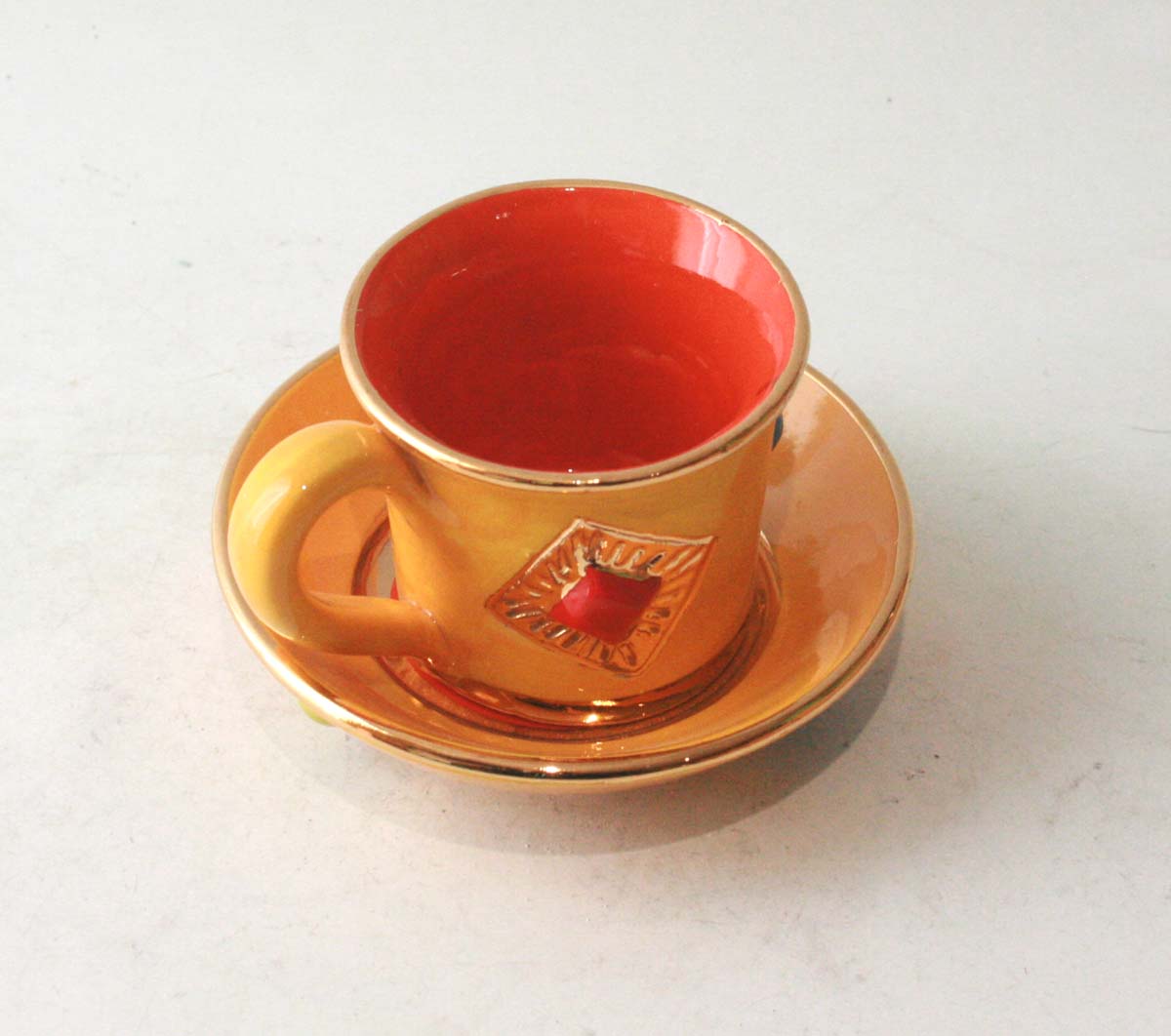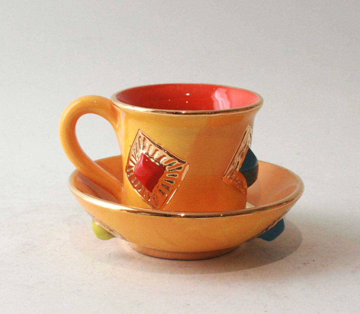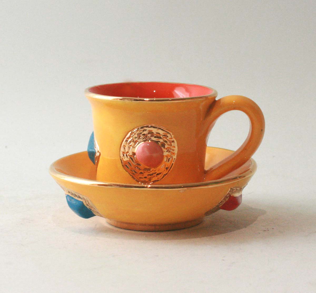 This little Cup and Saucer is the perfect size for your morning espresso! It is painted in orange inside to match the pretty yellow colour on the outside and has been lovingly adorned with colourful ceramic jewels...these have been set by 24 carat gold and the piece stands nearly 3 inches tall