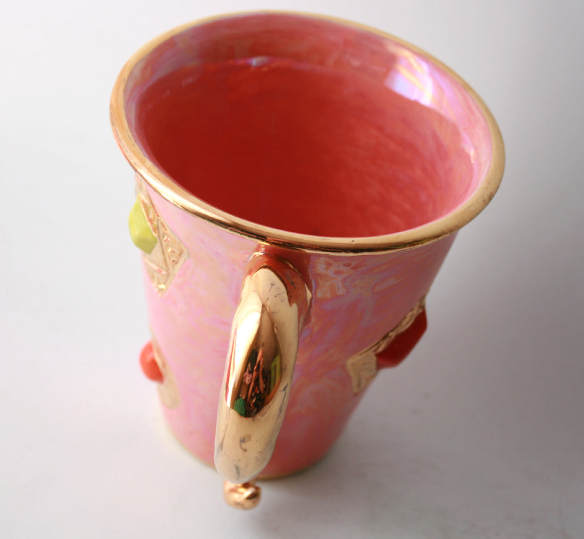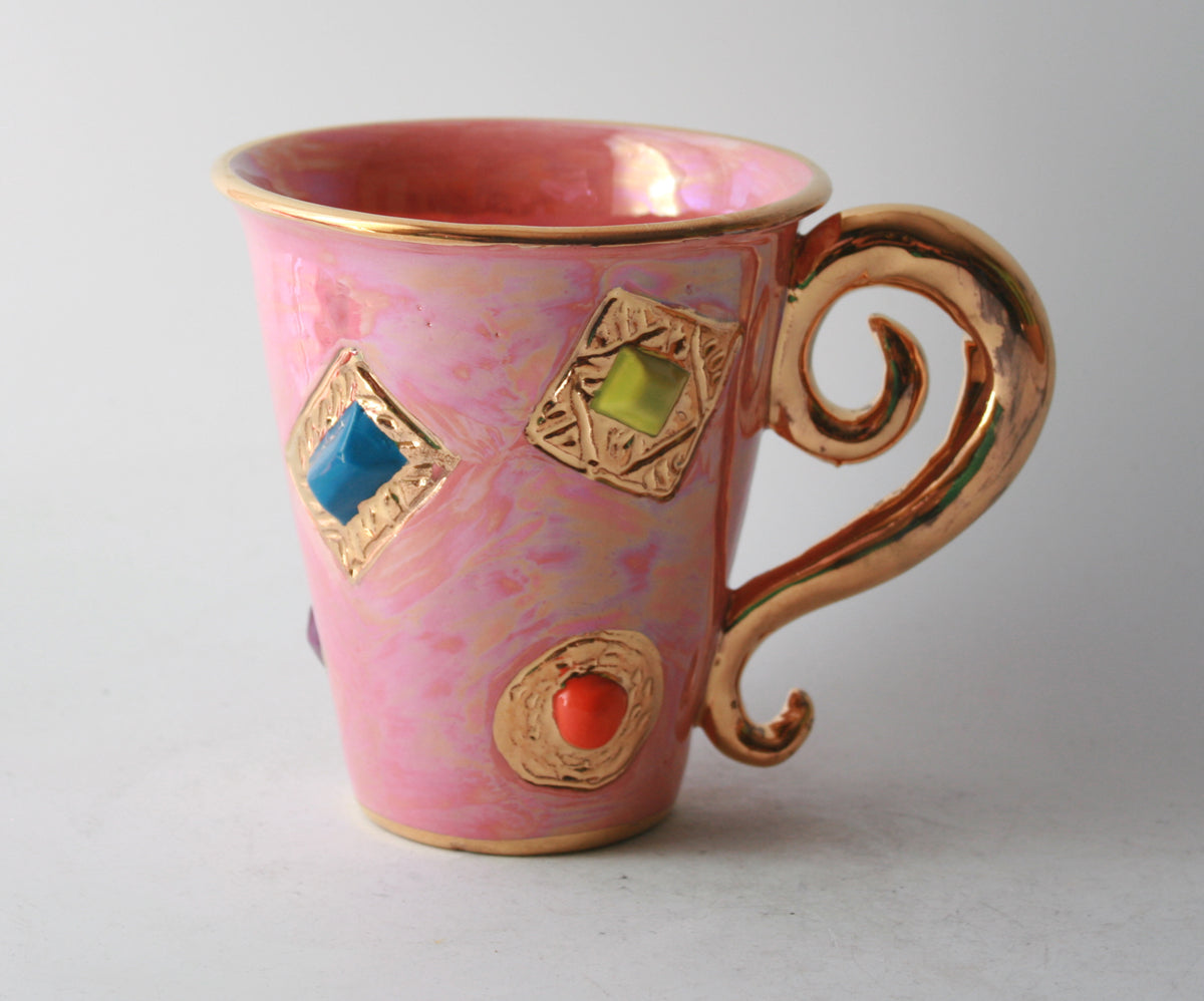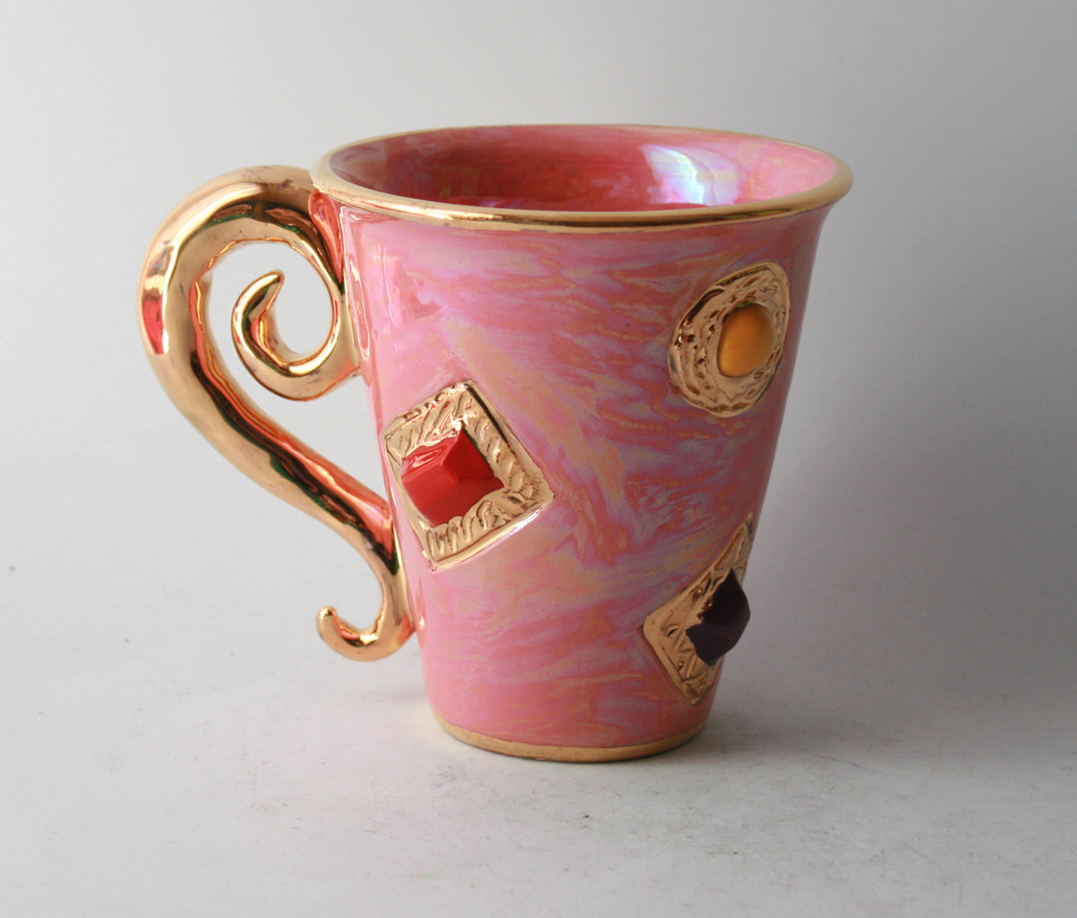 Mary Rose's Tea Mugs are great for a good helping of a beverage...this one is looking particularly fancy with ceramic Jewels encrusting its surface on a background of beautiful iridescent pink, with a 24 carat gold "Lady Gaga" handle that really makes it something to behold!