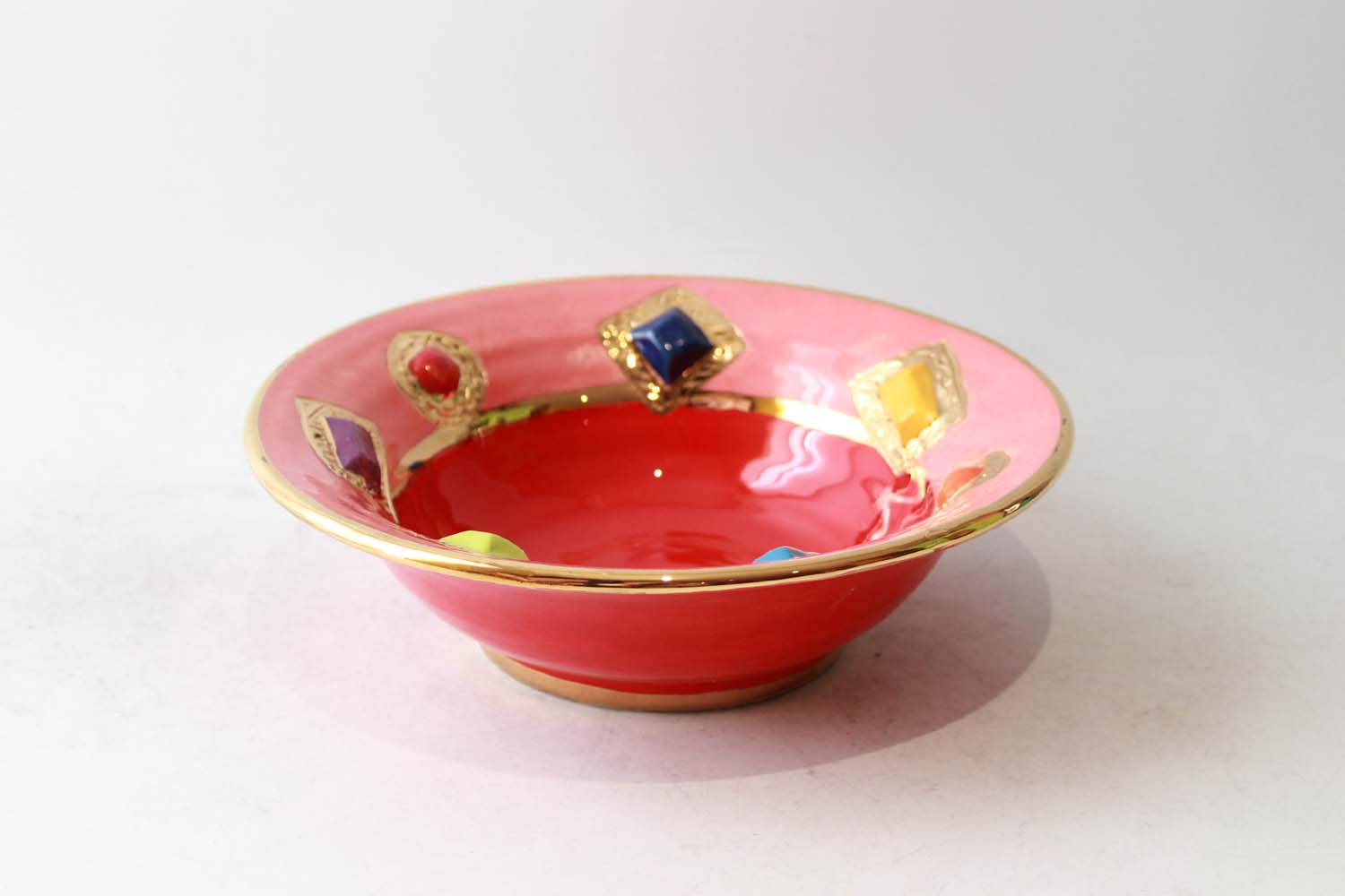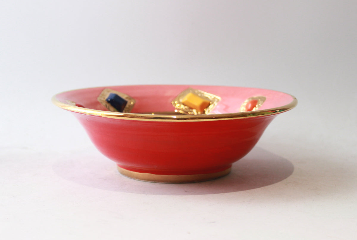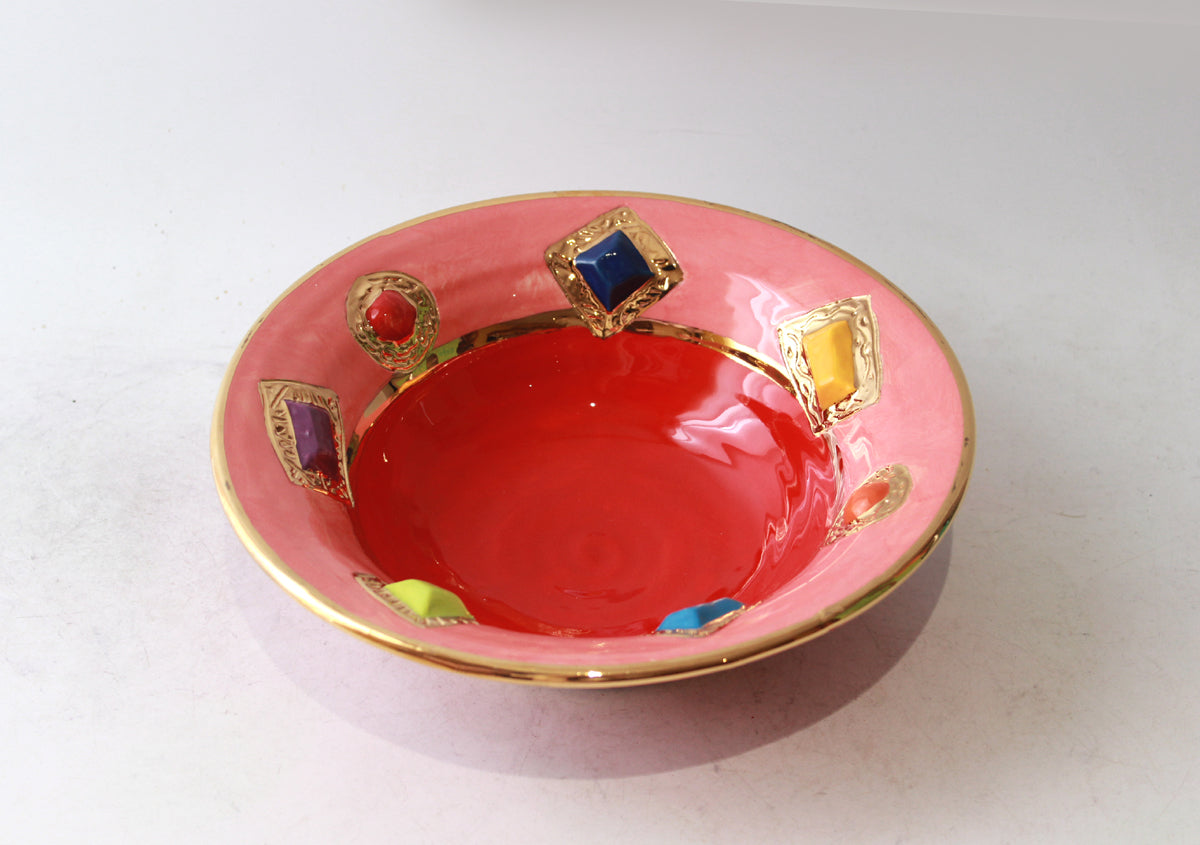 This particular Bowl has such a shape that gives it the name "Pasta Bowl", as that is what it would be perfect for! This variation has had 24 carat gold encircled ceramic "Jewels" embedded into its surface, and would make for a very regal Spaghetti Bolognese indeed!