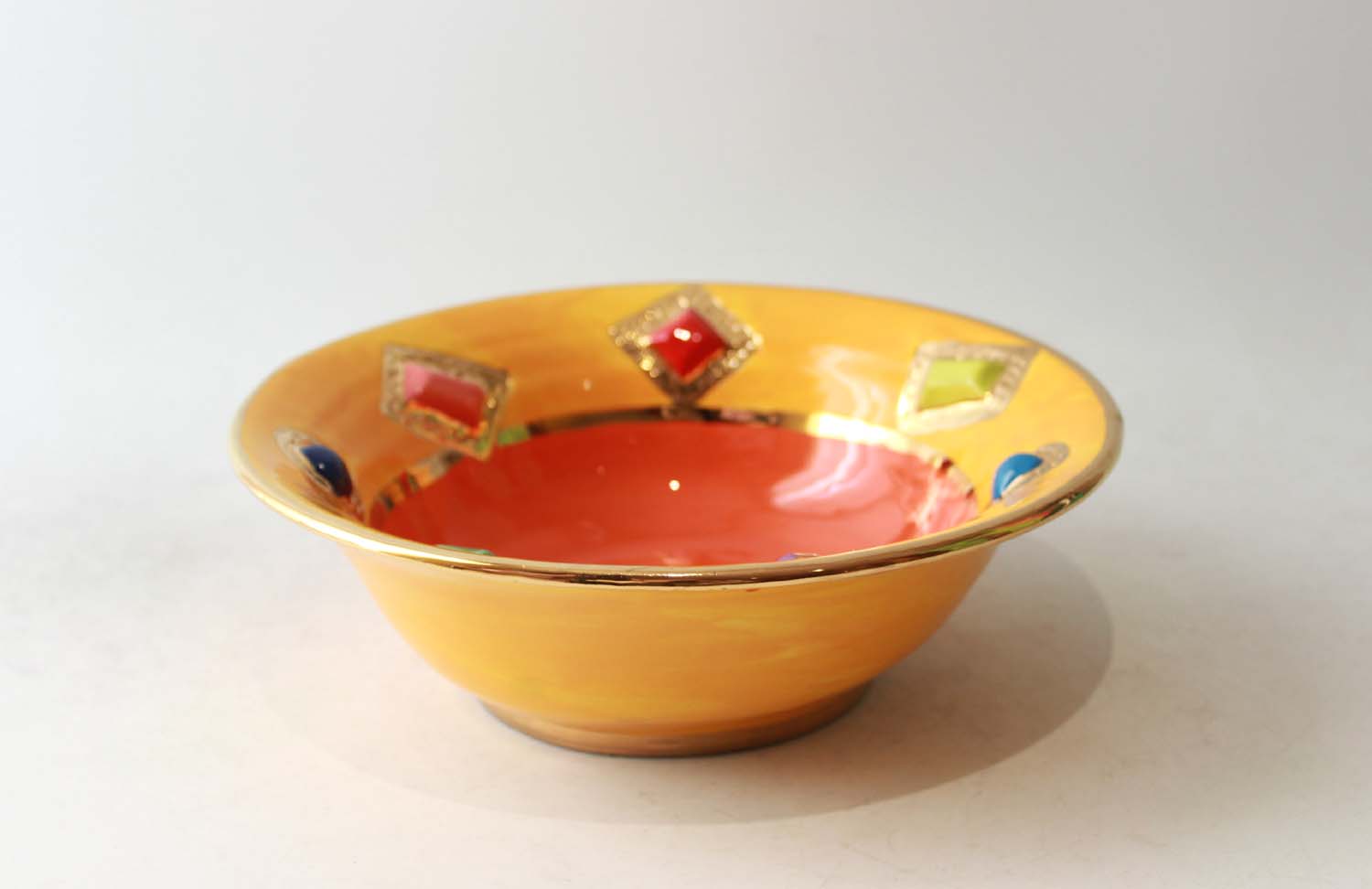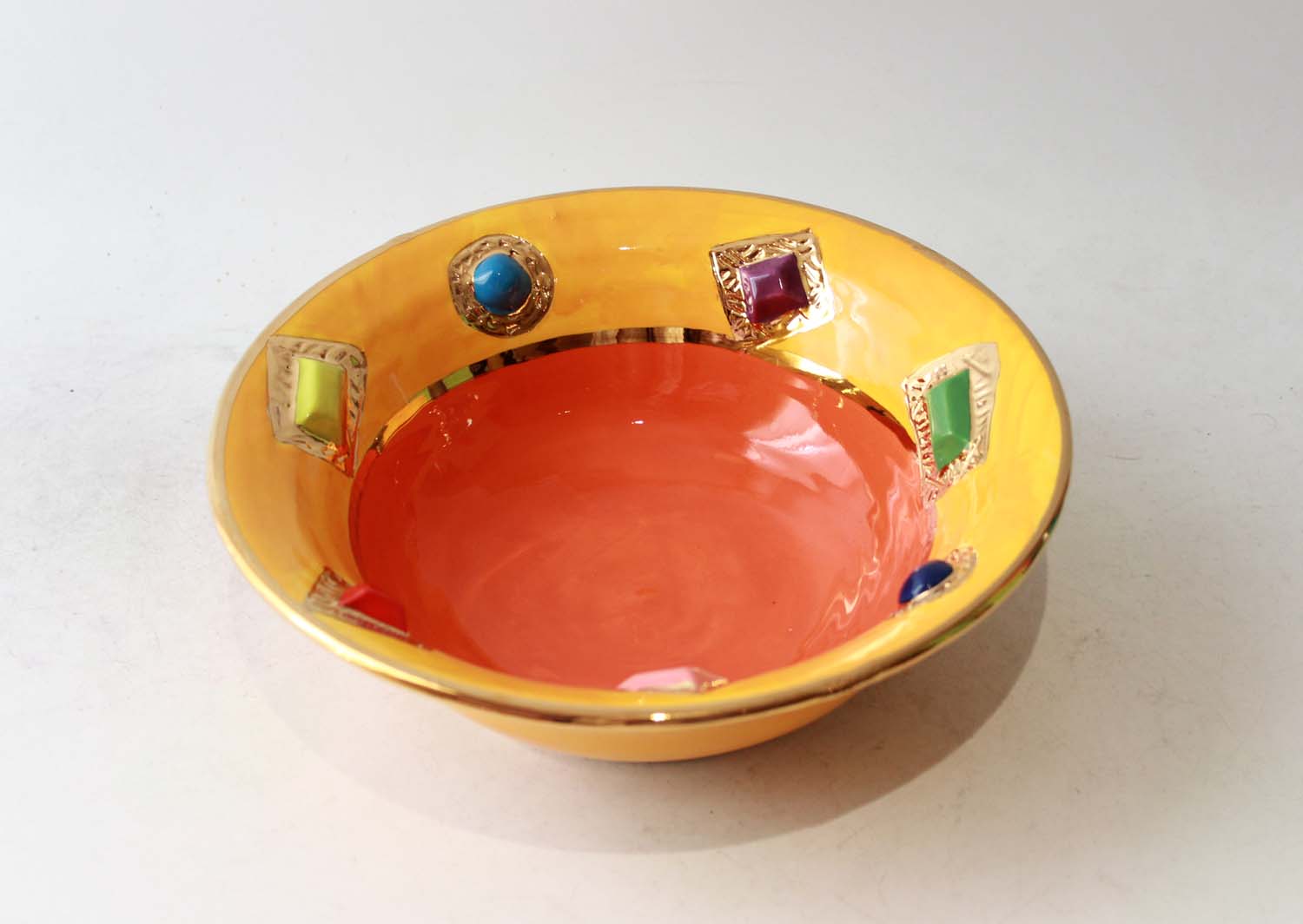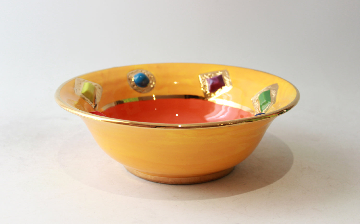 This particular Bowl has such a shape that gives it the name "Pasta Bowl", as that is what it would be perfect for! This variation has had 24 carat gold encircled ceramic "Jewels" embedded into its surface, and would make for a very regal Spaghetti Bolognese indeed!
