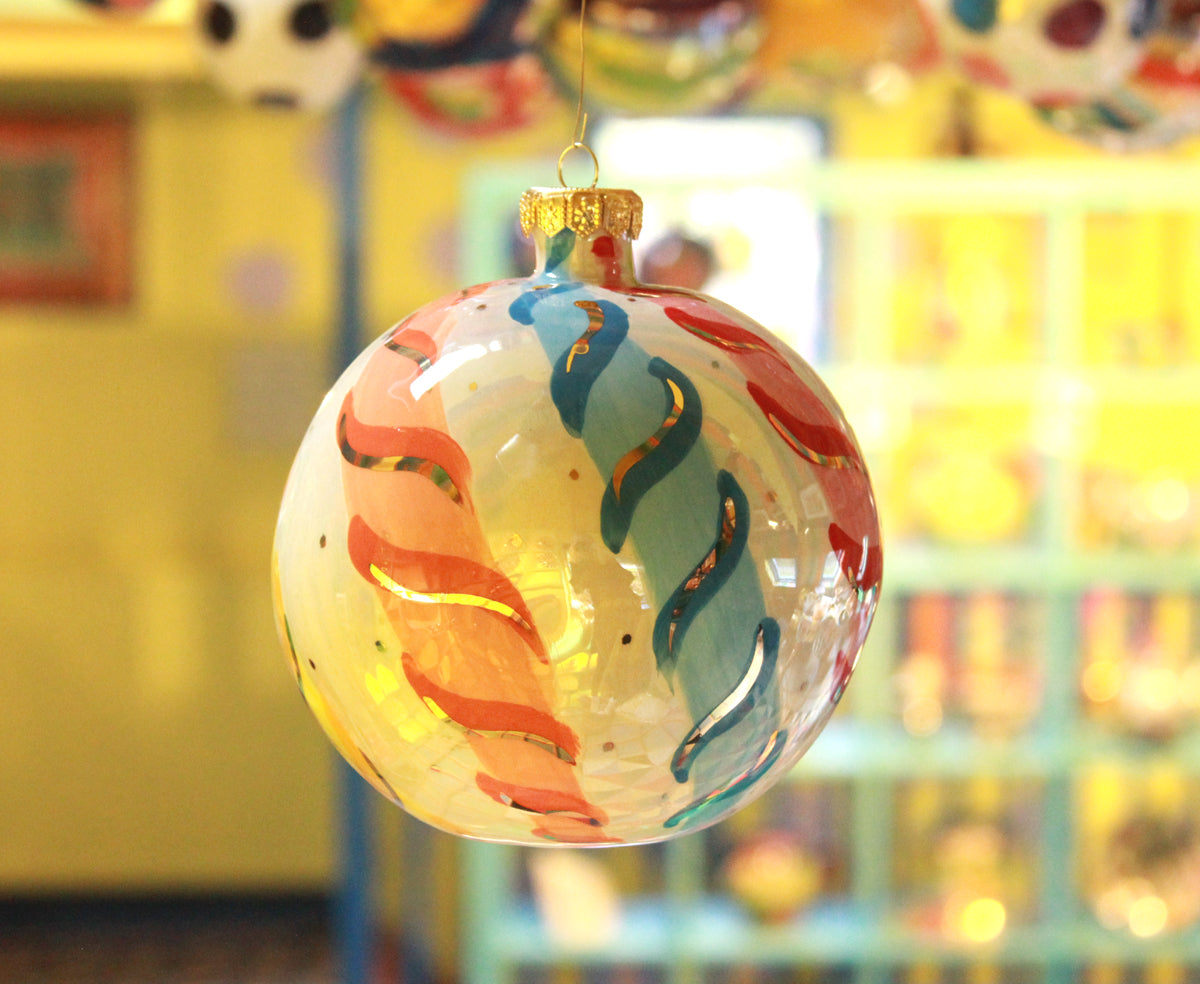Mary Rose's Christmas Ornaments come in two sizes...This one is slightly larger than the standard size, measuring around 5 inches from top to bottom! It is painted in the festive and yet colourful "Candy Cane Stripe" design on a shimmering mother of pearl background and accents of 24 carat gold throughout... the ornaments come with a cap to make them easy to hang wherever you choose!