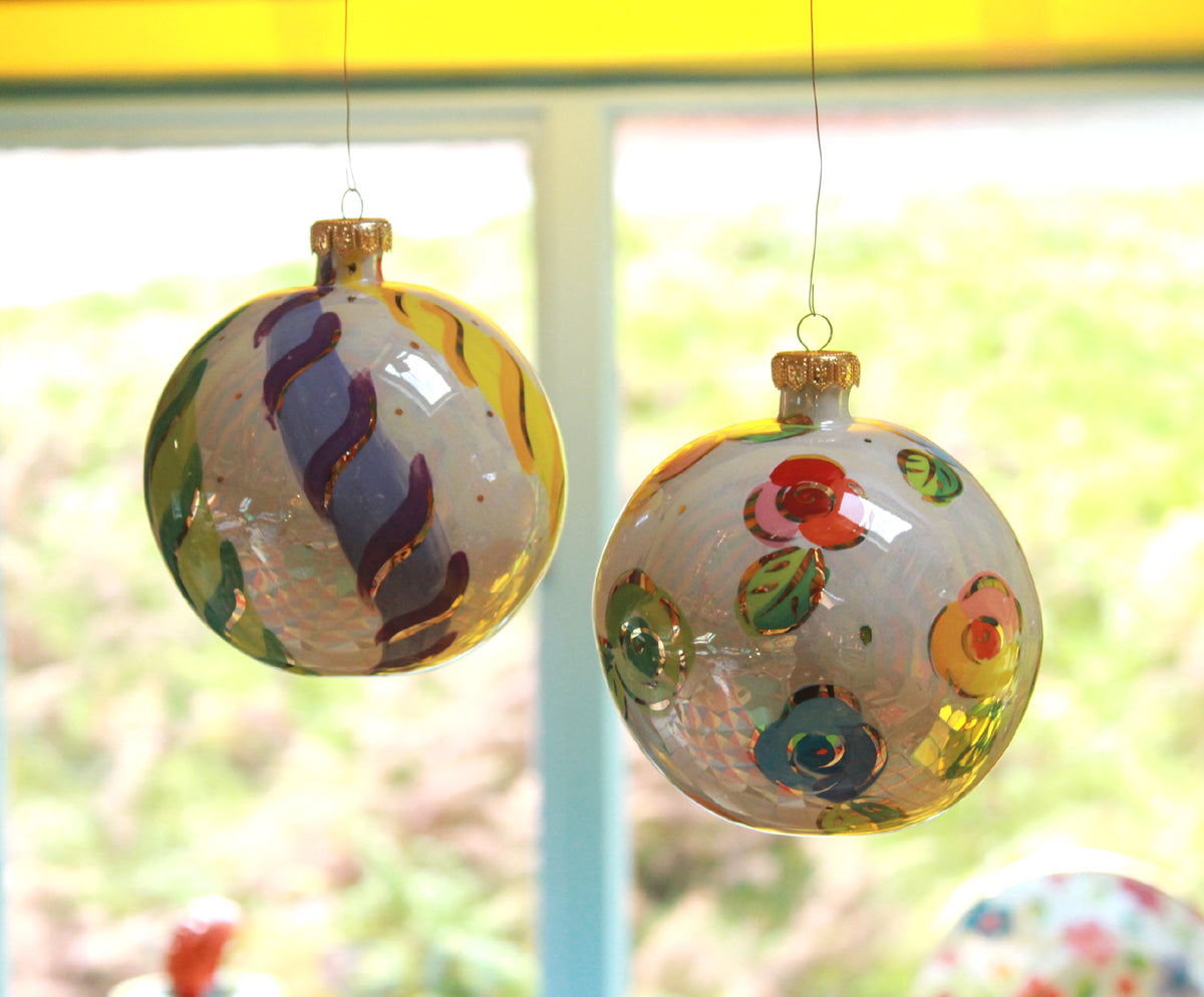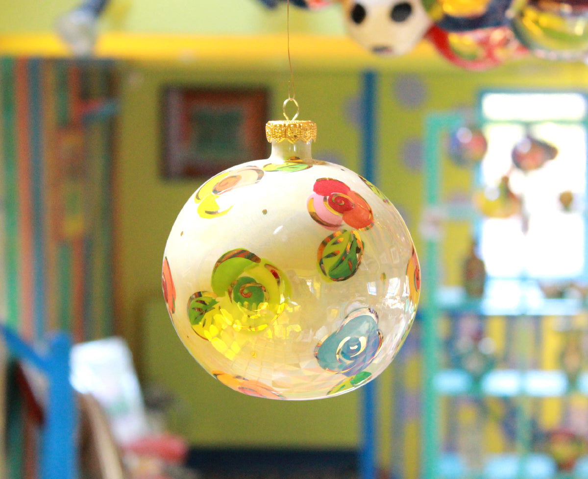 Mary Rose's Christmas Ornaments come in two sizes...this one is a beautiful example of the slightly larger version, measuring around 5 inches from top to bottom! The design is "Rosebud" on a shimmering mother of pearl background with accents of 24 carat gold throughout. The ornament will arrive complete with an "ornament cap", which will make it easy to hang it wherever you choose!