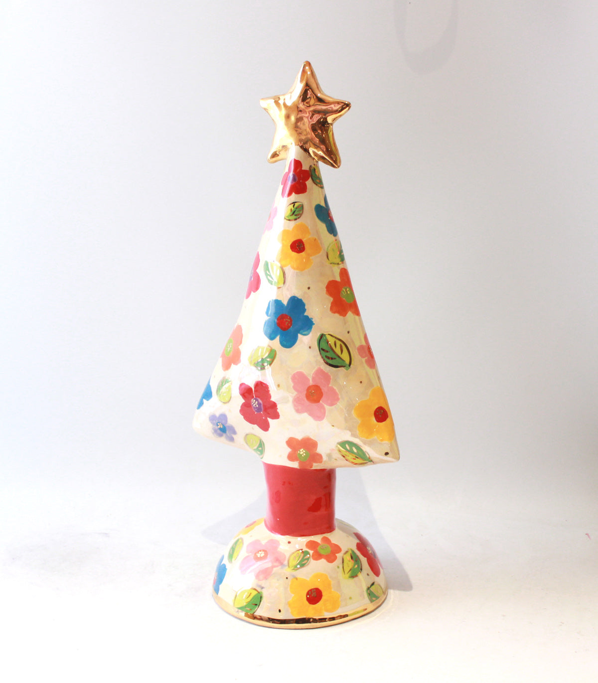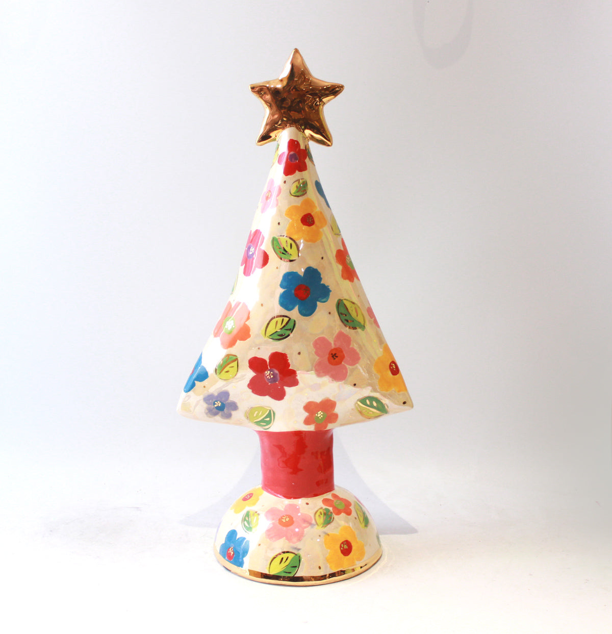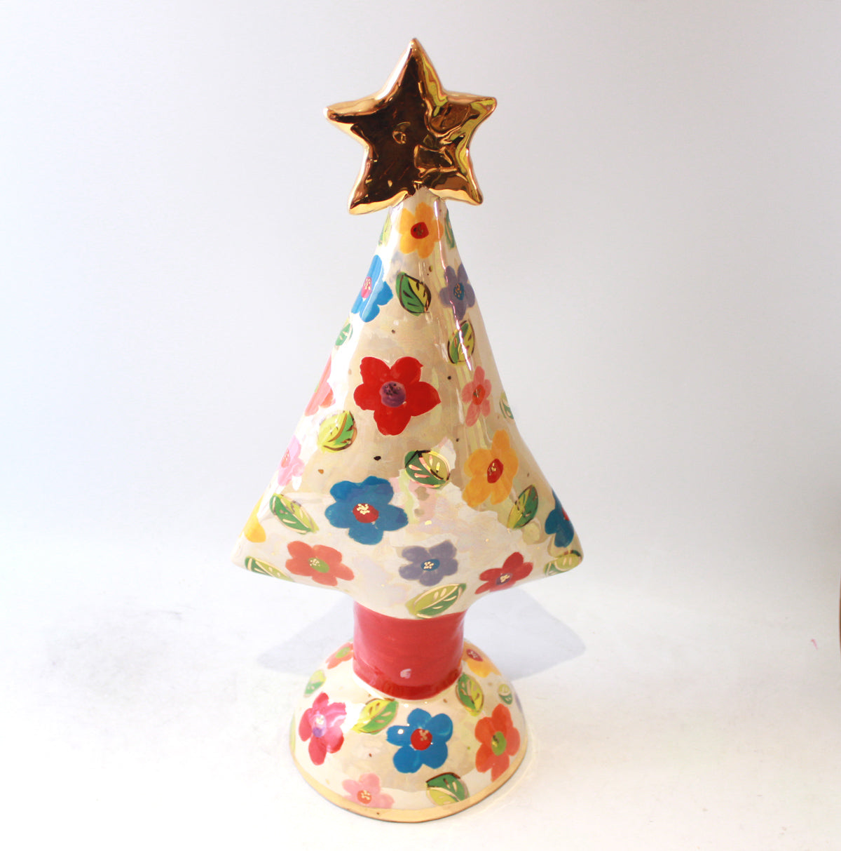 What better way to bring in the festivities than a Mary Rose Young Christmas Tree...? One of the largest made by Mary Rose, this one stands around 20 inches in height and is painted in the very eye-catching "Daisy" design, where colourful flowers and leaves are surrounded by a layer of shimmering iridescence...it is finished with accents of 24 carat gold, and a shining 24 carat gold star is placed lovingly at its peak!